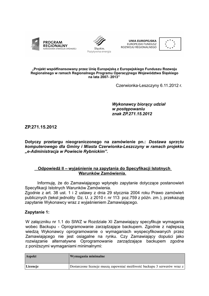 „Projekt współfinansowany przez Unię Europejską z Europejskiego Funduszu Rozwoju Regionalnego w ramach Regionalnego Programu Operacyjnego Województwa Śląskiego na lata 2007- 2013” Czerwionka-Leszczyny 6.11.2012 r. Wykonawcy biorący udział w postępowaniu znak ZP.271.15.2012 ZP.271.15.2012 Dotyczy przetargu nieograniczonego na zamówienie pn.: Dostawa sprzętu komputerowego dla Gminy i Miasta Czerwionka-Leszczyny w ramach projektu „e-Administracja w Powiecie Rybnickim”. Odpowiedź II – wyjaśnienie na zapytania do Specyfikacji Istotnych Warunków Zamówienia. Informuję, że do Zamawiającego wpłynęło zapytanie dotyczące postanowień Specyfikacji Istotnych Warunków Zamówienia. Zgodnie z art. 38 ust. 1 i 2 ustawy z dnia 29 stycznia 2004 roku Prawo zamówień publicznych (tekst jednolity Dz. U. z 2010 r. nr 113 poz.759 z późn. zm.), przekazuję zapytanie Wykonawcy wraz z wyjaśnieniem Zamawiającego. Zapytanie 1: W załączniku nr 1.1 do SIWZ w Rozdziale XI Zamawiający specyfikuje wymagania wobec Backupu - Oprogramowanie zarządzające backupem. Zgodnie z najlepszą wiedzą Wykonawcy oprogramowanie o wymaganiach wyspecyfikowanych przez Zamawiającego nie jest osiągalne na rynku. Czy Zamawiający dopuści jako rozwiązanie alternatywne Oprogramowanie zarządzające backupem zgodne z poniższymi wymaganiami minimalnymi: Aspekt Wymagania minimalne Licencje Dostarczone licencje muszą zapewniać możliwość backupu 3 serwerów wraz z bazami danych bez przerywania dostępności usług uruchomionych na tych serwerach Zapis danych Powinien posiadać możliwość równoczesnego zapisu/ odczytu na wielu napędach taśmowych w tym samym czasie Rozbudowa Powinien umożliwiać łatwą rozbudowę w miarę rozrastania się infrastruktury informatycznej Producent Brak preferowanego dostawcy hardware dla którego jest bogatsza funkcjonalność (macierze, biblioteki taśmowe...), musi istnieć możliwość zmiany producenta sprzętu bez utraty funkcjonalności backupu. Obsługa Powinien być łatwy w instalacji, konfigurowaniu i zarządzaniu poprzez interface graficzny (GUI). Powinien umożliwiać pełne dostosowanie do środowiska klienta. Monitoring Powinien posiadać zaawansowane funkcje monitoringu, generator raportów. Współpraca z sieciami i systemami Umożliwiać stosowanie go w środowisku Storage Area Network, zapewniając dużą szybkość wykonywanych backupów oraz współdzielenie napędów taśmowych pomiędzy serwery backupowe w sieci SAN Przechowywanie danych Powinien wykorzystywać bezobsługowe biblioteki taśmowe bądź lokalne dyski do przechowywania danych Backup baz danych Powinien umożliwiać backup online bazy danych (np. Oracle, Exchange, MS SQL) Bakup plików Powinien posiadać wbudowany mechanizm do backupowania otwartych plików Kopie migawkowe Powinien potrafić wykorzystywać do backupu mechanizm kopii migawkowych systemu Microsoft Windows 2003 (VSS) Disaster-recovery Powinien posiadać funkcję disaster-recovery dla systemu Windows umożliwiające proste i szybkie automatyczne odtworzenie serwera po awarii zapewniające integralność i spójność danych, opcja ta powinna być integralną częścią systemu backupowego. Automatyczny bakup Powinien posiadać funkcję automatycznego backupu z możliwością programowania dowolnych cykli, bazując na kalendarzu. Oprogramowanie powinno umożliwiać backup typu: full, Incremental, differentlal). Wykonywanie skryptów Powinien umożliwiać wykonywania skryptów przed i po backupie (np. uruchamianych przed backupem bazy oraz po wykonaniu backupu off-line bazy, kasowanie redo logów) Kompresja Powinien umożliwiać kompresję na kliencie backupowym przed wysłaniem danych przez sieć Pełne kopie Oprogramowanie powinno oferować funkcjonalność pozwalającą zminimalizować ilość koniecznych do wykonywania powtarzalnych pełnych kopii danych systemów plików. Monitorowanie System powinien mieć możliwość monitowania i alterowania poprzez email i SNMP Backup online Powinien posiadać możliwość backupu online danych z systemu SharePoint Portal Server, wraz z odtwarzaniem pojedynczych dokumentów z jednoprzebiegowego backupu. Integracja z innymi technologiami Musi umożliwiać integrację z technologią VCB (Vmware Consolidated Backup) w celu wydajnego backupu danych z możliwością odtwarzania pojedynczych plików (zawartych w VMDK dla systemów Windows), backup musi być wykonywany jednoprzebiegowo (cały plik VMDK backupowany jeden raz). Wirtualizacja Powinien wspierać najnowsze wersje środowisk Vmware vSphere 4.0/5.0 i wspierać backup za pomocą mechanizmu vstorage API dając te same możliwości jak z wykorzystaniem mechanizmu VCB. Powinien wspierać technologie wirtualizacyjne firmy Microsoft (Hyper-V), odtwarzanie pojedynczych plików z maszyn wirtualnych Windows z jednoprzebiegowego backupu. Wsparcie powinno uwzględniać najnowsze werscje oprogramowania Windows 2008 R2. Umozliwiać odtwarzanie pojedynczych elementów (maile, elementy AD, pliki czy bazy danych) z aplikacji Exchange, Active Directory, SharePoint i MS SQL zainstalowanych w środowiskach wirtualnych (Vmware, Hyper-V) poprzez backup całej maszyny wirtualnej. Centralne zarządzanie serwerami System musi mieć możliwość centralnego zarządzania serwerami (Media Serwerami) systemu backupowego. Backup online MS SQL Musi umożliwiać pełne wsparcie dla backupu on-line MS SQL 2008 Aplikacje Musi umożliwia tworzenie kopii zapasowych w trybie On-line (bez zatrzymywania silnika aplikacji) z aplikacji takich jak MS SQL, MS Exchange, Oracle, Sharepoint, IBM Lotus Domino Deduplikacja danych System musi osiadać jako opcję (komponent włączany, działający jako integralna część aplikacji backupowej) deduplikację danych. Funkcjonalność tego modułu powinna opierać się na blokowej deduplikacji danych wykonywanej on-line a więc w trakcie wykonywania zadania backupowego. Proces deduplikacji danych musi odbywać się na