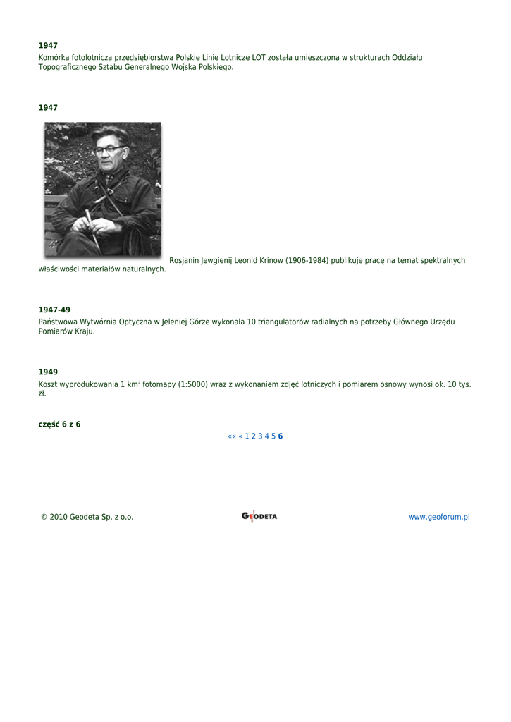 1947 Komórka fotolotnicza przedsiębiorstwa Polskie Linie Lotnicze LOT została umieszczona w strukturach Oddziału Topograficznego Sztabu Generalnego Wojska Polskiego. 1947 właściwości materiałów naturalnych. Rosjanin Jewgienij Leonid Krinow (1906-1984) publikuje pracę na temat spektralnych 1947-49 Państwowa Wytwórnia Optyczna w Jeleniej Górze wykonała 10 triangulatorów radialnych na potrzeby Głównego Urzędu Pomiarów Kraju. 1949 Koszt wyprodukowania 1 km2 fotomapy (1:5000) wraz z wykonaniem zdjęć lotniczych i pomiarem osnowy wynosi ok. 10 tys. zł. część 6 z 6 «« « 1 2 3 4 5 6 © 2010 Geodeta Sp. z o.o. www.geoforum.pl