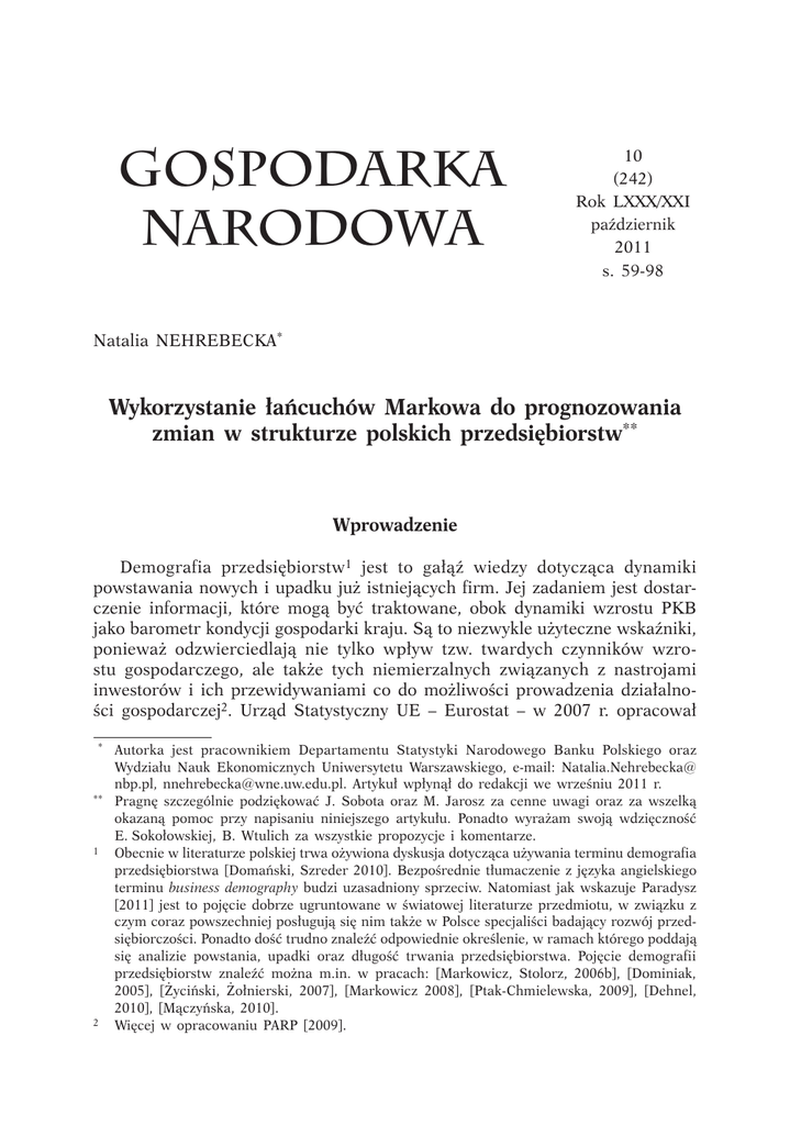 GOSPODARKA NARODOWA 10 (242) Rok LXXX/XXI październik 2011 s. 59-98 Natalia NEHREBECKA* Wykorzystanie łańcuchów Markowa do prognozowania zmian w strukturze polskich przedsiębiorstw** Wprowadzenie Demografia przedsiębiorstw jest to gałąź wiedzy dotycząca dynamiki powstawania nowych i upadku już istniejących firm. Jej zadaniem jest dostarczenie informacji, które mogą być traktowane, obok dynamiki wzrostu PKB jako barometr kondycji gospodarki kraju. Są to niezwykle użyteczne wskaźniki, ponieważ odzwierciedlają nie tylko wpływ tzw. twardych czynników wzrostu gospodarczego, ale także tych niemierzalnych związanych z nastrojami inwestorów i ich przewidywaniami co do możliwości prowadzenia działalności gospodarczej. Urząd Statystyczny UE – Eurostat – w 2007 r. opracował * Autorka jest pracownikiem Departamentu Statystyki Narodowego Banku Polskiego oraz Wydziału Nauk Ekonomicznych Uniwersytetu Warszawskiego, e-mail: Natalia.Nehrebecka@ nbp.pl, [email protected]. Artykuł wpłynął do redakcji we wrześniu 2011 r. ** Pragnę szczególnie podziękować J. Sobota oraz M. Jarosz za cenne uwagi oraz za wszelką okazaną pomoc przy napisaniu niniejszego artykułu. Ponadto wyrażam swoją wdzięczność E. Sokołowskiej, B. Wtulich za wszystkie propozycje i komentarze. Obecnie w literaturze polskiej trwa ożywiona dyskusja dotycząca używania terminu demografia przedsiębiorstwa [Domański, Szreder 2010]. Bezpośrednie tłumaczenie z języka angielskiego terminu business demography budzi uzasadniony sprzeciw. Natomiast jak wskazuje Paradysz [2011] jest to pojęcie dobrze ugruntowane w światowej literaturze przedmiotu, w związku z czym coraz powszechniej posługują się nim także w Polsce specjaliści badający rozwój przedsiębiorczości. Ponadto dość trudno znaleźć odpowiednie określenie, w ramach którego poddają się analizie powstania, upadki oraz długość trwania przedsiębiorstwa. Pojęcie demografii przedsiębiorstw znaleźć można m.in. w pracach: [Markowicz, Stolorz, 2006b], [Dominiak, 2005], [Życiński, Żołnierski, 2007], [Markowicz 2008], [Ptak-Chmielewska, 2009], [Dehnel, 2010], [Mączyńska, 2010]. Więcej w opracowaniu PARP [2009]. 60 GOSPODARKA NARODOWA Nr 10/2011 wspólne zasady i metodologię takich badań (Eurostat/OECD Manual on Business Demography Statistics) jako jeden z elementów strukturalnej statystyki przedsiębiorstw. W związku z potrzebą wskazania na możliwe źródła danych i doprecyzowania możliwości wykorzystania rejestrów powstał drugi manual z 2010 roku Business register. Recommendatoins manual. Demografia przedsiębiorstw jest również przedmiotem zainteresowania banków centralnych w Europie. Przykładowo Narodowy Bank Belgii na swojej stronie internetowej publikuje kompletne zestawienia dotyczące dynamiki przedsiębiorstw w postaci macierzy przejść między sektorami. Analiza procesów migracji przedsiębiorstw między gałęziami pozwala na znalezienie zależności pomiędzy cechami wewnętrznymi (wiek i wielkość przedsiębiorstwa, kierunek sprzedaży), czynnikami zewnętrznymi (siła robocza, polityka gospodarcza państwa), i zmianami sektora/sekcji przez przedsiębiorstwo. Oczywiste jest, iż firmy wchodzące na rynek charakteryzują się innymi cechami niż te, które z niego wychodzą. Firmy, które zmieniają sekcje/sektory, prawdopodobnie osiągają mniejsze zyski od tych, które pozostają w jednym sektorze, ale są w znacznie lepszej sytuacji niż przedsiębiorstwa, które dopiero co powstały. Większość badań empirycznych koncentruje się na badaniu różnic w stopie wejścia i wyjścia, wykorzystując dane, takie jak Global Entrepreneurship Monitor [Acs i in., 2008], baza danych AMADEUS firmy Bureau van Dijk [Hoffman, Junge, 2006] oraz dane Banku Światowego World Bank Entrepreneurship Survey – WBGES [Klapper i in., 2008], [Klapper i in., 2009] lub dane powstałe przez połączenie wcześniej wymienionych zbiorów (wsp. [Ahn, 2001], [Scarpetta i in., 2002], [Baterlsman i in., 2005]). Większość prac empirycznych analizuje tylko sektor przemysłowy. Niewiele jest badań dotyczących działalności gospodarczej, które obejmowałyby jednocześnie kilka sektorów, regionów bądź krajów. W szerszym zakresie badana była dynamika przedsiębiorstw portugalskich – najczęściej z wykorzystaniem danych pochodzących z bazy danych Quadros de Pessoal [Mata, 1993], [Mata, Portugal, 1994], [Mata i in., 1995], [Mata, Machado, 1996], [Görg i in., 2000], [Cabral, Mata, 2003], [Baptista, Carias, 2007], [Baptista, Mendonça, 2007], [Cabral, 2007], [Baptista i in., 2008]. Pojawia się coraz więcej publikacji o charakterze makroekonomicznym, dotyczących endogeniczności stopy wejścia i wyjścia firm wobec fluktuacji cyklu koniunkturalnego. Zagadnienie to jest ważne z kilku powodów. Po pierwsze, stopa wejścia firm jest procykliczna, natomiast stopa wyjścia jest antycykliczna i wyprzedza zmiany trendu PKB [Bilbiie, Ghironi, Melitz, 2007]. Po drugie, zwiększona stopa wejścia może oddziałowywać na poziomie zagregowanego produktu wzmacniając występujące w gospodarce szoki. Berentsen, Waller [2010] analizują model DSGE z endogeniczną stopą wejścia i wskazują na sytuację występowania efektu zewnętrznego zwiększonej stopy wejścia firm na rynek. Jednocześnie wejścia na rynek dużej liczby firm zmienia bowiem w istotny sposób warunki prowadzenia działalności, co poprzez funkcję kosztów produkcji wpływa na zagregowany produkt w sposób trudny do przewidzenia zarówno przez przedsiębiorców, jak i decydentów. Jak wskazuje Bergin, Corsetti Natalia Nehrebecka, Wykorzystanie łańcuchów Markowa do prognozowania zmian... 61 [2008], polityka monetarna ma istotny i niedoceniany wpływ na dostosowania o charakterze ilościowym w sektorze przedsiębiorstw. Według Boguszewskiego [2002] do ważniejszych czynników modulujących lub katalizujących transmisję impulsów monetarnych