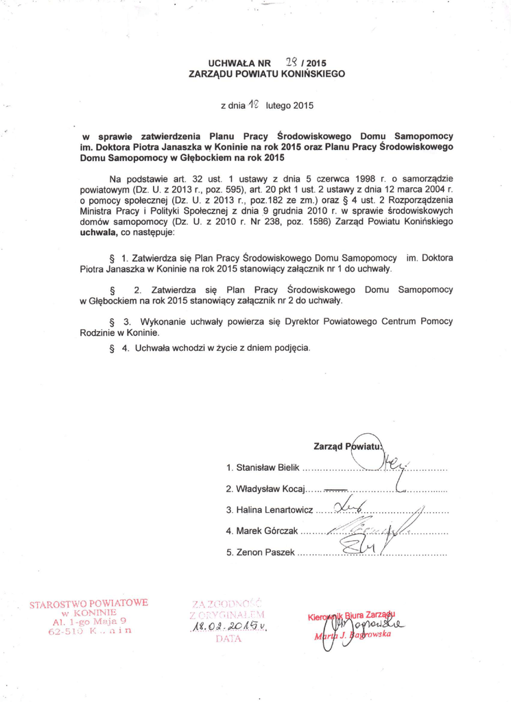 UCHWAŁA NR 2?/2015 ZARZĄDU POWIATU KONIŃSKIEGO z dnia '12 lutego 2015 w sprawie zatwierdzenia Planu Pracy Środowiskowego Domu Samopomocy Im. Doktora Piotra Janaszka w Koninie na rok 2015 oraz Planu Pracy Środowiskowego Domu Samopomocy w Głębocklem na rok 2015 Na podstawie art. 32 ust. 1 ustawy z dnia 5 czenwca 1998 r. o samorządzie powiatowym (Dz. U. z 2013 r., poz. 595), arl. 20 pkt 1 ust. 2 ustawy z dnia 12 marca 2004 r. o pomocy społecznej (Dz. U. z 2013 r., poz.182 ze zm.) oraz § 4 ust. 2 Rozporządzenia Ministra Pracy i Polityki Społecznej z dnia 9 grudnia 2010 r. w sprawie środowiskowych domów samopomocy (Dz. U. z 2010 r. Nr 238, poz. 1586) Zarząd Powiatu Konińskiego uchwala, co następuje: § 1. Zatwierdza się Plan Pracy Środowiskowego Domu Samopomocy Piotra Janaszka w Koninie na rok 2015 stanowiący załącznik nr 1 do uchwały. § 2. Zatwierdza się Plan Pracy Środowiskowego w Głębockiem na rok 2015 stanowiący załącznik nr 2 do uchwały. Domu im. Doktora Samopomocy § 3. Wykonanie uchwały powierza się Dyrektor Powiatowego Centrum Pomocy Rodzinie w Koninie. § 4. Uchwała wchodzi w życie z dniem podjęcia. 1. Stanisław Bielik 2. Władysław Kocaj 3. Halina Lenartowicż 4. Marek Górczak 5. Zenon Paszek STAROSTWO POWIATOWE w KONINIE Al. ] - g o M a j a 9 62-510 K a i n DATA