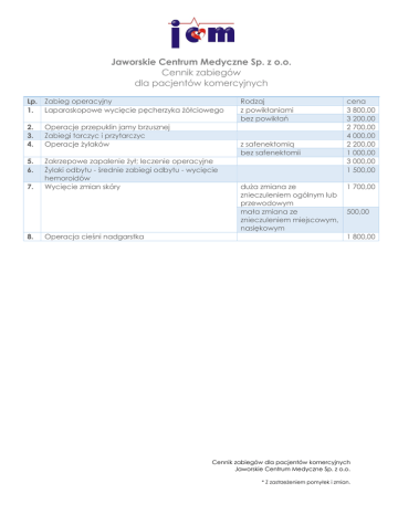Jaworskie Centrum Medyczne Sp. z o.o. Cennik zabiegów dla pacjentów komercyjnych Lp. Zabieg operacyjny 1. Laparoskopowe wycięcie pęcherzyka żółciowego 2. 3. 4. Operacje przepuklin jamy brzusznej Zabiegi tarczyc i przytarczyc Operacje żylaków 5. 6. Zakrzepowe zapalenie żył; leczenie operacyjne Żylaki odbytu - średnie zabiegi odbytu - wycięcie hemoroidów Wycięcie zmian skóry 7. 8. Operacja cieśni nadgarstka Rodzaj z powikłaniami bez powikłań z safenektomią bez safenektomii duża zmiana ze znieczuleniem ogólnym lub przewodowym mała zmiana ze znieczuleniem miejscowym, nasiękowym cena 3 800,00 3 200,00 2 700,00 4 000,00 2 200,00 1 000,00 3 000,00 1 500,00 1 700,00 500,00 1 800,00 Cennik zabiegów dla pacjentów komercyjnych Jaworskie Centrum Medyczne Sp. z o.o. * Z zastrzeżeniem pomyłek i zmian.