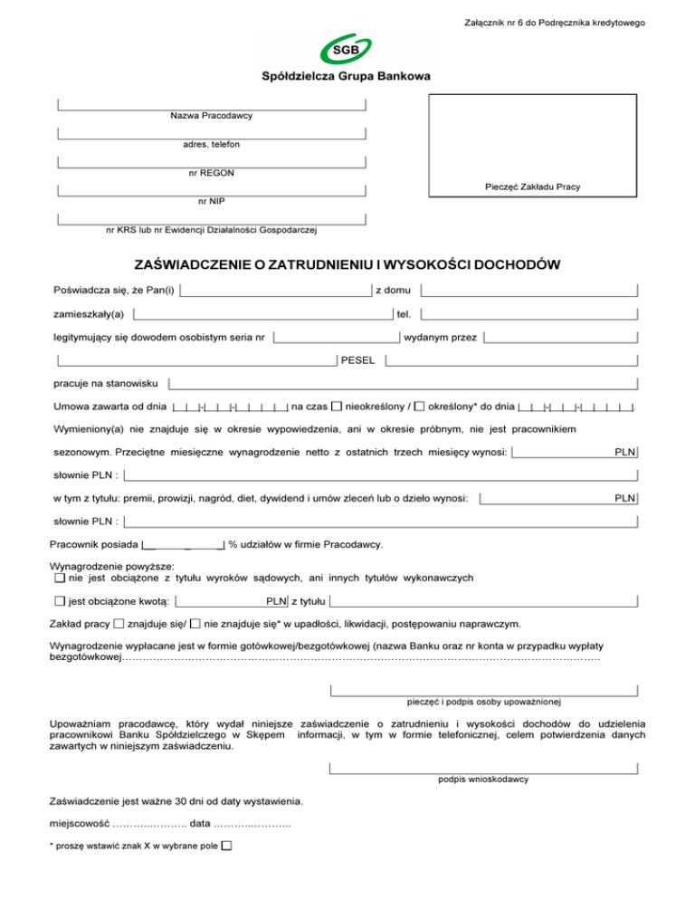 Załącznik nr 6 do Podręcznika kredytowego Nazwa Pracodawcy adres, telefon nr REGON Pieczęć Zakładu Pracy nr NIP nr KRS lub nr Ewidencji Działalności Gospodarczej ZAŚWIADCZENIE O ZATRUDNIENIU I WYSOKOŚCI DOCHODÓW Poświadcza się, że Pan(i) z domu zamieszkały(a) tel. legitymujący się dowodem osobistym seria nr wydanym przez PESEL pracuje na stanowisku Umowa zawarta od dnia | | |-| | |-| | | | | na czas nieokreślony / określony* do dnia | | |-| | |-| | | | |. Wymieniony(a) nie znajduje się w okresie wypowiedzenia, ani w okresie próbnym, nie jest pracownikiem sezonowym. Przeciętne miesięczne wynagrodzenie netto z ostatnich trzech miesięcy wynosi: PLN słownie PLN : w tym z tytułu: premii, prowizji, nagród, diet, dywidend i umów zleceń lub o dzieło wynosi: PLN słownie PLN : Pracownik posiada |__ _ _| % udziałów w firmie Pracodawcy. Wynagrodzenie powyższe: nie jest obciążone z tytułu wyroków sądowych, ani innych tytułów wykonawczych jest obciążone kwotą: Zakład pracy znajduje się/ PLN z tytułu nie znajduje się* w upadłości, likwidacji, postępowaniu naprawczym. Wynagrodzenie wypłacane jest w formie gotówkowej/bezgotówkowej (nazwa Banku oraz nr konta w przypadku wypłaty bezgotówkowej……………………………………………………………………………………………………………………….. pieczęć i podpis osoby upoważnionej Upoważniam pracodawcę, który wydał niniejsze zaświadczenie o zatrudnieniu i wysokości dochodów do udzielenia pracownikowi Banku Spółdzielczego w Skępem informacji, w tym w formie telefonicznej, celem potwierdzenia danych zawartych w niniejszym zaświadczeniu. podpis wnioskodawcy Zaświadczenie jest ważne 30 dni od daty wystawienia. miejscowość ………..……….. data ………..………... * proszę wstawić znak X w wybrane pole