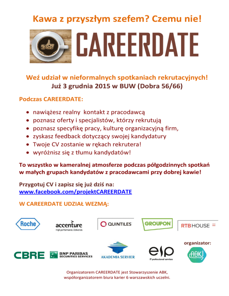 Kawa z przyszłym szefem? Czemu nie! Weź udział w nieformalnych spotkaniach rekrutacyjnych! Już 3 grudnia 2015 w BUW (Dobra 56/66) Podczas CAREERDATE:       nawiążesz realny kontakt z pracodawcą poznasz oferty i specjalistów, którzy rekrutują poznasz specyfikę pracy, kulturę organizacyjną firm, zyskasz feedback dotyczący swojej kandydatury Twoje CV zostanie w rękach rekrutera! wyróżnisz się z tłumu kandydatów! To wszystko w kameralnej atmosferze podczas półgodzinnych spotkao w małych grupach kandydatów z pracodawcami przy dobrej kawie! Przygotuj CV i zapisz się już dziś na: www.facebook.com/projektCAREERDATE W CAREERDATE UDZIAŁ WEZMĄ: organizator: Organizatorem CAREERDATE jest Stowarzyszenie ABK, współorganizatorem biura karier 6 warszawskich uczelni.