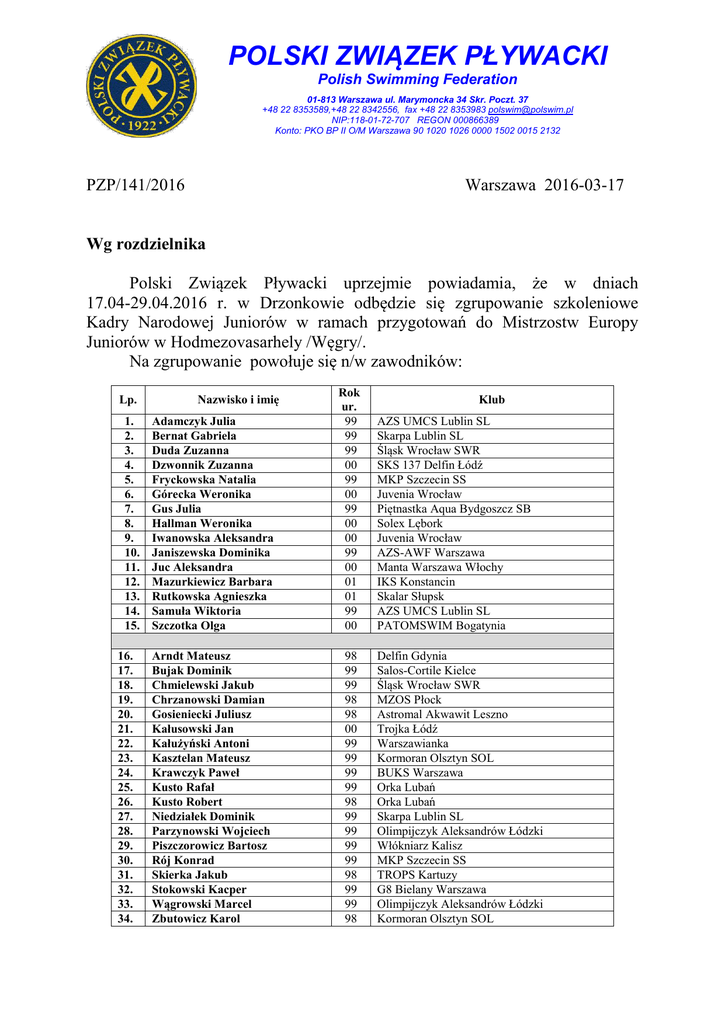 POLSKI ZWIĄZEK PŁYWACKI Polish Swimming Federation 01-813 Warszawa ul. Marymoncka 34 Skr. Poczt. 37 +48 22 8353589,+48 22 8342556, fax +48 22 8353983 [email protected] NIP:118-01-72-707 REGON 000866389 Konto: PKO BP II O/M Warszawa 90 1020 1026 0000 1502 0015 2132 PZP/141/2016 Warszawa 2016-03-17 Wg rozdzielnika Polski Związek Pływacki uprzejmie powiadamia, że w dniach 17.04-29.04.2016 r. w Drzonkowie odbędzie się zgrupowanie szkoleniowe Kadry Narodowej Juniorów w ramach przygotowań do Mistrzostw Europy Juniorów w Hodmezovasarhely /Węgry/. Na zgrupowanie powołuje się n/w zawodników: Lp. 1. 2. 3. 4. 5. 6. 7. 8. 9. 10. 11. 12. 13. 14. 15. 16. 17. 18. 19. 20. 21. 22. 23. 24. 25. 26. 27. 28. 29. 30. 31. 32. 33. 34. Adamczyk Julia Bernat Gabriela Duda Zuzanna Dzwonnik Zuzanna Fryckowska Natalia Górecka Weronika Gus Julia Hallman Weronika Iwanowska Aleksandra Janiszewska Dominika Juc Aleksandra Mazurkiewicz Barbara Rutkowska Agnieszka Samuła Wiktoria Szczotka Olga Rok ur. 99 99 99 00 99 00 99 00 00 99 00 01 01 99 00 Arndt Mateusz Bujak Dominik Chmielewski Jakub Chrzanowski Damian Gosieniecki Juliusz Kałusowski Jan Kałużyński Antoni Kasztelan Mateusz Krawczyk Paweł Kusto Rafał Kusto Robert Niedziałek Dominik Parzynowski Wojciech Piszczorowicz Bartosz Rój Konrad Skierka Jakub Stokowski Kacper Wągrowski Marcel Zbutowicz Karol 98 99 99 98 98 00 99 99 99 99 98 99 99 99 99 98 99 99 98 Nazwisko i imię Klub AZS UMCS Lublin SL Skarpa Lublin SL Śląsk Wrocław SWR SKS 137 Delfin Łódź MKP Szczecin SS Juvenia Wrocław Piętnastka Aqua Bydgoszcz SB Solex Lębork Juvenia Wrocław AZS-AWF Warszawa Manta Warszawa Włochy IKS Konstancin Skalar Słupsk AZS UMCS Lublin SL PATOMSWIM Bogatynia Delfin Gdynia Salos-Cortile Kielce Śląsk Wrocław SWR MZOS Płock Astromal Akwawit Leszno Trojka Łódź Warszawianka Kormoran Olsztyn SOL BUKS Warszawa Orka Lubań Orka Lubań Skarpa Lublin SL Olimpijczyk Aleksandrów Łódzki Włókniarz Kalisz MKP Szczecin SS TROPS Kartuzy G8 Bielany Warszawa Olimpijczyk Aleksandrów Łódzki Kormoran Olsztyn SOL Prosimy także o oddelegowanie trenerów: 1. 2. 3. 4. 5. 6. 7. 8. 9. Woźnicki Piotr Czoków Przemysław Grabysa Tomasz Zalewski Arkadiusz Musiał Adam Wołkow Paweł Karpiński Jakub Łozowski Tomasz PZP Delfin Gdynia SMS Olsztyn TROPS Kartuzy Orka Lubań G8 Bielany Warszawa AZS-AWF Katowice PZP Trener koordynator Trener Trener Trener Trener Trener Trener ląd Fizjoterapeuta Fizjoterapeuta Zawodnicy proszeni są o przyjazd na zgrupowanie w dniu 17.04.2016 do godz. 19.00 /od kolacji/ . Pierwszy trening odbędzie się w poniedziałek 18.04.2016 na pływalni w Drzonkowie. Zawodnicy proszeni są o zabranie pełnego sprzętu do treningu pływackiego: - deski, płetwy, łapki, pasy oporowe, opaski na kostki, rurki oraz do zajęć na lądzie (na sali i w terenie): - koszulki spodenki, buty sportowe, taśmy elastyczne Theraband oraz licencji sportowej wraz z ważnymi badaniami lekarskimi. Zgrupowanie w Drzonkowie zakończy się po rannym treningu w piątek 29.04.2016 r. około godziny 11.00 Po obiedzie 29.04.2016 zostanie zorganizowany transport na zawody GP Puchar Polski w Szczecinie na koszt PZP. Udział w zawodach odbędzie się na koszt klubów/szkół macierzystych. Dla zawodników biorących udział w GP w Opolu w dniach 16-17.04.2016 zostanie zorganizowany transport do Drzonkowa w dniu 17.04.2016 roku na koszt PZP. Trenerzy powołanych zawodników proszeni są o przesłanie do trenera Piotra Woźnickiego na adres mailowy [email protected] : - potwierdzenia udziału z zgrupowaniu do dnia 23.03.2016 - zgłoszenia potrzeby przejazdu z zawodów z Opola lub na zawody do Szczecina /do dnia 23.03.2016/ - arkusza obciążeń treningowych za okres treningowy 01.09.2015 – 10.04.2016 do dnia 10.04.2016 - wyników testów mleczanowych w wodzie (jeżeli były zrobione w terminie od 01.01.2016). Zawodnicy niepełnoletni muszą posiadać pisemne zgody rodziców/opiekunów prawnych na wyjazd, a ci którzy nie będą odbierani przez swoich rodziców/opiekunów prawnych ponadto muszą posiadać pisemne upoważnienia rodziców/opiekunów prawnych do odbioru przez wskazane osoby trzecie. Kosztów przejazdu do Drzonkowa /z wyjątkiem przejazdu z GP w Opolu/ oraz powrót do miejsc zamieszkania nie pokrywa PZP. Pozostałe koszty pokrywa PZP. PREZES Andrzej Kowalski Otrzymują: 1. Zainteresowane Kluby/SMS 2. a/a Kryteria powołania na zgrupowanie: 1. Finaliści IE Baku 2016 /rocznik 1998 chłopcy,1999 dziewczyny/ 2. Finaliści EYOF Tbilisi 2016 3. Zawodnicy, którzy w sezonie letnim w roku 2015 osiągnęli wynik lepszy od 16 wyniku z IE w Baku na dystansach olimpijskich /pod warunkiem że w sezonie zimowym 2015/2016 osiągnęli wynik na poziomie 16 rezultatu z IE Baku przeliczony według wartości punktów FINA na pływalnie 25-cio metrową/. W przypadku 800 dowolnym dziewcząt pod uwagę brany był 14 wynik/. 4. Zawodnicy, którzy w sezonie zimowym 2015/2016 osiągnęli wynik lepszy od 12 wyniku z IE w Baku na dystansach olimpijskich /wynik przeliczony według wartości punktów FINA na pływalnię 25-cio metrową/. 5. Maksymalnie 4 zawodników w 1 konkurencji według rankingu www.swimrankings.net /pływalnia 25-cio metrowa na dzień 16.03.2016/.