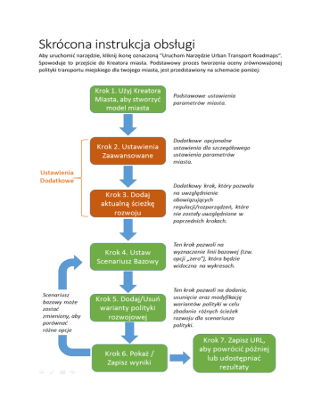Skrócona instrukcja obsługi Aby uruchomić narzędzie, kliknij ikonę oznaczoną "Uruchom Narzędzie Urban Transport Roadmaps“. Spowoduje to przejście do Kreatora miasta. Podstawowy proces tworzenia oceny zrównoważonej polityki transportu miejskiego dla twojego miasta, jest przedstawiony na schemacie poniżej: Krok 1. Kreator Miasta: Typ Miasta Kreator Miasta pozwala szybko zbudować profil twojego miasta. Proces zaczyna się od podstawowych informacji, takich jak położenie miasta (w jakim kraju się znajduje), typu miasta pod względem jego wielkości, populacji i układu. Wymagane są również niektóre szczegółowe informacje. Ukończ pierwszy krok wypełniając wszystkie sekcje, pomocnym może okazać się samouczek, znajdujący się po prawej stronie, który pozwala na udoskonalenie informacji wejściowych w poszczególnych sekcjach. Pamiętaj, że te informacje nie mogą być edytowane, więc warto je sprawdzić przed kontynuacją. Gdy wszystkie sekcje są kompletne wybierz okno “2. Charakterystyka Miasta ". Charakterystyka Miasta Okno ‘Charakterystyka Miasta’ pozwala na dalsze wyszczególnienie, które należy zastosować dla modelu miasta. Podążaj tym samym schematem użytym w oknie ‘Typ Miasta’. Gdy wszystkie pola są kompletne wybierz przycisk "Koniec" na dole strony. Spowoduje to uruchomienie narzędzia, wyświetli się kilka kart graficznych w celu dalszego dostosowania narzędzia. Krok 2. Ustawienia Zaawansowane (Opcjonalnie) Konfiguracja miasta została zakończona poprzez użycie Kreatora Miasta, teraz możliwe jest stworzenie scenariusza polityki, z wykorzystaniem cech miasta i jego mieszkańców oraz określonej ścieżki rozwoju, które wywierają określony wpływ na usługi transportowe. Jednak przed dodaniem jakiegokolwiek wariantu polityki rozwojowej warto rozważyć dalsze uszczegółowienie obecnych cech miasta. Można to zrobić wybierając zakładkę "USTAWIENIA ZAAWANSOWANE”. Możliwe jest tutaj dostosowanie różnych cech oraz średnich wartości bazowych, które będą udoskonaloną podstawą do obliczeń dla scenariusza bazowego polityki. Ten krok jest opcjonalny i wymaga szczegółowych informacji na temat miasta i jego systemu transportowego. Zakładki tego okna pozwalają na wprowadzenie najodpowiedniejszych ustawień dla miasta. Użyj ikony "i", aby uzyskać dostęp do porad samouczka dla każdego ustawienia. W przeciwieństwie do Konfiguracji Miasta w kroku 1, jeśli okaże się, że jedno z tych ustawień jest błędne to można wprowadzić korektę w każdej chwili. Krok 3. Dodanie Istniejącej Ścieżki Rozwoju (Opcjonalnie) Miasto jest teraz gotowe do uwzględnienia aktualnie obowiązujących różnych strategii i zarządzeń stosowanych do poprawy wielu potencjalnych celów. Na tym etapie warto zastanowić się, czy poszczególne strategie i zarządzenia zostały już wdrożone w tym mieście. Niektóre z nich mogą być uwzględnione w zaawansowanych ustawieniach powyżej. Na tym etapie można dodać istniejące rozporządzenia przed ustawieniem punktu odniesienia względem, którego użytkownik będzie mógł ocenić wpływ nowych działań strategicznych. Ten etap jest opcjonalny i jest prowadzony w dokładnie taki sam sposób, jak dodawanie kolejnych wariantów polityki rozwojowej, które opisano poniżej w kroku 5. Krok 4. Ustawienie Scenariusza Bazowego (tzw. opcji ”zero”) Teraz, gdy parametry dla miasta są już ustalone, możliwe jest ustawienie linii bazowej, czyli punktu odniesienia, przy użyciu przycisku "Ustaw Scenariusz Bazowy", który znajduje się w lewym dolnym rogu. W ten sposób zostanie zapisany zestaw wyników dla opcji „zero”. Po wykonaniu tego kroku nowy zestaw wyników symulacji, wynikający z dodawania nowych wariantów polityki rozwojowej bądź modyfikowania istniejących wariantów, będzie porównywany w stosunku to ustalonej linii bazowej. Scenariusz bazowy będzie widoczny na wszystkich wykresach, jako stały zestaw wyników. Scenariusz bazowy może zostać zmieniony w dowolnym czasie. Krok 5. Dodaj lub Dostosuj Warianty Polityki Rozwojowej Jesteś teraz gotowy do badania wpływu nowych wariantów i ścieżek rozwojowych w twoim mieście. Klikając na przycisk "DODAJ WARIANT POLITYKI ROZWOJOWEJ" pojawi się szereg opcji dotyczących działań zaradczych. Warianty polityki rozwojowej są podzielone na 5 grup, które odzwierciedlają ich główne rodzaje. Klikając na ikonę "i", która znajduje się obok każdego wariantu polityki, można uzyskać informacje na temat każdego z nich. Możesz wybrać pojedyńczy wariant lub całą grupę. Można również wybrać zestawy wariantów rozwojowych, które zostały konkretnie zdefiniowane do realizowania określonego celu np. do zmniejszenia zatłoczenia. W tym celu użyj zestawu wariantów po prawej stronie okna. W ten sposób odpowiednie środki zaradcze zostaną automatycznie dostosowane i wybrane do realizacji wybranego celu. Po wybraniu określonych wariantów polityki kliknij "X" w prawym górnym rogu, a ścieżki rozwojowe zostaną automatycznie dodane do scenariusza symulacyjnego. Można dodać lub usunąć warianty polityki w dowolnym momencie, klikając przycisk "Dodaj wariant polityki rozwojowej”, a następnie "X", aby zatwierdzić. Następnie, wybrane warianty polityki zostaną wyświetlone po lewej stronie pod napisem ‘Konfiguracja Miasta’. Można analizować każdy środek zaradczy z osobna i dostosować parametry dla poszczególnych działań. Klikając na ikonę "i" wyświetli się pomoc samouczka. Jeśli nie jesteś pewien, jakie wartości wprowadzić, program automatycznie wypełni je za Ciebie. W przeciwnym razie można spróbować dostosować je samemu, co pozwoli uwidocznić wpływ środka zaradczego na model miasta. Krok 6. Zapisz Rezultaty Okno z Wynikami symulacji umożliwia natychmiastowe wyświetlenie wskaźników w formie wykresów. Istnieją trzy grupy wykresów, które obejmują wskaźniki oddziaływania na 
