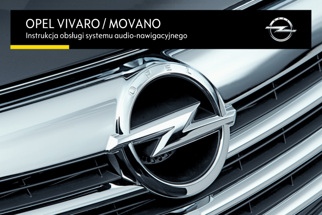OPEL VIVARO / MOVANO Instrukcja obsługi systemu audio-nawigacyjnego Spis treści Wprowadzenie ............................... 4 Radioodtwarzacz ......................... 52 Odtwarzacz CD ............................ 62 Wejście AUX ................................ 66 Gniazdo USB ............................... 69 Odtwarzanie muzyki przez łącze Bluetooth ...................................... 73 Urządzenia zewnętrzne ............... 80 Nawigacja .................................... 82 Rozpoznawanie mowy ............... 115 Telefon ....................................... 119 Indeks ........................................ 138 4 Wprowadzenie Wprowadzenie Informacje ogólne .......................... 4 Przegląd elementów sterujących ..................................... 7 Zabezpieczenie przed kradzieżą ..................................... 31 Obsługa ....................................... 33 Ustawienia barwy dźwięku ........... 44 Ustawienia poziomu głośności .... 45 Ustawienia systemu ..................... 46 Informacje ogólne System Infotainment oferuje najnowocześniejsze rozwiązania w dziedzinie wyposażenia zapewniającego informacje i rozrywkę. Radioodbiornik jest wyposażony w programowalne przyciski pamięci stacji radiowych dla zakresów FM, AM, a także DAB (w zależności od wersji). Odtwarzacz audio umożliwia odtwarzanie płyt CD Audio, CD MP3, a także płyt CD WMA (w zależności od wersji). Dodatkowo do systemu Infotainment można podłączać zewnętrzne urządzenia pamięci masowej, np. iPod, odtwarzacz MP3 lub kartę pamięci USB, bądź też przenośny odtwarzacz. Zewnętrzne urządzenia audio można podłączać również za pomocą łącza Bluetooth. Cyfrowy procesor dźwięku posiada kilka zaprogramowanych ustawień korektora, które zapewniają optymalizację sygnału audio. System nawigacyjny z dynamicznym planowaniem trasy niezawodnie prowadzi do celu, omijając korki oraz inne zakłócenia ruchu drogowego. System Infotainment można też obsługiwać przy pomocy elementów sterujących na kierownicy lub systemu rozpoznawania mowy. System Infotainment może być dodatkowo wyposażony w system głośnomówiący. Dobrze zaprojektowane elementy sterujące i czytelne ekrany umożliwiają łatwą i intuicyjną obsługę systemu. Uwaga Niniejsza instrukcja obsługi zawiera opis wszystkich opcji i funkcji udostępnianych przez różne systemy Infotainment. Niektóre opisy, w tym dotyczące wyświetlacza i funkcji menu, mogą nie dotyczyć posiadanego pojazdu ze względu na różnice pomiędzy poszczególnymi wariantami modelu, specyfikacje modelu dla danego kraju, zainstalowane wyposażenie dodatkowe lub akcesoria. Wprowadzenie Ważne informacje dotyczące obsługi i bezpieczeństwa ruchu drogowego 9 Ostrzeżenie Podczas korzystania z systemu Infotainment należy zawsze bezpiecznie prowadzić pojazd. W razie wątpliwości przed użyciem systemu Infotainment należy zatrzymać pojazd. W przypadku słabego odbioru sygnału radiowego głośność jest automatycznie obniżana, aby zminimalizować wpływ zakłóceń na prowadzenie pojazdu. ● Korzystanie z instrukcji obsługi ● ● Odbiór programów radiowych W następujących sytuacjach możliwe są trzaski, szumy, zakłócenia, a nawet całkowity zanik odbioru: ● zmieniająca się odległość od nadajnika ● nakładanie się sygnałów wskutek odbić ● gdy na drodze fal radiowych znajdują się różnego rodzaju przeszkody ● W niniejszym podręczniku opisano elementy, w które może, lecz nie musi być wyposażony dany pojazd, ponieważ należą one do wyposażenia opcjonalnego lub zostały objęte zmianami wprowadzonymi po wydrukowaniu niniejszego podręcznika. W celu sprawdzenia, czy poszczególne elementy są dostępne w pojeździe, należy zapoznać się z dokumentacją zakupu. Niektóre elementy sterujące oraz opisy, włączając w to symbole, ilustracje ekranów oraz funkcje menu, mogą nie odnosić się do używanego pojazdu ze względu na występowanie różnych wariantów, wersji dostępnych w wybranych krajach, wyposażenia specjalnego oraz akcesoriów. ● ● ● 5 Spis treści znajdujący się na początku podręcznika oraz w każdym rozdziale ułatwia zlokalizowanie szukanych informacji. Indeks umożliwia odnalezienie wszystkich wystąpień szukanej informacji w całej instrukcji obsługi. Wyświetlane ekrany mogą być niedostępne w języku polskim. Wyświetlane komunikaty i napisy występujące na etykietach we wnętrzu pojazdu pisane są czcionką pogrubioną. Czynności opisane w niniejszej instrukcji obsługi wykonywane są za pomocą elementów sterujących systemu Infotainment. Odpowiadające im elementy sterujące zamontowane na kolumnie kierownicy, patrz przegląd elementów sterujących 3 7. 6 Wprowadzenie Ostrzeżenia i przestrogi 9 Ostrzeżenie Tekst oznaczony jako 9 Ostrzeżenie zawiera informacje o zagrożeniu wypadkiem lub obrażeniami ciała. Zlekceważenie podanych informacji może doprowadzić do odniesienia obrażeń. Przestroga Tekst oznaczony słowami Przestroga zawiera informacje o możliwości uszkodzenia samochodu. Zlekceważenie podanych informacji może doprowadzić do uszkodzenia samochodu. Symbole Odwołania do innych stron instrukcji są oznaczone symbolem 3. Symbol 3 należy czytać jako „patrz strona”. Wprowadzenie Przegląd elementów sterujących R15 BT USB 7 8 Wprowadzenie 1 m – Naciskanie: Włączanie i wyłączanie systemu ............ 33 Naciskanie: Włączanie i wyłączanie wyciszenia .......... 33 2 Obrót: Regulacja głośności ... 33 SETUP - Krótkie naciśnięcie: Menu ustawień . . 33 Wyświetlanie informacji tekstowych ze stacji radiowych .............................. 58 3 4 5 6 7 8 / – Powrót do poprzedniego menu, anulowanie czynności ........... 33 MEDIA – Zmiana źródła dźwięku ................................. 63 Pokrętło OK ........................... 33 Naciskanie: Potwierdzanie czynności/ polecenia ........