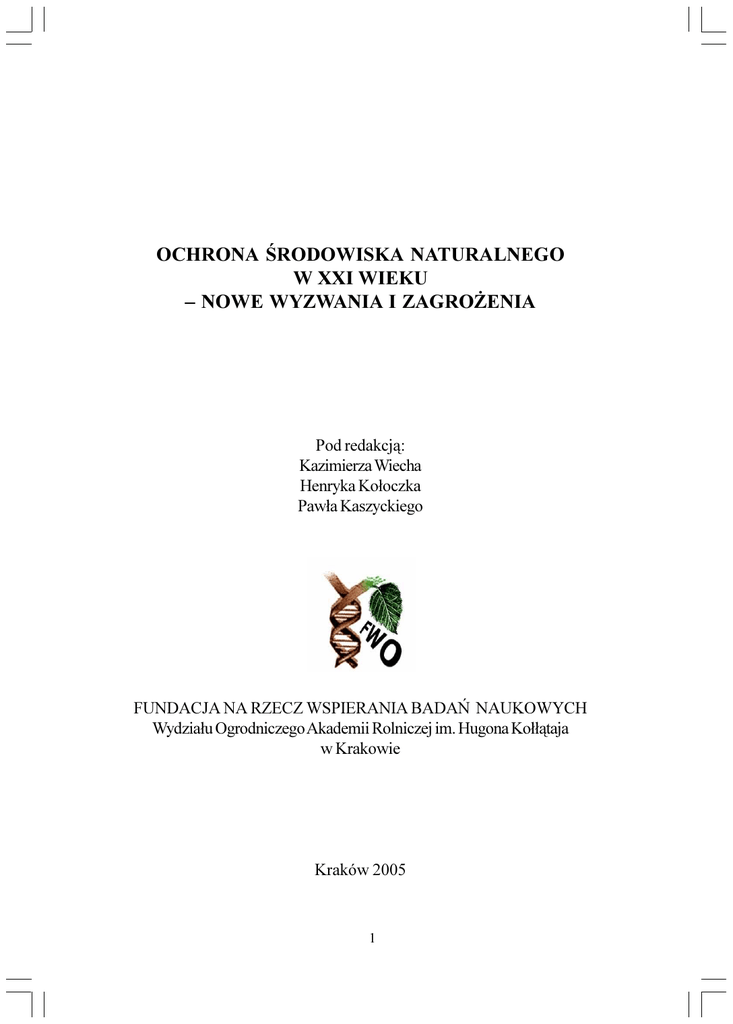 OCHRONA RODOWISKA NATURALNEGO W XXI WIEKU NOWE WYZWANIA I ZAGRO¯ENIA Pod redakcj¹: Kazimierza Wiecha Henryka Ko³oczka Paw³a Kaszyckiego FUNDACJA NA RZECZ WSPIERANIA BADAÑ NAUKOWYCH Wydzia³u Ogrodniczego Akademii Rolniczej im. Hugona Ko³³¹taja w Krakowie Kraków 2005 1 Copyright © by Fundacja na Rzecz Wspierania Badañ Naukowych (F.W.O.) Wydzia³u Ogrodniczego Akademii Rolniczej im. Hugona Ko³³¹taja w Krakowie, Kraków 2005 REDAKCJA NAUKOWA, TECHNICZNA I KOREKTY prof. dr hab. Kazimierz Wiech dr hab. Henryk Ko³oczek, prof. AR dr Pawe³ Kaszycki RECENZENT Prof. dr hab. Bogdan Zemanek Wydawnictwo monograficzne wspó³finansowane przez Wojewódzki Fundusz Ochrony rodowiska i Gospodarki Wodnej w Krakowie Fotografie na ok³adce: Kazimierz Wiech ISBN: 8388934627 Wydanie I, Kraków 2005 Oficyna Wydawnicza TEXT 30-003 Kraków; ul. Lubelska 1418 tel./fax: (012) 2945450 e-mail: [email protected] www.text.bci.pl Koedycja: Poligrafia Inspektoratu Towarzystwa Salezjañskiego 30-306 Kraków; ul. Konfederacka 6 2 PRZEDMOWA We wspó³czesnej nauce tradycyjny podzia³ badañ na tzw. podstawowe i stosowane traci stopniowo na znaczeniu. Wiedza naukowców oraz ich dowiadczenie, wynikaj¹ce z prowadzonych badañ, w coraz wiêkszym stopniu ukierunkowane zostaj¹ na rozwi¹zywanie aktualnych problemów zwi¹zanych z rozwojem cywilizacji oraz oczekiwaniami spo³ecznymi. Podstawowym zadaniem staje siê m.in. dba³oæ o stan rodowiska naturalnego, ochrona jego bioró¿norodnoci, wartoci kulturowych oraz opracowywanie nowych bezpiecznych technologii produkcji zarówno przemys³owej, jak i rolniczej. Przemys³ i rolnictwo pozostaj¹ ze sob¹ w cis³ym zwi¹zku, a podstawowym celem, oprócz zaopatrzenia w rodki do produkcji rolniczej oraz wytwarzania ¿ywnoci, staje siê zapewnienie bezpieczeñstwa zarówno konsumenta, jak i producenta. Wymienione zagadnienia le¿¹ u podstaw koncepcji integrowanej produkcji rolniczej oraz zrównowa¿onego rozwoju, zak³adaj¹cej takie przekszta³canie produkcji, które w powi¹zaniu z przemys³em dostarczy produktów o najwy¿szej jakoci i wartoci biologicznej oraz od¿ywczej, zapewniaj¹c równoczenie ochronê naturalnego rodowiska, dostarczaj¹c miejsc pracy, poprawiaj¹c warunki ¿ycia spo³eczeñstwa. Oznacza to m.in. poszukiwanie metod produkcji, bezpiecznych dla cz³owieka i rodowiska, poprzez np. siêganie do tradycyjnych w dalszym ci¹gu efektywnych metod uprawy roli i rolin, lepsze wykorzystanie naturalnego oporu rodowiska, ochronê po¿ytecznych organizmów zwierzêcych itp. Szczególnego znaczenia nabiera ochrona ró¿norodnoci rolinnej, tradycyjnych odmian warzyw i owoców oraz krajobrazu rolniczego. Pielêgnowanie dorobku poprzednich pokoleñ w dziedzinie rozwoju kultury rolnej, urz¹dzania ogrodów czy architektury wiejskiej ukszta³tuje poczucie wartoci oraz podkreli odrêbnoæ cech polskiego rolnictwa. Stosowanie chemicznych rodków ochrony rolin oraz innych agrochemikaliów powinno byæ ograniczane do niezbêdnego minimum, a ich zastêpowanie bezpiecznymi dla rodowiska preparatami powinno wejæ do sta³ej praktyki rolniczej. Stosowanie nawozów mineralnych oraz ich dawki nale¿y dostosowaæ do zasobnoci gleby, zapotrzebowania rolin na sk³adniki od¿ywcze, a zawartoæ pozosta³oci nawozów i pestycydów w rolinach powinna byæ stale monitorowana tak, aby uzyskiwany produkt nie stanowi³ zagro¿enia dla zdrowia konsumenta. Ograniczenie chemizacji rolnictwa mo¿na tak¿e osi¹gn¹æ poprzez rozwój metod biologicznych, polegaj¹cych na praktycznym wykorzystaniu po¿ytecznych organizmów do zwalczania agrofagów, jak i poprzez dalszy rozwój biotechnologii w kierunku uzyskiwania rolin odpornych na choroby, szkodniki czy niektóre herbicydy. 5 Szczególnego znaczenia nabiera tak¿e ochrona rodowiska glebowego, którego bioró¿norodnoæ, czystoæ i zasobnoæ stanowi podstawê bezpiecznej i efektywnej produkcji rolniczej. Poszukiwanie bezpiecznych dla rodowiska metod eliminacji ska¿enia gleb i przeciwdzia³ania ryzyku przedostania siê toksycznych substancji do produktów spo¿ywczych jest dziedzin¹, która w coraz wiêkszym stopniu koncentruje na sobie myl badawcz¹ wielu laboratoriów biochemicznych. Rolnictwo na pocz¹tku XXI wieku jest wiêc w dalszym ci¹gu jedn¹ z najbardziej dynamicznie rozwijaj¹cych siê i stale unowoczenianych dziedzin gospodarki. Od jego poziomu, na który sk³adaj¹ siê zarówno nowoczesne rozwi¹zania technologiczne, jak i troska o szeroko rozumiane rodowisko, zale¿y dalszy rozwój spo³eczeñstwa, wiadomego zagro¿eñ jakie wynikaj¹ z ignorowania ró¿norodnoci i wa¿noci powi¹zañ wszystkich sk³adników agro- i biocenoz. Kazimierz Wiech 6