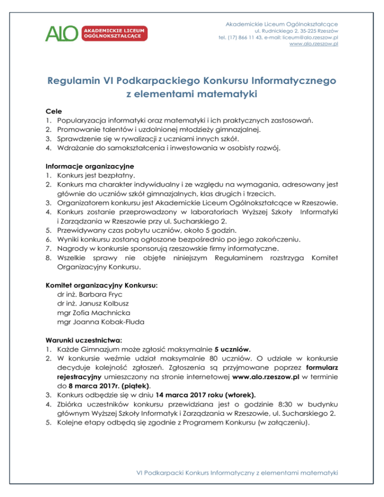Akademickie Liceum Ogólnokształcące ul. Rudnickiego 2, 35-225 Rzeszów tel. (17) 866 11 43, e-mail: [email protected] www.alo.rzeszow.pl Regulamin VI Podkarpackiego Konkursu Informatycznego z elementami matematyki Cele 1. Popularyzacja informatyki oraz matematyki i ich praktycznych zastosowań. 2. Promowanie talentów i uzdolnionej młodzieży gimnazjalnej. 3. Sprawdzenie się w rywalizacji z uczniami innych szkół. 4. Wdrażanie do samokształcenia i inwestowania w osobisty rozwój. Informacje organizacyjne 1. Konkurs jest bezpłatny. 2. Konkurs ma charakter indywidualny i ze względu na wymagania, adresowany jest głównie do uczniów szkół gimnazjalnych, klas drugich i trzecich. 3. Organizatorem konkursu jest Akademickie Liceum Ogólnokształcące w Rzeszowie. 4. Konkurs zostanie przeprowadzony w laboratoriach Wyższej Szkoły Informatyki i Zarządzania w Rzeszowie przy ul. Sucharskiego 2. 5. Przewidywany czas pobytu uczniów, około 5 godzin. 6. Wyniki konkursu zostaną ogłoszone bezpośrednio po jego zakończeniu. 7. Nagrody w konkursie sponsorują rzeszowskie firmy informatyczne. 8. Wszelkie sprawy nie objęte niniejszym Regulaminem rozstrzyga Komitet Organizacyjny Konkursu. Komitet organizacyjny Konkursu: dr inż. Barbara Fryc dr inż. Janusz Kolbusz mgr Zofia Machnicka mgr Joanna Kobak-Fluda Warunki uczestnictwa: 1. Każde Gimnazjum może zgłosić maksymalnie 5 uczniów. 2. W konkursie weźmie udział maksymalnie 80 uczniów. O udziale w konkursie decyduje kolejność zgłoszeń. Zgłoszenia są przyjmowane poprzez formularz rejestracyjny umieszczony na stronie internetowej www.alo.rzeszow.pl w terminie do 8 marca 2017r. (piątek). 3. Konkurs odbędzie się w dniu 14 marca 2017 roku (wtorek). 4. Zbiórka uczestników konkursu przewidziana jest o godzinie 8:30 w budynku głównym Wyższej Szkoły Informatyk i Zarządzania w Rzeszowie, ul. Sucharskiego 2. 5. Kolejne etapy odbędą się zgodnie z Programem Konkursu (w załączeniu). VI Podkarpacki Konkurs Informatyczny z elementami matematyki Akademickie Liceum Ogólnokształcące ul. Rudnickiego 2, 35-225 Rzeszów tel. (17) 866 11 43, e-mail: [email protected] www.alo.rzeszow.pl Zasady i kryteria konkursu: 1. W trakcie konkursu uczniowie rozwiązują 30 zadań przygotowanych w wersji elektronicznej. Są to zarówno zadania teoretyczne jak i praktyczne, za które może otrzymać maksymalnie 100 pkt. Zadania są punktowane w skali od 1 pkt. do 5 pkt. Punktowana jest zarówno poprawność rozwiązania oraz czas wykonania. 2. Zwycięża uczestnik z największą liczbą punktów i najkrótszym czasem rozwiązania zadań. Wymagania merytoryczne: 1. Wymagania z przedmiotu Informatyka: a) podstawowe wiadomości z zakresu algorytmiki, instrukcje warunkowe, pętle. b) podstawy języka C++: zmienne, tablice, funkcje; c) znajomość podstawowych poleceń HTML i CSS do tworzenia strony zawierających tekst, grafikę, elementy aktywne, odnośniki (linki); d) znajomość elementów składowych komputera; e) wiedza z zakresu urządzeń komputerowych; f) rodzaje i zastosowanie złączy komputerowych; g) podstawowe informacje związane z sieciami komputerowymi, korzystanie z usługi FTP; h) znajomość podstawowych programów graficznych Paint, Gimp, modyfikacja parametrów zdjęcia; i) podstawowe umiejętności pracy na warstwach w programie Gimp; j) umiejętność posługiwanie się przeglądarką internetową; k) netykieta – zasady porozumiewania się w Internecie; l) znajomość szyfrów Cezara i ROT-13; m) znajomość podstawowych operacji w arkuszu kalkulacyjnym – sumowanie, obliczanie średniej, maksimum, minimum, obliczenia procentowe, tworzenie wykresów; n) znajomość podstawowych umiejętności pracy z tekstem: formatowanie akapitu, wstawianie i edycja tabel, obrazków i kształtów; 2. Wymagania z przedmiotu Matematyka: 1) Zagadnienia z dziedziny: a) logiki matematycznej, b) działań na liczbach całkowitych, ułamki zwykłe i dziesiętne, c) liczbach działań wymiernych, NWW i NWD liczb, d) cechy podzielności liczb, e) potęgowania i pierwiastkowania, f) rzymski sposób zapisywania liczb, obliczenia procentowe, g) wyrażenia algebraiczne, równania i nierówności, wzory skróconego mnożenia, h) funkcja liniowa. 2) Zadania z treścią, zastosowania matematyki na co dzień. VI Podkarpacki Konkurs Informatyczny z elementami matematyki