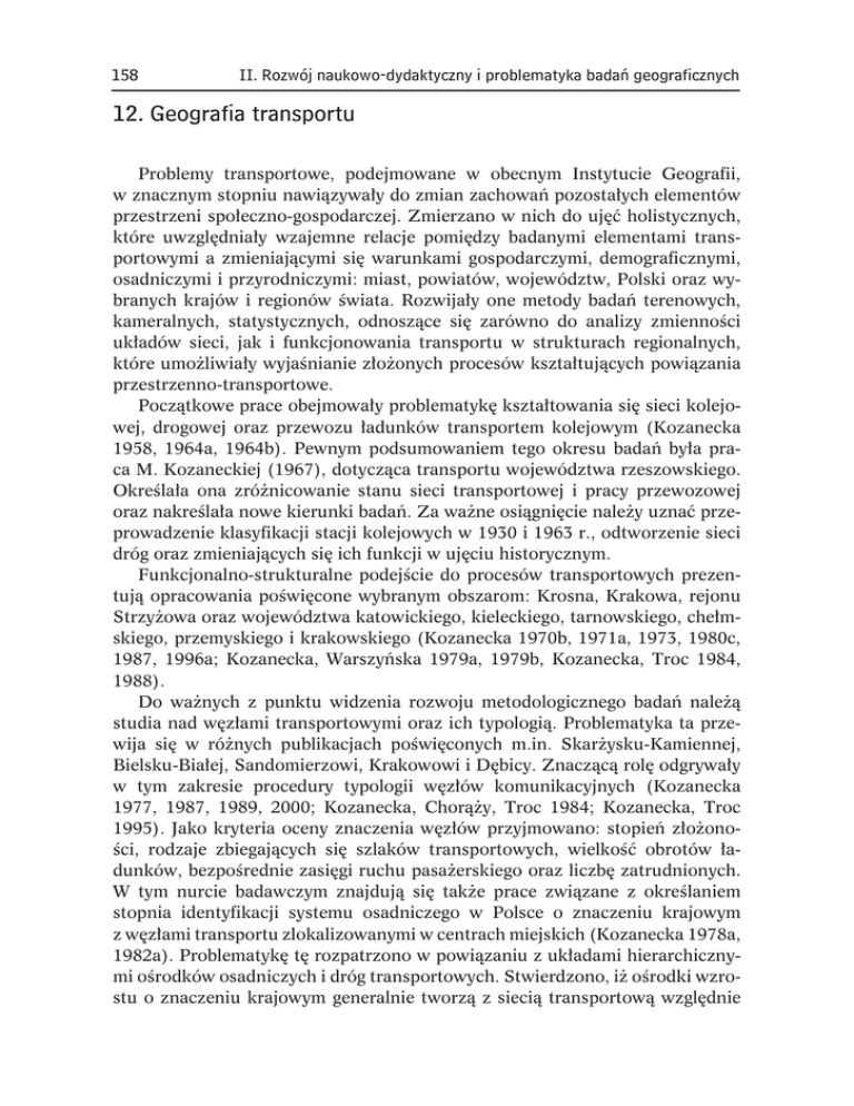158 II. Rozwój naukowo-dydaktyczny i problematyka badań geograficznych 12. Geografia transportu Problemy transportowe, podejmowane w obecnym Instytucie Geografii, w znacznym stopniu nawiązywały do zmian zachowań pozostałych elementów przestrzeni społeczno-gospodarczej. Zmierzano w nich do ujęć holistycznych, które uwzględniały wzajemne relacje pomiędzy badanymi elementami transportowymi a zmieniającymi się warunkami gospodarczymi, demograficznymi, osadniczymi i przyrodniczymi: miast, powiatów, województw, Polski oraz wybranych krajów i regionów świata. Rozwijały one metody badań terenowych, kameralnych, statystycznych, odnoszące się zarówno do analizy zmienności układów sieci, jak i funkcjonowania transportu w strukturach regionalnych, które umożliwiały wyjaśnianie złożonych procesów kształtujących powiązania przestrzenno-transportowe. Początkowe prace obejmowały problematykę kształtowania się sieci kolejowej, drogowej oraz przewozu ładunków transportem kolejowym (Kozanecka 1958, 1964a, 1964b). Pewnym podsumowaniem tego okresu badań była praca M. Kozaneckiej (1967), dotycząca transportu województwa rzeszowskiego. Określała ona zróżnicowanie stanu sieci transportowej i pracy przewozowej oraz nakreślała nowe kierunki badań. Za ważne osiągnięcie należy uznać przeprowadzenie klasyfikacji stacji kolejowych w 1930 i 1963 r., odtworzenie sieci dróg oraz zmieniających się ich funkcji w ujęciu historycznym. Funkcjonalno-strukturalne podejście do procesów transportowych prezentują opracowania poświęcone wybranym obszarom: Krosna, Krakowa, rejonu Strzyżowa oraz województwa katowickiego, kieleckiego, tarnowskiego, chełmskiego, przemyskiego i krakowskiego (Kozanecka 1970b, 1971a, 1973, 1980c, 1987, 1996a; Kozanecka, Warszyńska 1979a, 1979b, Kozanecka, Troc 1984, 1988). Do ważnych z punktu widzenia rozwoju metodologicznego badań należą studia nad węzłami transportowymi oraz ich typologią. Problematyka ta przewija się w różnych publikacjach poświęconych m.in. Skarżysku-Kamiennej, Bielsku-Białej, Sandomierzowi, Krakowowi i Dębicy. Znaczącą rolę odgrywały w tym zakresie procedury typologii węzłów komunikacyjnych (Kozanecka 1977, 1987, 1989, 2000; Kozanecka, Chorąży, Troc 1984; Kozanecka, Troc 1995). Jako kryteria oceny znaczenia węzłów przyjmowano: stopień złożoności, rodzaje zbiegających się szlaków transportowych, wielkość obrotów ładunków, bezpośrednie zasięgi ruchu pasażerskiego oraz liczbę zatrudnionych. W tym nurcie badawczym znajdują się także prace związane z określaniem stopnia identyfikacji systemu osadniczego w Polsce o znaczeniu krajowym z węzłami transportu zlokalizowanymi w centrach miejskich (Kozanecka 1978a, 1982a). Problematykę tę rozpatrzono w powiązaniu z układami hierarchicznymi ośrodków osadniczych i dróg transportowych. Stwierdzono, iż ośrodki wzrostu o znaczeniu krajowym generalnie tworzą z siecią transportową względnie 12. Geografia transportu 159 spójną całość, tylko na pewnych obszarach środkowo-wschodniej Polski zauważono brak tej zgodności między obu systemami (Kozanecka 1994). Ważną pozycję zajmują opracowania poświęcone analizie funkcji transportu w życiu gospodarczym i społecznym struktur regionalnych. Służyły one celom aplikacyjnym i wykonywane były na zlecenie różnorodnych instytucji, w tym dla Rady Naukowej Babiogórskiego Parku Narodowego, dotyczące przemian sieci komunikacyjnej w dorzeczu Górnej Wisły (Kozanecka, Warszyńska 1969; Kozanecka, Troc 1992). W pracach Komitetu Badań Rejonów Uprzemysławianych PAN, które dotyczyły wpływu inwestycji związanych z przemysłem siarkowym na zmiany struktury regionalnej, określono poziomu zagospodarowania w zakresie infrastruktury transportowej, jakości urządzeń transportowych i ich wielofunkcyjnej roli w stosunkach gospodarczych i społecznych z pozostałymi elementami gospodarki. Uzasadniono tezę o nienadążaniu rozwoju infrastruktury transportu w stosunku do potrzeb i tempa uprzemysłowienia, wskazano także na konieczność zmian w organizacji transportu oraz celowości wykorzystania dróg wodnych dla transportowych powiązań regionalnych (Kozanecka 1970a, 1970b, 1971b, 1976a 1976b, 1978b; Górz, Kozanecka 1969). Stwierdzono także, że w fazie industrialnego rozwoju nowo rozwijający się przemysł siarkowy wpłynął w zasadniczym stopniu na rozwój infrastruktury energetycznej, komunalnej, co w zasadniczym stopniu zmieniało układy regionalne, wpływając na rozwój infrastruktury niezbędnej dla działalności produkcyjnej i usługowej przedsiębiorstw kształtującego się ośrodka przemysłowego (Górz, Zioło 1978). Wiele miejsca w badaniach zajmowała problematyka komunikacji samochodowej w Polsce, a zwłaszcza jej dynamika, funkcje w obsłudze ludności oraz w procesie integracji różnej skali układów przestrzennych (Kozanecka 1980b, 1984, 1994, 1995b). Określono natężenia ruchu na liniach autobusowych oraz zasięg linii w relacji do funkcji i hierarchii ośrodków osadniczych w strukturze przestrzennej województwa nowosądeckiego (Kozanecka 1992b). Wyniki tych badań wykazały wysoki poziom spójności między centrum administracyjnym województwa a siedzibami gmin, a także z ośrodkami osadniczymi innych województw. Pewnym podsumowaniem tej problematyki badawczej jest pierwsza w polskiej literaturze monografia geograficzna komunikacji autobusowej, obejmująca obszar całego kraju (Kozanecka 1980b). Jej wartość metodologiczna polega na określeniu związków sieci komunikacji samochodowej z jej otoczeniem, z fazami wykształcenia układów przestrzennych oraz jej rolą w przestrzeni społeczno-gospodarczej. Sformułowano w niej nowe prawidłowości, rządzące układami przestrzennymi sieci transportowych w odniesieniu do poszczególnych typów hierarchicznych sieci osadniczej. Badaniami z tego zakresu objęto także państwa i reg