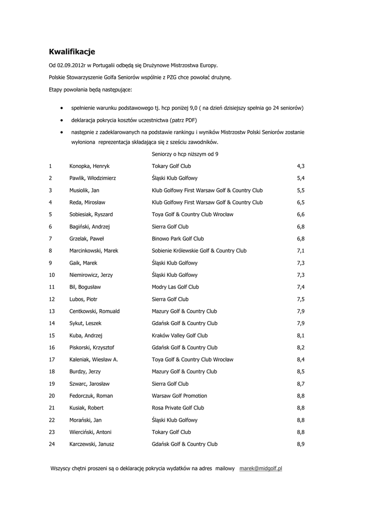 Kwalifikacje Od 02.09.2012r w Portugalii odbędą się Drużynowe Mistrzostwa Europy. Polskie Stowarzyszenie Golfa Seniorów wspólnie z PZG chce powołać drużynę. Etapy powołania będą następujące: spełnienie warunku podstawowego tj. hcp poniżej 9,0 ( na dzień dzisiejszy spełnia go 24 seniorów) deklaracja pokrycia kosztów uczestnictwa (patrz PDF) następnie z zadeklarowanych na podstawie rankingu i wyników Mistrzostw Polski Seniorów zostanie wyłoniona reprezentacja składająca się z sześciu zawodników. Seniorzy o hcp niższym od 9 1 Konopka, Henryk Tokary Golf Club 4,3 2 Pawlik, Włodzimierz Śląski Klub Golfowy 5,4 3 Musiolik, Jan Klub Golfowy First Warsaw Golf & Country Club 5,5 4 Reda, Mirosław Klub Golfowy First Warsaw Golf & Country Club 6,5 5 Sobiesiak, Ryszard Toya Golf & Country Club Wrocław 6,6 6 Bagiński, Andrzej Sierra Golf Club 6,8 7 Grzelak, Paweł Binowo Park Golf Club 6,8 8 Marcinkowski, Marek Sobienie Królewskie Golf & Country Club 7,1 9 Gaik, Marek Śląski Klub Golfowy 7,3 10 Niemirowicz, Jerzy Śląski Klub Golfowy 7,3 11 Bil, Bogusław Modry Las Golf Club 7,4 12 Lubos, Piotr Sierra Golf Club 7,5 13 Centkowski, Romuald Mazury Golf & Country Club 7,9 14 Sykut, Leszek Gdańsk Golf & Country Club 7,9 15 Kuba, Andrzej Kraków Valley Golf Club 8,1 16 Piskorski, Krzysztof Gdańsk Golf & Country Club 8,2 17 Kaleniak, Wiesław A. Toya Golf & Country Club Wrocław 8,4 18 Burdzy, Jerzy Mazury Golf & Country Club 8,5 19 Szwarc, Jarosław Sierra Golf Club 8,7 20 Fedorczuk, Roman Warsaw Golf Promotion 8,8 21 Kusiak, Robert Rosa Private Golf Club 8,8 22 Morański, Jan Śląski Klub Golfowy 8,8 23 Wierciński, Antoni Tokary Golf Club 8,8 24 Karczewski, Janusz Gdańsk Golf & Country Club 8,9 Wszyscy chętni proszeni są o deklarację pokrycia wydatków na adres mailowy [email protected]