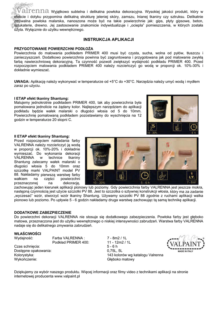 Valrenna Wyjątkowo subtelna i delikatna powłoka dekoracyjna. Wysokiej jakości produkt, który w efekcie i dotyku przypomina delikatną strukturę jeleniej skóry, zamszu, lnianej tkaniny czy sztruksu. Delikatnie zmywalna powłoka malarska, nanoszona może być na takie powierzchnie jak: gips, płyty gipsowe, beton, sztukaterie, drewno. Jej zastosowanie znakomicie indywidualizuje i „ociepla” pomieszczenia, w których została użyta. Wyłącznie do użytku wewnętrznego. INSTRUKCJA APLIKACJI PRZYGOTOWANIE POWIERZCHNI PODŁOŻA Powierzchnia do malowania podkładem PRIMER 400 musi być czysta, sucha, wolna od pyłów, tłuszczu i zanieczyszczeń. Dodatkowo powierzchnia powinna być zagruntowana i przygotowana jak pod malowanie zwykłą farbą nawierzchniową dekoracyjną. Ta czynność pozwoli zwiększyć wydajność podkładu PRIMER 400. Przed rozpoczęciem malowania podkładem PRIMER 400 należy rozcieńczyć go wodą w proporcji ok. 10%-30% i dokładnie wymieszać. UWAGA: Aplikację należy wykonywać w temperaturze od +5°C do +30°C. Narzędzia należy umyć wodą i mydłem zaraz po użyciu. I ETAP efekt tkaniny Shantung: Malujemy jednokrotnie podkładem PRIMER 400, tak aby powierzchnia była pomalowana jednolicie na żądany kolor. Najlepszym narzędziem do aplikacji podkładu będzie wałek malarski o długości włosia od 5 do 10mm. Powierzchnię pomalowaną podkładem pozostawiamy do wyschnięcia na 12 godzin w temperaturze 20 stopni C. II ETAP efekt tkaniny Shantung: Przed rozpoczęciem nakładania farby VALRENNA należy rozcieńczyć ją wodą w proporcji ok. 10%-20% i dokładnie wymieszać. Do wykonania dekoracji VALRENNA w technice tkaniny Shantung zalecamy wałek malarski o długości włosia 5 do 10mm oraz szczotkę marki VALPAINT model PV 88. Nakładamy pierwszą warstwę farby wałkiem na części powierzchni przeznaczonej na dekorację, zachowując jeden kierunek aplikacji pionowy lub poziomy. Gdy powierzchnia farby VALRENNA jest jeszcze mokra, następną czynnością jest użycie szczotki PV 88. Jest to szczotka o sztywnej konstrukcji włosia, który ma za zadanie „wyczesać” wzór, stworzyć wzór tkaniny Shantung. Używamy szczotki PV 88 zgodnie z ruchami aplikacji walka pionowo lub poziomo. Po upływie 5 - 6 godzin nakładamy druga warstwę zachowując tą samą technikę aplikacji. DODATKOWE ZABEZPIECZENIE Do powierzchni dekoracji VALRENNA nie stosuje się dodatkowego zabezpieczenia. Powłoka farby jest głęboko matowa, przeznaczona jest do użytku wewnętrznego o niskiej intensywności zabrudzeń. Warstwa farby VALRENNA nadaje się do delikatnego zmywania zabrudzeń. WŁAŚCIWOŚCI Wydajność: Czas schnięcia: Dostępne opakowania: Kolorystyka: Wykończenie: Farba VALRENNA : Podkład PRIMER 400: 7 - 8m2 / 1L 11 - 12m2 / 1L 5-6h 0,75L, 5L 143 kolorów wg katalogu Valrenna Głęboko matowy Dziękujemy za wybór naszego produktu. Więcej informacji oraz filmy video z technikami aplikacji na stronie internetowej producenta www.valpaint.pl