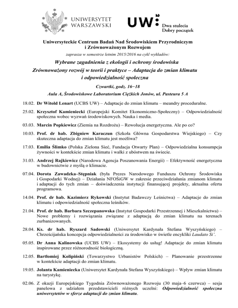 Uniwersyteckie Centrum Badań Nad Środowiskiem Przyrodniczym i Zrównoważonym Rozwojem zaprasza w semestrze letnim 2015/2016 na cykl wykładów: Wybrane zagadnienia z ekologii i ochrony środowiska Zrównoważony rozwój w teorii i praktyce – Adaptacja do zmian klimatu i odpowiedzialność społeczna Czwartki, godz. 16−18 Aula A, Środowiskowe Laboratorium Ciężkich Jonów, ul. Pasteura 5 A 18.02. Dr Witold Lenart (UCBS UW) – Adaptacje do zmian klimatu – meandry proceduralne. 25.02. Krzysztof Kamieniecki (Europejski Komitet Ekonomiczno-Społeczny) – Odpowiedzialność społeczna wobec wyzwań środowiskowych. Nauka i media. 03.03. Marcin Popkiewicz (Ziemia na Rozdrożu) – Rewolucja energetyczna. Ale po co? 10.03. Prof. dr hab. Zbigniew Karaczun (Szkoła Główna Gospodarstwa Wiejskiego) – Czy skuteczna adaptacja do zmian klimatu jest możliwa? 17.03. Emilia Ślimko (Polska Zielona Sieć, Fundacja Otwarty Plan) – Odpowiedzialna konsumpcja żywności w kontekście zmian klimatu i walki z ubóstwem na świecie. 31.03. Andrzej Rajkiewicz (Narodowa Agencja Poszanowania Energii) – Efektywność energetyczna w budownictwie z myślą o klimacie. 07.04. Dorota Zawadzka–Stępniak (była Prezes Narodowego Funduszu Ochrony Środowiska i Gospodarki Wodnej) – Działania NFOŚiGW w zakresie przeciwdziałania zmianom klimatu i adaptacji do tych zmian – doświadczenia instytucji finansującej projekty, aktualna oferta programowa. 14.04. Prof. dr hab. Kazimierz Rykowski (Instytut Badawczy Leśnictwa) – Adaptacje do zmian klimatu i odpowiedzialność społeczna leśników. 21.04. Prof. dr hab. Barbara Szczepanowska (Instytut Gospodarki Przestrzennej i Mieszkalnictwa) – Nowe problemy i rozwiązania związane z adaptacją do zmian klimatu na terenach zurbanizowanych. 28.04. Ks. dr hab. Ryszard Sadowski (Uniwersytet Kardynała Stefana Wyszyńskiego) – Chrześcijańska koncepcja odpowiedzialności za środowisko w świetle encykliki Laudato Si’. 05.05. Dr Anna Kalinowska (UCBS UW) – Ekosystemy do usług! Adaptacje do zmian klimatu inspirowane przez różnorodność biologiczną. 12.05. Bartłomiej Kolipiński (Towarzystwo Urbanistów Polskich) – Planowanie przestrzenne w kontekście adaptacji do zmian klimatu. 19.05. Jolanta Kamieniecka (Uniwersytet Kardynała Stefana Wyszyńskiego) – Wpływ zmian klimatu na turystykę. 02.06. Z okazji Europejskiego Tygodnia Zrównoważonego Rozwoju (30 maja–6 czerwca) – sesja panelowa z udziałem przedstawicieli różnych uczelni: Odpowiedzialność społeczna uniwersytetów w sferze adaptacji do zmian klimatu.