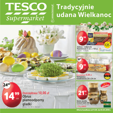 Tradycyjnie udana Wielkanoc 9 99 kpl. przy zakupie zestawu Zestaw: Czekolada Nussbeisser 3 szt. x 100 g 3,33 zÚ za 1 szt. cena jedn. - 33,30 zł/kg 1599 9 99 szt. Oszcz´dzasz 6,00 zł Tortownica kwadratowa 24 x 24 cm 2499 50 G 14 99 szt. Oszcz´dzasz 10,00 z∏ Obrus plamoodporny g∏adki wymiary: 110 x 160 cm, bia∏y, kolor 21 95 kpl. Kawa Jacobs Cronat Gold 200 g rozpuszczalna, cena jedn. - 109,75 z∏/kg + 50 g GRATIS handlowa od 11.03. do 03.04.2010 r. Oferta handlowa od 11.03. do 03.04.2010Oferta r. Wielkanocne Tradycje 2 Malowanie jajek na Wielkanoc to tradycja ciàgle ˝ywa, która w Polsce si´ga X wieku. NiegdyÊ wierzono, ˝e z kolorem jajek wià˝e si´ równie˝ ich moc, np. czerwone pisanki uwa˝ano za symbol serca i miłoÊci. Pi´knie malowane jajka, które od czasów chrzeÊcijaƒstwa symbolizujà odradzajàce si´ ˝ycie, nadziej´ i zwyci´stwo nad Êmiercià, od wieków zdobià polskie stoły podczas Wielkanocy. Nie powinno ich równie˝ zabraknàç w koszyku ze Êwi´conkà, w którym tradycyjnie Êwi´ci si´ m.in. cukrowego baranka - symbol Chrystusa Zmartwychwstałego, w´dliny - na znak koƒczàcego si´ postu, a tak˝e masło - symbol dobrobytu. Wielkanocne inspiracje 1 1 69 3 99 szt. Palma wielkanocna 30 cm dost´pna równie˝: palma 60 cm - 3,99 z∏/szt. szt. Zajàczek drewniany do powieszenia 5 99 8 99 99 op. Ozdoby wielkanocne z filcu 4 szt. ró˝ne wzory, cena jedn. - 1,00 z∏/szt. op. Jajka dekorowane 6 szt. op. Jajka z filcowymi kwiatkami 8 szt. cena jedn. - 1,00 z∏/szt. cena jedn. - 1,12 z∏/szt. Oszcz´dzasz 2,00 zł Koszyczek 99 wielkanocny 13 Bolerek nie zawiera elementów dekoracji 11 99 szt. 0 99 599 Oszcz´dzasz 1,00 zł Koszyczek wielkanocny ma∏y dost´pny równie˝: koszyczek a˝urek - 8,99 z∏/szt. 039 4 1 99 99 0 szt. Oszcz´dzasz 0,10 zł Sztuczne kwiaty: ˝onkil pojedynczy szt. szt. Baranek plastikowy Alleluja 2 Barwniki do jaj 5 kolorów 49 089 29 op. 0 69 szt. Oszcz´dzasz 0,20 zł Sztuczne kwiaty: ga∏àzka forsycji szt. Znicz wielkanocny plastikowy 100 g 2 99 szt. czas spalania: 20 h RoÊliny dost´pny równie˝: znicz szklany cebulowe wielkanocny 135 g - 4,99 z∏/szt., znicz szklany tulipan dekorowany 170 g - 7,99 z∏/szt. hiacynt, narcyz 3 99 szt. Bukszpan 3 Dekoracje stołu 249 399 1 2 99 19 99 99 op. Oszcz´dzasz 0,50 zł Serwetki Êwiàteczne 20 szt. wymiary: 33 x 33 cm, cena jedn. - 0,10 z∏/szt. 999 2499 szt. Oszcz´dzasz 1,00 zł szt. 99 szt. Oszcz´dzasz 5,00 zł Oszcz´dzasz 2,00 zł wymiary: 110 x 160 cm, dost´pny równie˝: bie˝nik 50 x 100 cm - 9,99 z∏/szt. ró˝ne wzory, wymiary: 40 x 40 cm Obrus Êwiàteczny Serwetka z motywem wielkanocnym ø 30 cm 7 Poszewka wielkanocna bawe∏niana Kieliszek na jajko 2 bia∏a porcelana 99 5 szt. Talerz na jajka 99 12 99 szt. 2 99 Talerz szklany na jajka szt. Ceramiczna podstawka na jajko 1145 1488 7 99 szt. Jajko ceramiczne na tealight 4 1 99 szt. Kubek porcelanowy ró˝ne kolory 11 99 szt. Oszcz´dzasz 2,89 zł Dzbanek ˝aroodporny 1,5 l 9 99 kpl. Oszcz´dzasz 1,46 zł Komplet kieliszków do wódki 6 szt. Złoty Pasek cena jedn. - 1,67 z∏/szt. szt. Słodycze wielkanocne 4 za 1 3 69 op. Zestaw wielkanocny 80 g 1 szt. Zajàc 60 g cena jedn. - 33,17 z∏/kg op. kpl. Zestaw: jajko Kinder niespodzianka 4 x 20 g cena jedn. - 112,70 zł/kg kupujàc 4 szt. kupujàc 1 szt. szt. Figurki z mlecznej czekolady kaczuszka, kwoka, baranek, ró˝ne gramatury szt. Zajàc wielkanocny Z∏oty 150 g 11 2 49 99 op. Zajàczki lub kurczaczki 100 g torebka, cena jedn. - 49,90 z∏/kg 1329 99 0,50 zł/szt. 0,69 zł/szt. 4 99 cena jedn. - 39,93 z∏/kg 8 99 cena jedn. przy zakupie 4 szt. - 25,00 z∏/kg cena jedn. - 22,17 zł/kg 5 5 Pisanka 20 g Zestaw wielkanocny 180 g cena jedn. - 21,13 zł/kg 99 2 zÚ 99 Baranek cukrowy 140 g szt. cena jedn. - 17,79 z∏/kg 1429 99 op. 12 99 op. Oszcz´dzasz 1,30 zł Oszcz´dzasz 1,30 zł cena jedn. - 31,55 zł/kg cena jedn. - 51,96 zł/kg Mleczko Alpejskie 380 g Bombonierka Merci 250 g 18 99 op. Cukierki Wawel 1 kg ró˝ne rodzaje 5 Âmigus -dyngus 6 Znany te˝ jako Lany Poniedziałek, to słowiaƒski obyczaj zwiàzany z drugim dniem Wielkanocy. NiegdyÊ polegał na symbolicznym biciu wierzbowymi witkami po nogach i wzajemnym oblewaniu si´ wodà, co miało symbolizowaç oczyszczenie z chorób i grzechu. Na przełomie XVI i XVII wieku, bioràcych udział w dyngusowej zabawie, obowiàzywały Êcisłe zasady, np. na oblewanie wodà pozwalały wyłàcznie m´˝czyznom. Panie mogły „odegraç si´” dopiero we wtorek, ale za to przywilej ten przysługiwał im a˝ do Zielonych Âwiàtek. Na wielkie lanie wody 6 12 99 99 szt. Zabawka pistolet na wod´ 28 cm szt. Zabawka pistolet na wod´ 39 cm Zabawka pistolet na wod´ 13 cm 1 49 0 szt. szt. Zabawka pistolet na wod´ 27 cm Âmigusówka jajeczko 599 3 769 99 szt. 4 99 59 3 1499 1299 99 op. 9 99 op. 12 99 szt. Oszcz´dzasz 2,00 zł Oszcz´dzasz 3,70 zł Oszcz´dzasz 3,00 zł Oszcz´dzasz 2,00 zł ró˝ne modele ró˝ne obrazki ró˝ne kolory ró˝ne rodzaje Mini samochód Puzzle drewniane szt. Zabawka kucyk Ponyville Figurka podstawowa Littlest Pet Shop 7 Wykwintna babka wielkanocna 8 Składniki: 1 szkl. màki, 3/4 szkl. cukru, 1/2 kostki masła, 3 ły˝ki mleka, ły˝eczka proszku do pieczenia, 15 dag orzechów włoskich, pół tabliczki czekolady, 4 jajka, cukier puder, bułka tarta, szczypta soli Sposób przygotowania: Do jajek dodaç masło, cukier i sól, zmiksowaç. Do powstałej masy dodaç màk´, proszek do pieczenia i mleko. Miksowaç do powstania jednolitej masy. Orzechy posiekaç, czekolad´ pokruszyç na drobne kawałki lub zetrzeç na grubych oczach tarki. Dodaç do masy i delikatnie wymieszaç ły˝kà. Form´ do pieczenia nasmarowaç masłem, posypaç bułkà tartà, a nast´pnie wlaç do niej ciasto. Wstawiç do nagrzanego do 180-200°C piekarnika i piec około 1 godziny. Po upieczeniu ciasto ostudziç i posypaç cukrem pudrem. Na święta w dobrej formie 1M 4999 29 99 szt. 6999 Oszcz´dzasz 20