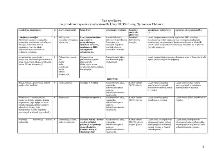 Plan wynikowy do przedmiotu rysunek i malarstwo dla klasy III OSSP –mgr Tymoteusz Chliszcz zagadnienia programowe lg zakres wiadomości temat lekcji informacje o realizacji techniki i materiały plastyczne Podanie informacji Przykłady, dotyczących przedmiotu. Potrzebnych Podstawowych narzędzi podjętych zagadnień oraz potrzebnych materiałów i narzędzi. Lekcja organizacyjna Zapoznanie uczniów ze specyfiką przedmiotu ,materiałami potrzebnymi do zajęć ,warsztatem pracy i organizacją pracy na lekcji. Zapoznanie z przedmiotowym systemem oceniania . 1 BHP, system oceniania, wymagania edukacyjne. Lekcja organizacyjnazapoznanie z przedmiotowym systemem oceniania, regulaminem BHP, wymaganiami edukacyjnymi. przypomnienie nomenklatury 1 plastycznej, omówienie podstawowych pojęć (linia, walor, plama, światłocień, barwa, faktura, kompozycja) Podstawowe pojęcia: linia plama walor światłocień barwa faktura kompozycja Przypomnienie Podanie tematu lekcji, podstawowych pojęć przypomnienie pojęć plastycznych: plastycznych. (linia, plama, walor, światłocień, barwa, faktura, kompozycja) Rodzaje materii, porównanie faktur i powierzchni obiektów. 8 Materia, faktura Materia w rysunku Światłocień – światło sztuczne punktowe, światło miękkie, dzienne rozproszone i jego wpływ na układ form kompozycji, zróżnicowanie w odniesieniu do pory dnia (rekapitulacja wtórna zagadnień poruszanych w klasach poprzednich). 8 Światłocień Światłocień w rysunku Kompozycja, kreska, walor, światłocień, Studium Natury – Postaćanaliza wielkości, proporcji, wzajemnego układu kształtów, kierunki formy, w studium postaci. umiejętności podstawowe (3) umiejętności rozszerzone(4,5) Uczeń zna podstawowe zasady regulaminu BHP, uczeń zna przedmiotowy system oceniania oraz wymagania edukacyjne obowiązujące na przedmiocie Rysunek i malarstwo w klasie III OSSP. Uczeń zna podstawowe materiały potrzebne mu w pracy w tym roku szkolnym. Uczeń zna podstawowe pojęcia plastyczne, umie wykorzystać środki wyrazu plastycznego w swojej pracy. RYSUNEK Proporcje i (człowiek). konstrukcja modela 8 Podanie tematu lekcji, pogadanka, Indywidualna praca uczniów, Indywidualna korekta nauczyciela. Podanie tematu lekcji, pogadanka, Indywidualna praca uczniów, Indywidualna korekta nauczyciela. Karton formatu 50x70 ołówek Uczeń stara się uzyskać materię poszczególnych przedmiotów martwej natury w rysunku. Uczeń umie uzyskać materię poszczególnych przedmiotów martwej natury w rysunku. Karton formatu 50x70 ołówek Uczeń stara się uzyskać światłocień w rysunku Uczeń umie uzyskać światłocień w rysunku. Podanie tematu lekcji, pogadanka, Indywidualna praca uczniów, Indywidualna korekta nauczyciela. Karton formatu 100x70, ołówek, węgiel, gumka. Uczeń umie zakomponować płaszczyznę kartki, próbuje oddać proporcje rysowanej postaci, próbuje wykreślić kierunki postaci Uczeń umie zakomponować płaszczyznę kartki, próbuje oddać proporcje rysowanej postaci, umie wykreślić kierunki postaci . 1 Proporcje i ( zwierzę). konstrukcja modela 4 Kompozycja, kreska, walor, światłocień, zwierzę - analiza wielkości, proporcji, wzajemnego układu kształtów, kierunki formy, w szkice oraz studium wybranego zwierzęcia Studium koloru, temperatura barwy, 8 walor w kolorze, relatywizm barw, kontrast barw. Kompozycja, barwa, walor w kolorze, relatywizm barw. Studium koloru – martwa natura. Światło dzienne i jego wpływ na kolor. 8 Kompozycja, światło Światło dzienne w martwej naturze. Harmonia i kontrast w kompozycjach malarskich (kontynuacja). 8 Harmonia, kontrast Dominanta w budowie obrazu. 8 Dominanta Podanie tematu zadania Indywidualna praca uczniów, Indywidualna korekta nauczyciela. Karton formatu A4, Uczeń umie zakomponować ołówek, gumka. płaszczyznę kartki, próbuje oddać proporcje rysowanego zwierzęcia Uczeń umie zakomponować płaszczyznę kartki, umie oddać proporcje rysowanego zwierzęcia, stara się oddać charakter zwierzęcia. Płótno lub karton 50x70,farby , pędzle, paleta Uczeń umie zakomponować płaszczyznę kartki, próbuje oddać kolor natury. Dostrzega relacje barw w naturze. Uczeń umie zakomponować płaszczyznę kartki, umie oddać kolor natury, potrafi zastosować relatywizm barw. Podanie tematu zadania Indywidualna praca uczniów, Indywidualna korekta nauczyciela. Płótno lub karton 50x70,farby , pędzle, paleta Uczeń umie zakomponować płaszczyznę kartki, próbkuje uzyskać charakter światła dziennego w kompozycji malarskiej. Uczeń umie zakomponować płaszczyznę kartki, umie uzyskać charakter światła dziennego w kompozycji malarskiej. Harmonia i kontrast w martwej naturze. Podanie tematu zadania Indywidualna praca uczniów, Indywidualna korekta nauczyciela. Płótno lub karton 50x70,farby , pędzle, paleta Uczeń umie zakomponować płaszczyznę kartki, próbkuje uzyskać harmonię i kontrast w kompozycji malarskiej. Uczeń umie zakomponować płaszczyznę kartki, umie uzyskać harmonię i kontrast w kompozycji malarskiej. Dominanta w martwej naturze. Podanie tematu zadania Indywidualna praca uczniów, Indywidualna korekta nauczyciela. łótno lub karton 50x70,farby , pędzle, paleta Uczeń umie zakomponować płaszczyznę kartki, próbkuje uzyskać dominantę w kompozycji malarskiej. Uczeń umie zakomponować płaszczyznę kartki, umie uzyskać dominantę w kompozycji malarskiej. MALARSTWO Podanie tematu zadania Indywidualna praca uczniów, Indywidualna korekta nauczyciela. 2