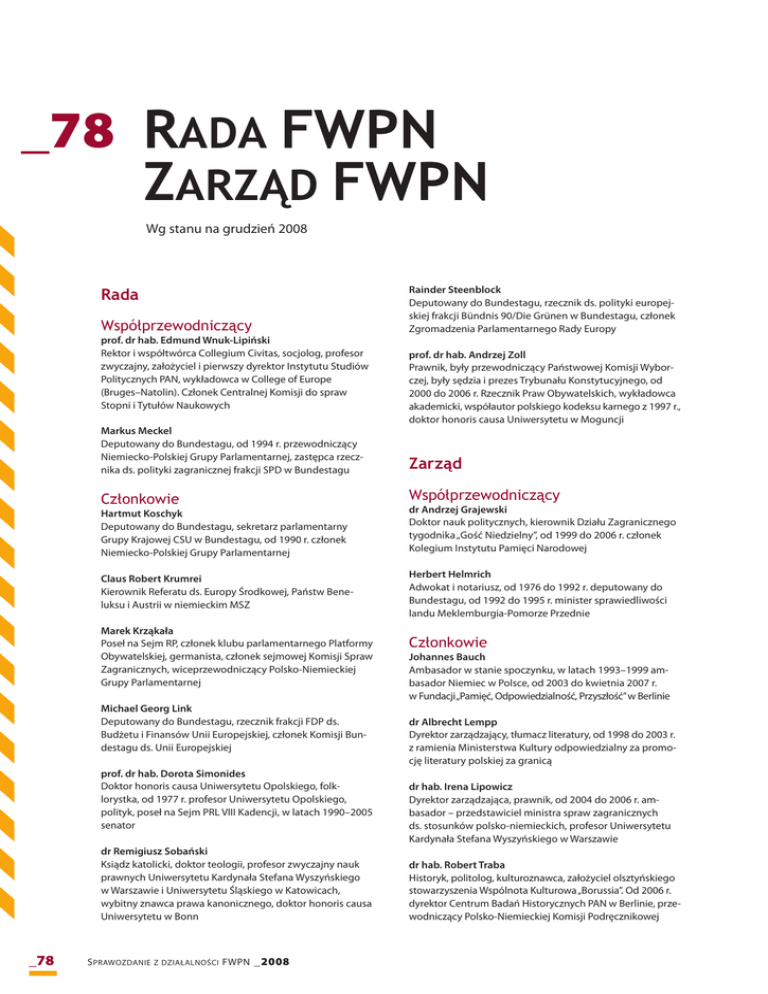 _78 RADA FWPN ZARZĄD FWPN Wg stanu na grudzień 2008 Rada Współprzewodniczący prof. dr hab. Edmund Wnuk-Lipiński Rektor i współtwórca Collegium Civitas, socjolog, profesor zwyczajny, założyciel i pierwszy dyrektor Instytutu Studiów Politycznych PAN, wykładowca w College of Europe (Bruges–Natolin). Członek Centralnej Komisji do spraw Stopni i Tytułów Naukowych Markus Meckel Deputowany do Bundestagu, od 1994 r. przewodniczący Niemiecko-Polskiej Grupy Parlamentarnej, zastępca rzecznika ds. polityki zagranicznej frakcji SPD w Bundestagu Rainder Steenblock Deputowany do Bundestagu, rzecznik ds. polityki europejskiej frakcji Bündnis 90/Die Grünen w Bundestagu, członek Zgromadzenia Parlamentarnego Rady Europy prof. dr hab. Andrzej Zoll Prawnik, były przewodniczący Państwowej Komisji Wyborczej, były sędzia i prezes Trybunału Konstytucyjnego, od 2000 do 2006 r. Rzecznik Praw Obywatelskich, wykładowca akademicki, współautor polskiego kodeksu karnego z 1997 r., doktor honoris causa Uniwersytetu w Moguncji Zarząd Członkowie Współprzewodniczący Hartmut Koschyk Deputowany do Bundestagu, sekretarz parlamentarny Grupy Krajowej CSU w Bundestagu, od 1990 r. członek Niemiecko-Polskiej Grupy Parlamentarnej dr Andrzej Grajewski Doktor nauk politycznych, kierownik Działu Zagranicznego tygodnika „Gość Niedzielny”, od 1999 do 2006 r. członek Kolegium Instytutu Pamięci Narodowej Claus Robert Krumrei Kierownik Referatu ds. Europy Środkowej, Państw Beneluksu i Austrii w niemieckim MSZ Herbert Helmrich Adwokat i notariusz, od 1976 do 1992 r. deputowany do Bundestagu, od 1992 do 1995 r. minister sprawiedliwości landu Meklemburgia-Pomorze Przednie Marek Krząkała Poseł na Sejm RP, członek klubu parlamentarnego Platformy Obywatelskiej, germanista, członek sejmowej Komisji Spraw Zagranicznych, wiceprzewodniczący Polsko-Niemieckiej Grupy Parlamentarnej Michael Georg Link Deputowany do Bundestagu, rzecznik frakcji FDP ds. Budżetu i Finansów Unii Europejskiej, członek Komisji Bundestagu ds. Unii Europejskiej prof. dr hab. Dorota Simonides Doktor honoris causa Uniwersytetu Opolskiego, folklorystka, od 1977 r. profesor Uniwersytetu Opolskiego, polityk, poseł na Sejm PRL VIII Kadencji, w latach 1990–2005 senator dr Remigiusz Sobański Ksiądz katolicki, doktor teologii, profesor zwyczajny nauk prawnych Uniwersytetu Kardynała Stefana Wyszyńskiego w Warszawie i Uniwersytetu Śląskiego w Katowicach, wybitny znawca prawa kanonicznego, doktor honoris causa Uniwersytetu w Bonn _78 14S PRAWOZDANIE Z DZIAŁALNOŚCI FWPN _ 2008 Członkowie Johannes Bauch Ambasador w stanie spoczynku, w latach 1993–1999 ambasador Niemiec w Polsce, od 2003 do kwietnia 2007 r. w Fundacji „Pamięć, Odpowiedzialność, Przyszłość” w Berlinie dr Albrecht Lempp Dyrektor zarządzający, tłumacz literatury, od 1998 do 2003 r. z ramienia Ministerstwa Kultury odpowiedzialny za promocję literatury polskiej za granicą dr hab. Irena Lipowicz Dyrektor zarządzająca, prawnik, od 2004 do 2006 r. ambasador – przedstawiciel ministra spraw zagranicznych ds. stosunków polsko-niemieckich, profesor Uniwersytetu Kardynała Stefana Wyszyńskiego w Warszawie dr hab. Robert Traba Historyk, politolog, kulturoznawca, założyciel olsztyńskiego stowarzyszenia Wspólnota Kulturowa „Borussia”. Od 2006 r. dyrektor Centrum Badań Historycznych PAN w Berlinie, przewodniczący Polsko-Niemieckiej Komisji Podręcznikowej