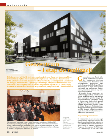 w y d a r z e n i a Geocentrum – I etap do realizacji Położone przy ul. Na Grobli, po przeciwnej stronie Odry niż kampus główny Politechniki, będzie nowoczesnym kompleksem edukacyjno-badawczym PWr. Ulokowane w nim docelowo cztery wydziały: Geoinżynierii, Górnictwa i Geologii, Budownictwa Lądowego i Wodnego, Inżynierii Środowiska oraz Mechaniczno-Energetyczny, skupione na problematyce nauk o Ziemi, będą kształcić studentów na studiach inżynierskich, magisterskich i doktoranckich. G eocentrum ma służyć integracji środowiska naukowego i badawczego Wrocławia i zintensyfikowaniu działań na rzecz innowacyjności technologii ważnych dla gospodarki Dolnego Śląska. Wspomagane tu będą takie gałęzie przemysłu, jak: surowcowy, budownictwo, inżynieria lądowa czy inżynieria środowiskowa. Z drugiej strony rynek pracy coraz bardziej potrzebuje interdyscyplinarnie wykształconych specjalistów. Tym wymogom sprostać mogą dobrze wykształceni kandydaci, którzy w Geocentrum będą mogli poznać zagadnienia eksploatacji kopalin, hydrologii, konstrukcji budowli, infrastruktury drogowej. Realizacja inwestycji pozwoli na rozpoczęcie zupełnie nowych działań edukacyjno-badawczych i umożliwi wykształcenie wysokiej klasy specjalistów. Trójstronne porozumienie Na uroczystość podpisania umowy zostali zaproszeni prorektorzy i dziekani PWr, byli rektorzy uczelni, pracownicy dydaktyczno-naukowi, przedstawiciele samorządu miasta i województwa oraz dziennikarze. Na zdjęciu, na pierwszym planie, od lewej: prorektorzy prof. prof. A. Kasprzak i E. Rusiński, członek zarządu woj. dolnośląskiego G. Roman i wiceprezydent Wrocławia W. Adamski 22 Krystyna Malkiewicz, oprac. mw Zdjęcia: Krzysztof Mazur Wizualizacje: Kuryłowicz & Associates 11 października br. uroczyście podpisanno umowy dotyczące realizacji Budowy kompleksu edukacyjno-badawczego GEOCENTRUM Politechniki Wrocławskiej (Etap I) w ramach Regionalnego Programu Operacyjnego dla Województwa Dolnośląskiego na lata 2007-2013. numer 241 w y d a r z e n i a Pierwsza umowa – z Urzędem Marr szałkowskim Województwa Dolnośląskiego – dotyczy dofinansowania projektu, druga została zawarta z generalnym wykonawcą inwestycji – japońską firmą Kajima. Na uroczystość w sali Senatu PWr przybyli m.in. przedstawiciele władz miasta i Urzędu Marszałkowskiego, dziekani wydziałów, które będą użytkownikami nowego kompleksu, przedstawiciele firmy wykonawczej. Obecny był także reprezentant pracowni Stefana Kuryłowicza z Warszawy – autora realizowanego projektu Geocentrum. Odpowiednie dokumenty zostały podpisane przez marszałka woj. dolnośląskiego Marka Łapińskiego, Koji Ourę i Macieja Runkiewicza z firmy Kajima Polska oraz rektora Politechniki prof. Tadeusza Więckowskiego. Umowy na realizację I etapu Geocentrum podpisane. Od lewej: marszałek województwa M. Łapiński, rektor PWr prof. T. Więckowski, Koji Oura i Maciej Runkiewicz z firmy Kajima Polska Historyczne przejście Rektor zauważył historyczne znaczenie przejścia PWr na drugą stronę Odry. Przypomniał, że dwa lata temu, w październiku 2008 r., przerwał inwestycję Geocentrum, która wówczas w jego ocenie nie miała szans na realizację. Dziękował uczestnikom procesu inwestycyjnego i decydentom w urzędach Marszałkowskim i Miejskim za życzliwość. Inwestycja powstanie na terenach, które Politechnika odkupi od miasta. Będzie największym j y przedsięwzięp ę ciem edukacyjnym na Dolnym Śląsku, a to dopiero I etap planowanej zabudowy po drugiej stronie Odry. Rektor wyraził nadzieję, że w niedługim czasie będzie możliwa budowa kolejnych etapów przedsięwzięcia, tak ważnego dla miasta i całego województwa, planowany kompleks edukacyjno-badawczy ma bowiem zajmować się zagadnieniami szczególnie istotnymi dla gospodarki naszego województwa. – Różne kopaliny p y stanowią bogactwo Dolnego Śląska, a Geocentrum właśnie będzie kształcić specjalistów wszechstronnie przygotowanych do pracy przy eksploatacji kopalin, hydrologii czy konstrukcji budowli – mówił prof. Więckowski. Wyraził też nadzieję, że zgodnie z deklaracjami wykonawcy uda się zrealizować i otworzyć obiekt na inaugurację roku akademickiego 2012/2013. Regionalne starania Marszałek Marek Łapiński zauważył, że wielką przyjemność sprawia udział w uroczystości, wieńczącej pracę tak wielu osób. Uznał projekt Geocentrum za najtrudniejszy z analizowanych przez jego urząd. Tym bardziej gratulował uczelni, że zadanie to zostało doprowadzone szczęśliwie do tego etapu. Zapowiedział też, że w przyy szłej kadencji samorządu województwa zamierza poświęcić uwagę, w ralistopad 2010 mach strategii działań dla Polski Zachodniej, finansowaniu dolnośląskich uczelni wyższych, w tym wrocławw skich. 26-27 października br. w Szczecinie odbędzie się szczyt partnerstwa Odry – polskich i niemieckich regionów leżących w jej dorzeczu. Zostanie tam również podpisane porozumienie o współpracy naukowo-badawczej. Marszałek wyraził nadzieję, że udział Politechniki Wrocławskiej w spotkaniu wzmocni starania, by w nowej perr spektywie finansowania w programie regionalnym, jak i projektach programu operacyjnego dla Polski Zachodniej znalazły się także wydatki planowane p przez PWr i inne uczelnie Dolnego Śląska. Planowany obiekt jest budynkiem 5-kondygnacyjnym, o powierzchni netto 12 264 m2 i kubaturze netto 46 980 m3. Zaprojektowano go jako trzy podłużne prostopadłościany, ustawione w kierunku północ-południe na wspólnej podstawie mieszczącej strefę wejściową oraz zespoły pomieszczeń dydaktycznych i laboratoryjnych. Bryły te wydzielają dwa niezależne dziedzińce wewnętrzne, które dają możliwość właściwego doświetlenia pomieszczeń światłem dziennym. Forma architektoniczna budynku jest w swoim wyrazie współczesna i elegancka. Obiekt doskonale będzie się wpisywać w zas