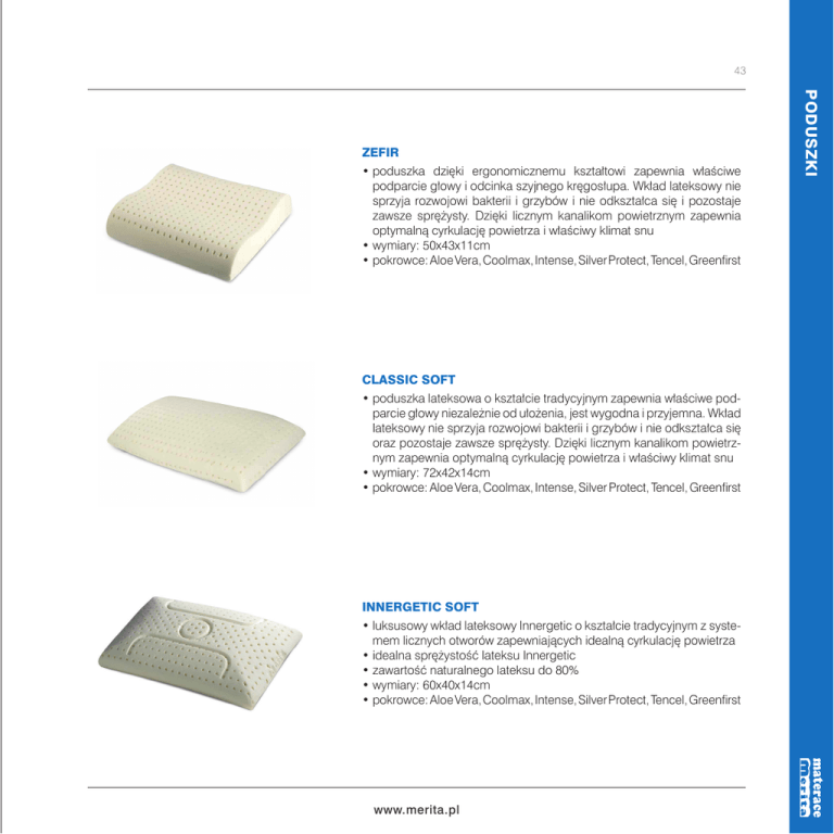 43 classic soft • poduszka lateksowa o kształcie tradycyjnym zapewnia właściwe podparcie głowy niezależnie od ułożenia, jest wygodna i przyjemna. Wkład lateksowy nie sprzyja rozwojowi bakterii i grzybów i nie odkształca się oraz pozostaje zawsze sprężysty. Dzięki licznym kanalikom powietrznym zapewnia optymalną cyrkulację powietrza i właściwy klimat snu • wymiary: 72x42x14cm • pokrowce: Aloe Vera, Coolmax, Intense, Silver Protect, Tencel, Greenfirst innergetic soft • luksusowy wkład lateksowy Innergetic o kształcie tradycyjnym z systemem licznych otworów zapewniających idealną cyrkulację powietrza • idealna sprężystość lateksu Innergetic • zawartość naturalnego lateksu do 80% • wymiary: 60x40x14cm • pokrowce: Aloe Vera, Coolmax, Intense, Silver Protect, Tencel, Greenfirst www.merita.pl PODUSZKI zefir • poduszka dzięki ergonomicznemu kształtowi zapewnia właściwe podparcie głowy i odcinka szyjnego kręgosłupa. Wkład lateksowy nie sprzyja rozwojowi bakterii i grzybów i nie odkształca się i pozostaje zawsze sprężysty. Dzięki licznym kanalikom powietrznym zapewnia optymalną cyrkulację powietrza i właściwy klimat snu • wymiary: 50x43x11cm • pokrowce: Aloe Vera, Coolmax, Intense, Silver Protect, Tencel, Greenfirst
