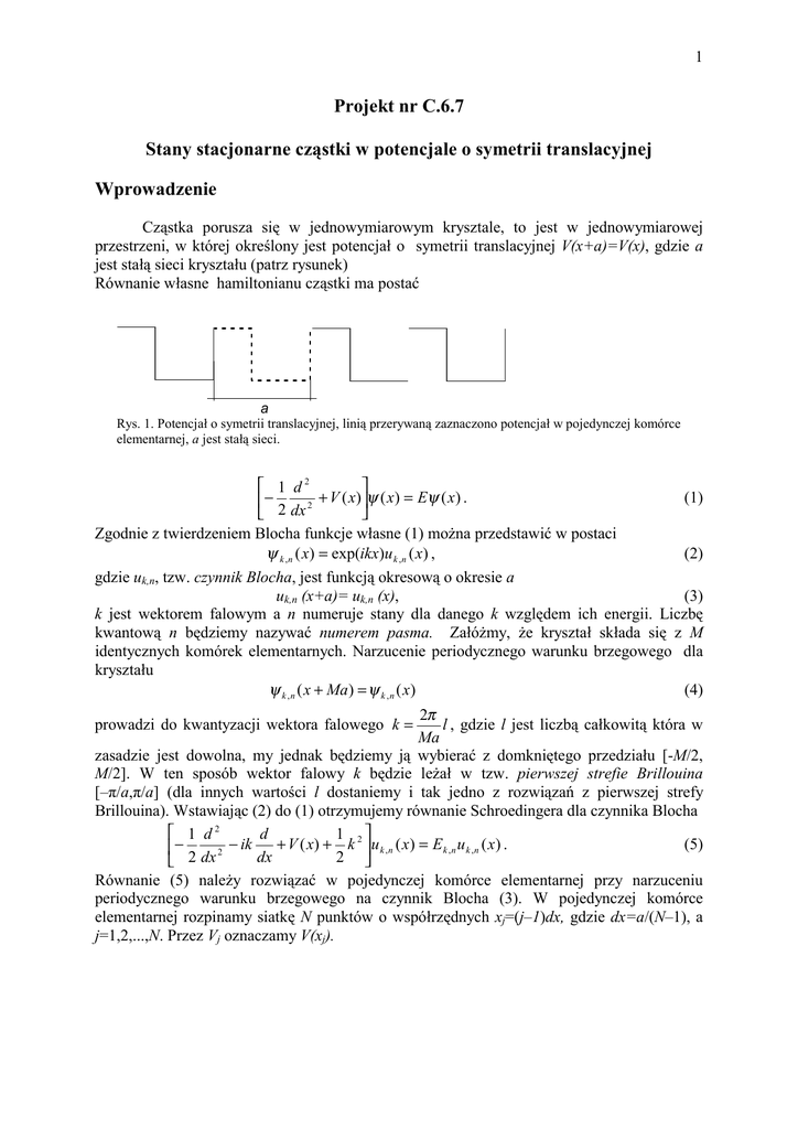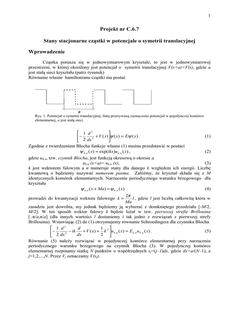 1 Projekt nr C.6.7 Stany stacjonarne cząstki w potencjale o symetrii translacyjnej Wprowadzenie Cząstka porusza się w jednowymiarowym krysztale, to jest w jednowymiarowej przestrzeni, w której określony jest potencjał o symetrii translacyjnej V(x+a)=V(x), gdzie a jest stałą sieci kryształu (patrz rysunek) Równanie własne hamiltonianu cząstki ma postać a Rys. 1. Potencjał o symetrii translacyjnej, linią przerywaną zaznaczono potencjał w pojedynczej komórce elementarnej, a jest stałą sieci. 1 d2 + V ( x)ψ ( x) = Eψ ( x) . (1) − 2 2 dx Zgodnie z twierdzeniem Blocha funkcje własne (1) można przedstawić w postaci ψ k ,n ( x) = exp(ikx)u k ,n ( x) , (2) gdzie uk,n, tzw. czynnik Blocha, jest funkcją okresową o okresie a (3) uk,n (x+a)= uk,n (x), k jest wektorem falowym a n numeruje stany dla danego k względem ich energii. Liczbę kwantową n będziemy nazywać numerem pasma. Załóżmy, że kryształ składa się z M identycznych komórek elementarnych. Narzucenie periodycznego warunku brzegowego dla kryształu ψ k , n ( x + Ma) = ψ k , n ( x) (4) 2π l , gdzie l jest liczbą całkowitą która w Ma zasadzie jest dowolna, my jednak będziemy ją wybierać z domkniętego przedziału [-M/2, M/2]. W ten sposób wektor falowy k będzie leżał w tzw. pierwszej strefie Brillouina [–π/a,π/a] (dla innych wartości l dostaniemy i tak jedno z rozwiązań z pierwszej strefy Brillouina). Wstawiając (2) do (1) otrzymujemy równanie Schroedingera dla czynnika Blocha 1 d2 d 1 − ik + V ( x) + k 2 u k , n ( x ) = E k , n u k , n ( x ) . (5) − 2 dx 2 2 dx Równanie (5) należy rozwiązać w pojedynczej komórce elementarnej przy narzuceniu periodycznego warunku brzegowego na czynnik Blocha (3). W pojedynczej komórce elementarnej rozpinamy siatkę N punktów o współrzędnych xj=(j–1)dx, gdzie dx=a/(N–1), a j=1,2,...,N. Przez Vj oznaczamy V(xj). prowadzi do kwantyzacji wektora falowego k = 2 x x x 1 2 x N+1 =x 1 Rys. 2 Potencjał i siatka punktów w pojedynczej komórce elementarnej oraz periodyczny warunek brzegowy. N Periodyczne warunki dla czynnika Blocha wprowadzimy identyfikując punkt o numerze N+1 z punktem pierwszym (por. Rys. 2). Wartość czynnika Blocha w punkcie xj oznaczymy przez uk,n,j , w skrócie przez uj. Zastępując pochodne w równaniu (5) przez ilorazy różnicowe d 2u u j +1 + u j −1 − 2u j du u j +1 − u j −1 ( 2 = , ) dostajemy równanie różnicowe = 2dx dx dx 2 dx bu j −1 + c j u j + b *u j +1 = Eu j , (6) 1 ik 1 1 b = − + oraz c j = 2 + V j + k 2 . 2 dx 2 2dx dx Równanie (6) z warunkiem brzegowym (3) można przedstawić w formie macierzowego równania własnego (7) Hu = Eu , gdzie gdzie H jest hermitowską macierzą Hamiltona o rozmiarze N na N, która posiada elementy niezerowe jedynie w H1N, HN1, oraz na diagonali, pod- i naddiagonali. Niezerowe elementy macierzowe H są następujące Hjj=cj, Hj(j+1)=b*, H(j+1)j=b, H1N=b, HN1=b*. Rozwiązanie równania (7) dla danego k da N wartości własnych energii, z których każda przynależeć będzie do innego pasma. Dla każdej wartości własnej energii dostaniemy wektor wartości czynnika Blocha uk,n w węzłach siatki. Zadania do wykonania Przyjąć stałą sieci a=2, oraz M=10 lub 20. Przyjąć potencjał V(x) w formie układu studni i barier, przedstawionej na rysunkach 1 i 2. Niech ¾ długości komórki elementarnej przypada na studnię, a reszta na barierę. Niech wartość potencjału w studni będzie równa 0, a wysokość bariery oznaczymy przez W. 1) Przygotować program rysujący osiem najniższych pasm, czyli widmo energii równania (7) w funkcji k dla k z pierwszej strefy Brillouina. 2) Zbadać dla jak dużego N wyniki przestają zależeć od liczby oczek siatki. 3) Zbadać krzywiznę pasm i szerokość przerw energetycznych w funkcji W, dla kilku wartości W z przedziału od 0 do 300. 4) Sprawdzić periodyczność czynnika Blocha. Jak wygląda gęstość prawdopodobieństwa związana z funkcją falowa (4) dla różnych pasm? 5) Jak się ona zmienia w ramach jednego pasma. Jak zmiany te zależą od W? Literatura C. Kittel, Wstęp do fizyki ciała stałego