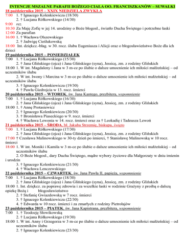 INTENCJE MSZALNE PARAFII BOŻEGO CIAŁA OO. FRANCISZKANÓW – SUWAŁKI 18 października 2015 – XXIX NIEDZIELA ZWYKŁA 7:00 1. † Ignacego Kolenkiewicza (18/30) 2. † Lucjana Rółkowskiego (14/30) 9:00 rez. 10:30 Za Maję Zofię w jej 14. urodziny o Boże błogosł., światło Ducha Świętego i potrzebne łaski 12:00 Za parafian 16:00 1. † Wacława Olszewskiego 2. † Jadwigę Cieślukowską 18:00 Int. dziękcz.-błag. w 30. rocz. ślubu Eugeniusza i Alicji oraz o błogosławieństwo Boże dla ich dzieci 19 października 2015 – PONIEDZIAŁEK 7:00 1. † Lucjana Rółkowskiego (15/30) 2. † Jana Glińskiego (ojca) i Jana Glińskiego (syna), Jessicę, zm. z rodziny Glińskich 18:00 1. W int. Magdaleny i Jana w 3 m-ce po ślubie o dalsze umocnienie ich miłości małżeńskiej – od uczestników ślubu 2. W int. Iwony i Marcina w 3 m-ce po ślubie o dalsze umocnienie ich miłości małżeńskiej – od uczestników ślubu 3. † Ignacego Kolenkiewicza (19/30) 4. † Pawła Giedrojcia w 13. rocz. śmierci 20 października 2015 – WTOREK, św. Jana Kantego, prezbitera, wspomnienie 7:00 1. † Lucjana Rółkowskiego (16/30) 2. † Jana Glińskiego (ojca) i Jana Glińskiego (syna), Jessicę, zm. z rodziny Glińskich 18:00 1. † Annę Protasiewicz 2. † Ignacego Kolenkiewicza (20/30) 3. † Bronisława Piaseckiego w 9. rocz. śmierci 4. † Wacława Lewonia w 14. rocz. śmierci oraz za † Leokadię i Tadeusza Lewoń 21 października 2015 – ŚRODA, bł. Jakuba Strzemię, biskupa, święto 7:00 1. † Lucjana Rółkowskiego (17/30) 2. † Jana Glińskiego (ojca) i Jana Glińskiego (syna), Jessicę, zm. z rodziny Glińskich 17:00 † Czesława Malinowskiego w 30-ty dzień po śmierci, † Stanisławę Malinowską w 10 rocz. śmierci 18:00 1. W int. Moniki i Kamila w 3 m-ce po ślubie o dalsze umocnienie ich miłości małżeńskiej – od uczestników ślubu 2. O Boże błogosł., dary Ducha Świętego, mądre wybory życiowe dla Małgorzaty w dniu imienin i urodzin 3. † Ignacego Kolenkiewicza (21/30) 4. † Wacława Lenczewskiego 22 października 2015 – CZWARTEK, św. Jana Pawła II, papieża, wspomnienie 7:00 1. † Lucjana Rółkowskiego (18/30) 2. † Jana Glińskiego (ojca) i Jana Glińskiego (syna), Jessicę, zm. z rodziny Glińskich 18:00 1. Int. dziękcz. za poprawę zdrowia i za wszelkie łaski w rodzinie Grażyny z prośbą o dalszą opiekę Bożą i błogosławieństwo 2. † Stefanię Gwiazdowską w 7 rocz. śmierci 3. † Ignacego Kolenkiewicza (22/30) 4. † Edwarda w 10 rocz. śmierci i za zmarłych z rodziny Pietrołajów 23 października 2015 – PIĄTEK, św. Jana Kapistrana, prezbitera, wspomnienie 7:00 1. † Teodozję Słowikowską 2. † Lucjana Rółkowskiego (19/30) 18:00 1. W int. Anny i Grzegorza w 3 m-ce po ślubie o dalsze umocnienie ich miłości małżeńskiej – od uczestników ślubu 2. † Ignacego Kolenkiewicza (23/30) 3. † Halinę Martynko 4. † Jana Glińskiego (ojca) i Jana Glińskiego (syna), Jessicę, zm. z rodziny Glińskich 24 października 2015 – SOBOTA 7:00 1. Int. dziękcz. za 6 lat małżeństwa Justyny i Pawła z prośbą o Bożą opiekę nad całą rodziną 2. † Ignacego Kolenkiewicza (24/30) 3. † Lucjana Rółkowskiego (20/30) 16:00 Msza św. Rycerstwa Niepokalanej dzieci i młodzieży 18:00 1. W int. Ewy i Piotra w 6 m-cy po ślubie o dalsze umocnienie ich miłości małżeńskiej – od uczestników ślubu 2. W 3. urodziny Oliwii – o Boże błogosławieństwo, zdrowie i wszelkie łaski dla niej 3. † Sabinę Brodowską w 7 rocz. śmierci 4. † zm. w czyśćcu cierpiących