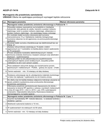 AE/ZP-27-74/16 Załącznik Nr 6 Wymagania dla przedmiotu zamówienia UWAGA! Oferta nie spełniająca poniższych wymagań będzie odrzucona L.p. Wymagane parametry Wpisać oferowane parametry Wymagania wobec przedmiotu zmówienia oferowanego w Pakiecie Nr 1 1. 2. 3. 4. 5. 6. 7. Wszystkie zestawy wyposażone są kompletnie w niezbędne odczynniki: żele gotowe do użytku, barwnik w postaci roztworu stężonego, bufor w postaci roztworu stężonego, odbarwiacz w postaci roztworu stężonego - nie zawierający kwasu octowego Do rozdziału białek surowicy stosowana jest surowica nierozcieńczona 10 µl. Nakładanie materiału biologicznego (surowica natywna) na żel agarozowy za pomocą jednorazowego aplikatora Rozdział białek surowicy charakteryzuje się stabilnością β lipo we frakcji β1 Zestawy odczynnikowe zawierają po 10 płytek z żelem agarozowym po 7 rozdziałów na każdej płytce (razem opakowanie to 70 oznaczeń) Proces utrwalania rozdziałów elektroforetycznych: metoda termiczna (metoda chemiczna z kwasem octowym oraz alkoholem etylowym - wyeliminowana) Aplikacja próbki na żel półautomatyczna (wyeliminowanie potencjalnych błędów przed analitycznych, wszystkie próbki nakładane na żel w tym samym czasie) Poza zestawem odczynnik służący do rozcieńczania surowic lipemicznych i nieklarownych - FlUIDIL - gotowy do użycia - 2 fiolki 8. Termin ważności - min. 10 miesięcy od daty dostawy 9. Dostawca zobowiązuje się do udostępnienia materiału kontrolnego w ilości nie większej 1 opakowanie na rok trwania umowy Do oferty oraz do każdej dostawy załączona instrukcja używania (w 10. języku polskim) wystawiona przez producenta oferowanego przedmiotu zamówienia Oferowany przedmiot zamówienia jest dopuszczony do obrotu i używania na terenie RP zgodnie z ustawą o wyrobach medycznych 11. z dnia 20 maja 2010 r. (Dz.U z 2015 r. poz. 876 z późniejszymi zmianami). Odpowiednie dokumenty Wykonawca dostarczy Zamawiającemu na każde żądanie Wymagania wobec przedmiotu zmówienia oferowanego w Pakiecie Nr 2 poz. 1 1. Czynnik reumatoidalny RF: metoda latexowa, w zestawie kontrola dodatnia i ujemna 2. Możliwość wykonania badania w 10 min., 3. W opakowaniach nie wiekszych niż 50 sztuk, 4. Termin ważności - min. 12 miesięcy od daty dostawy ...................................................................... Podpis osoby uprawnionej do złożenia oferty L.p. Wymagane parametry Wpisać oferowane parametry Do oferty oraz do każdej dostawy załączona instrukcja używania (w 5. języku polskim) wystawiona przez producenta oferowanego przedmiotu zamówienia Oferowany przedmiot zamówienia jest dopuszczony do obrotu i używania na terenie RP zgodnie z ustawą o wyrobach medycznych 6. z dnia 20 maja 2010 r. (Dz.U z 2015 r. poz. 876 z późniejszymi zmianami). Odpowiednie dokumenty Wykonawca dostarczy Zamawiającemu na każde żądanie Wymagania wobec przedmiotu zmówienia oferowanego w Pakiecie Nr 2 poz. 2 Czynnik reumatoidalny Waalere - Rose, metoda hemaglutynacji, 1. test do jakościowego i półilościowego oznaczania, w zestawie kontrola dodatnia i ujemna, 2. Możliwość wykonania badania w 10 min., 3. W opakowaniach nie wiekszych niż 50 sztuk, 4. Termin ważności - min. 12 miesięcy od daty dostawy Do oferty oraz do każdej dostawy załączona instrukcja używania (w 5. języku polskim) wystawiona przez producenta oferowanego przedmiotu zamówienia Oferowany przedmiot zamówienia jest dopuszczony do obrotu i używania na terenie RP zgodnie z ustawą o wyrobach medycznych 6. z dnia 20 maja 2010 r. (Dz.U z 2015 r. poz. 876 z późniejszymi zmianami). Odpowiednie dokumenty Wykonawca dostarczy Zamawiającemu na każde żądanie Wymagania wobec przedmiotu zmówienia oferowanego w Pakiecie Nr 2 poz. 3 1. Test do jakościowego oznaczania antystreptolizyny O-ASO, metoda lateksowa, w zestawie kontrola dodatnia i ujemna 2. Możliwość wykonania badania w 10 min., 3. W opakowaniach nie wiekszych niż 50 sztuk, 4. Termin ważności - min. 12 miesięcy od daty dostawy Do oferty oraz do każdej dostawy załączona instrukcja używania (w 5. języku polskim) wystawiona przez producenta oferowanego przedmiotu zamówienia Oferowany przedmiot zamówienia jest dopuszczony do obrotu i używania na terenie RP zgodnie z ustawą o wyrobach medycznych 6. z dnia 20 maja 2010 r. (Dz.U z 2015 r. poz. 876 z późniejszymi zmianami). Odpowiednie dokumenty Wykonawca dostarczy Zamawiającemu na każde żądanie Wymagania wobec przedmiotu zmówienia oferowanego w Pakiecie Nr 2 poz. 4 Kasetkowe testy immunochromatograficzne do jakościowego 1. oznaczania hemoglobiny ludzkiej w próbce kału - bez konieczności stosowania diety bezmięsnej 2. Kasetki posiadające pola: kontroli aktywności testu i testowe 3. Konfekcjonowanie do 50 oznaczeń w opakowaniu ...................................................................... Podpis osoby uprawnionej do złożenia oferty L.p. Wymagane parametry Wpisać oferowane parametry 4. Termin ważności min. 6 miesięcy od daty dostawy 5. Czułość testu dla hemoglobiny ludzkiej nie mniejsza niż 50 ng/ml. Swoistość - testy swoiste tylko dla hemoglobiny ludzkiej, nie dające 6. reakcji krzyżowych z hemoglobiną zwierzęcą ani z bilirubiną, witaminą C i peroksydazą chrzanową 7. Możliwość uzyskania wyniku do 10 min Testy gwarantujące czystą i bezpieczną pracę personelu (opisać na czym polega spełnienie wymogu) Gotowe do użycia kompletne zestawy zawierające wszystkie 9. elementy do przeprowadzenia procedury Do oferty oraz do każdej dostawy załączona instrukcja używania (w 10. języku polskim) wystawiona przez producenta oferowanego przedmiotu zamówienia Oferowany przedmiot zamówienia jest dopuszczony do obrotu i używania na terenie RP zgodnie z ustawą o wyrobach medycznych 11. z dnia 20 maja 2010 r. (Dz.U z 2015 r. poz. 876 z późniejszymi zmianami). Odpowiednie dokumenty Wykonawca dostarczy Zamawiającemu na każde żądanie 8