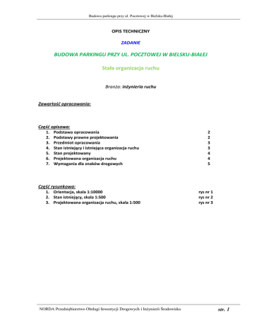 Budowa parkingu przy ul. Pocztowej w Bielsku-Białej OPIS TECHNICZNY ZADANIE BUDOWA PARKINGU PRZY UL. POCZTOWEJ W BIELSKU-BIAŁEJ Stała organizacja ruchu Branża: inżynieria ruchu Zawartość opracowania: Część opisowa: 1. 2. 3. 4. 5. 6. 7. Podstawa opracowania Podstawy prawne projektowania Przedmiot opracowania Stan istniejący i istniejąca organizacja ruchu Stan projektowany Projektowana organizacja ruchu Wymagania dla znaków drogowych 2 2 3 3 4 4 5 Część rysunkowa: 1. Orientacja, skala 1:10000 2. Stan istniejący, skala 1:500 3. Projektowana organizacja ruchu, skala 1:500 NORDA Przedsiębiorstwo Obsługi Inwestycji Drogowych i Inżynierii Środowiska rys nr 1 rys nr 2 rys nr 3 str. 1 1. Podstawa opracowania Podstawą opracowania jest: Umowa z Inwestorem Mapa sytuacyjno-wysokościowa w skali 1:500; Wizja w terenie- inwentaryzacja istniejącego oznakowania. Ustawa z dnia 20 czerwca 1997 r. – Prawo o ruchu drogowym (Dz. U. nr 98 poz. 602 z późniejszymi zmianami). Rozporządzenie Ministra Infrastruktury z dnia 23 września 2003 roku w sprawie szczegółowych warunków zarządzania ruchem na drogach oraz wykonywania nadzoru nad tym zarządzaniem (Dz. U. nr 177 poz. 1729 z 14 października 2003 r.) Rozporządzenie Ministrów Infrastruktury oraz Spraw Wewnętrznych i Administracji z dnia 31 lipca 2002 r. w sprawie znaków i sygnałów drogowych (Dz. U. nr 170 poz. 1393 z 12 października 2002 r.) Rozporządzenie Ministra Infrastruktury z dnia 3 lipca 2003 roku w sprawie szczegółowych warunków technicznych dla znaków i sygnałów drogowych oraz urządzeń bezpieczeństwa ruchu drogowego i warunków ich umieszczania na drogach (Dz. U. nr 220 poz. 1281 z 23 grudnia 2003 r.) 2. Przedmiot opracowania Przedmiotem niniejszego opracowania jest stała organizacja ruchu dla budowy parkingu przy ul. Pocztowej w Bielsku-Białej. str. 2 NORDA Przedsiębiorstwo Obsługi Inwestycji Drogowych i Inżynierii Środowiska Budowa parkingu przy ul. Pocztowej w Bielsku-Białej 3. Stan istniejący i istniejąca organizacja ruchu Planowana inwestycja w całym zakresie zlokalizowana jest na terenie zabudowanym miasta Bielsko-Biała i dotyczy ulicy Pocztowej w rejonie kościoła pw. NMP Królowej Świata oraz Urzędu Pocztowego. Ulica Pocztowa jest gminną ulicą klasy L1/2. Stanowi dojazd do terenów rekreacyjnych miasta – Cygańskiego Lasu. W stanie istniejącym, na przedmiotowym odcinku posiada szerokość ok. 5,5 m, nawierzchnia bitumiczna, chodnik obustronny przyjezdniowy. Teren projektowanego parkingu w stanie istniejącym zajęty jest przez chodnik o szerokości 1,0 m oraz teren zielony, w którym rośnie żywopłot wys. ok. 1,0 m oraz kilka drzew iglastych i liściastych. Część terenu jest ogrodzona. Przy ulicy, w okolicy Urzędu Pocztowego dopuszczony jest czasowy postój pojazdów częściowo na chodniku, na czas załatwiania spraw w Urzędzie. Jest to rozwiązanie nie do końca bezpieczne, parkujące samochody blokują zarówno bezpieczny przejazd jak i zawężają przejście pieszym. Na przedmiotowym odcinku ulicy obowiązuje strefowe ograniczenie prędkości do 40km/h. Przy budynku Urzędu znajduje się przejście dla pieszych, wyniesione na wybrukowanej wyspie stanowiącej jednocześnie urządzenie uspokojenia ruchu. Po zachodniej stronie ustawiony jest znak B-35 z dopiskiem „Ponad 5 min.”. Istniejące przejście dla pieszych jest odpowiednio oznakowane znakami D-6 wraz z tabliczką T-27. Dodatkowo o wyniesieniu niwelety przejścia dla pieszych ostrzegają znaki A-11a wraz z tabliczką T-1 „20 m”. Istniejącą organizację ruchu przedstawiono na rysunku nr 2 „Stan istniejący”. 4. Stan projektowany Ogólne założenia projektowe budowy parkingu stanowią: -poprawa bezpieczeństwa ruchu pojazdów i pieszych załatwiających sprawy w Urzędzie Pocztowym, -poprawa walorów estetycznych w rejonie inwestycji, -umożliwienie dogodnego i bezpiecznego przejazdu, -możliwie niewielka ingerencja w istniejące sieci uzbrojenia terenu, -dowiązanie się do istniejącej niwelety ulicy. Projektowana docelowa organizacja ruchu została przedstawiona na rysunku nr 2 „Projektowana organizacja ruchu”. Projektowane zmiany w organizacji ruchu obejmują: Oznakowanie pionowe niepełnosprawnych, projektowanych miejsc postojowych, NORDA Przedsiębiorstwo Obsługi Inwestycji Drogowych i Inżynierii Środowiska miejsca dla str. 3 Umieszczenie znaku B-36 przy jednoczesnej likwidacji znaku B-35 po zachodniej stronie ulicy, Wymianę oznakowania poziomego na przejściu dla pieszych, poziome oznakowanie miejsca dla niepełnosprawnych, Utrzymanie pozostałych istniejących znaków pionowych. 5. Wymagania dla znaków drogowych Znaki ustawiane w ramach stałej organizacji ruchu muszą spełniać następujące warunki: str. 4 Grupa wielkości tabliczek – MAŁA; Grupa wielkości znaków D-18 – ŚREDNIA; Grupa wielkości pozostałych znaków – ŚREDNIA; Lica znaków z folii odblaskowych I generacji; Słupki do znaków należy wykonać z rur stalowych ocynkowanych ф70 mm, malowane farbą poliwinylową; Słupki pod znaki wykonać w sposób trwały, z fundamentem z betonu klasy min. C12/15; W razie potrzeby wykonać przedłużki istniejących słupków; Tarcze znaków z blachy ocynkowanej o profilu odpornym na odginanie ręką, mocowane do słupków w sposób wykluczający obrót tarczy wokół słupka; Elementy mocujące z materiałów ocynkowanych; Wysokość mocowania znaków: - 2,2 m (w obszarze zabudowanym na chodnikach); Odległość krawędzi znaku od krawędzi jezdni (krawężnika): 0,5÷2,0 m; Liternictwo na tablicach należy stosować zgodnie z zasadami przyjętymi w odpowiednich rozporządzeniach; Oznakowanie poziome cienkowarstwowe barwy białej; Oznakowanie poziome powinno być dostrzegalne i czytelne. NORDA Przedsiębiorstwo Obsługi Inwestycji Drogowych i Inżynierii Środowiska
