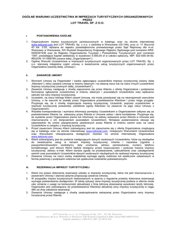 OGÓLNE WARUNKI UCZESTNICTWA W IMPREZACH TURYSTYCZNYCH ORGANIZOWANYCH PRZEZ LOT TRAVEL SP. Z O.O. I. 1. 2. II. 1. 2. 3. 4. 5. 6. 7. III. 1. 2. 3. POSTANOWIENIA OGÓLNE Organizatorem imprez turystycznych zamieszczonych w katalogu oraz na stronie internetowej www.lottravel.com jest LOT TRAVEL Sp. z o.o. z siedzibą w Warszawie (02-146), przy ul. 17 Stycznia 43 lok. 3.05, wpisana do rejestru przedsiębiorców prowadzonego przez Sąd Rejonowy dla m.st. Warszawy w Warszawie, XIII Wydział Gospodarczy Krajowego Rejestru Sądowego pod numerem KRS: 0000347436 oraz do Rejestru Organizatorów Turystyki i Pośredników Turystycznych pod numerem 1397, posiadająca kapitał zakładowy w wysokości 5.000,00 zł w całości opłacony, NIP: 522-000-34-92, REGON: 011566799 (zwana dalej „Organizatorem”). Ogólne Warunki Uczestnictwa w imprezach turystycznych organizowanych przez LOT TRAVEL Sp. z o.o. stanowią integralna część umowy o świadczenie usług turystycznych organizowanych przez Organizatora (zwanej dalej „Umową”). ZAWARCIE UMOWY Stronami Umowy są Organizator i osoba zgłaszająca uczestników imprezy turystycznej (zwany dalej „Klientem”), który zawiera Umowę w imieniu własnym i na własną rzecz lub na rzecz innych uczestników imprezy turystycznej (zwanych dalej „Uczestnikami”). Zawarcie Umowy następuje z chwilą zapoznania się przez Klienta z ofertą Organizatora i podpisania formularza zgłoszenia uczestnictwa w imieniu własnym i pozostałych Uczestników oraz wpłaceniu zaliczki lub ceny imprezy turystycznej. Uczestnik, na rzecz którego Klient zawarł Umowę, nie może powoływać się na nieznajomość warunków Umowy, o ile warunki te zostały przez Organizatora przedstawione Klientowi i przez niego przyjęte. Przyjmuje się, że z chwilą rozpoczęcia imprezy turystycznej, Uczestnik, poprzez uczestnictwo w imprezie turystycznej potwierdza udzielenie zgody Klientowi na zawarcie na jego rzecz Umowy z Organizatorem. Wszelka korespondencja i wymiana informacji pomiędzy Uczestnikami a Organizatorem odbywa się za pośrednictwem Klienta na wskazany przez Klienta w Umowie adres i dane kontaktowe. Przyjmuje się, że wysłanie przez Organizatora pisma lub informacji na adresy wskazane przez Klienta w Umowie jest równoznaczne z ich doręczeniem pozostałym Uczestnikom. Niniejsze postanowienia stosuje się odpowiednio do umów ubezpieczenia zawieranych przez Klienta w imieniu swoim oraz na rzecz Uczestników w związku z imprezą turystyczną. Przed zawarciem Umowy Klient zobowiązany jest do zapoznania się z ofertą Organizatora znajdującą się w katalogu oraz na stronie internetowej www.lottravel.com, niniejszymi Warunkami Uczestnictwa oraz Warunkami Ubezpieczenia dostępnymi również na stronie internetowej Organizatora www.lottravel.com. Klient zobowiązany jest do podania następujących danych osobowych Uczestników, które są niezbędne do świadczenia usług w ramach imprezy turystycznej: imienia i nazwiska (zgodne z paszportem/dowodem osobistym), daty urodzenia, adresu zamieszkania, numeru telefonu kontaktowego, pod którym Klient będzie dostępny przed rozpoczęciem i podczas trwania imprezy turystycznej, adresu e-mail. Klient wyraża zgodę na przetwarzanie, uaktualnianie oraz udostępnianie swoich oraz pozostałych Uczestników danych osobowych niezbędnych do realizacji imprezy turystycznej Zawarcie Umowy na rzecz osoby małoletniej wymaga zgody rodziców lub opiekunów ustawowych w formie pisemnej z podpisami rodziców lub opiekunów notarialnie poświadczonymi. REZERWACJA IMPREZY TURYSTYCZNEJ Klient ma prawo dokonania rezerwacji udziału w imprezie turystycznej, która nie jest równoznaczna z zawarciem Umowy i stanowi jedynie propozycję zawarcia Umowy. W przypadku imprez turystycznych realizowanych w oparciu o regularne przeloty dokonana rezerwacja wymaga potwierdzenia dostępności. W takiej sytuacji cena imprezy turystycznej podana w ofercie może ulec zmianie z uwagi na konieczność aktualizacji z linią lotniczą stosowanej wysokości taryfy lotniczej. Organizator jest zobowiązany do przedstawienia Klientowi aktualnej ceny imprezy turystycznej w ciągu 48h od dnia założenia rezerwacji. Zawarcie Umowy następuje z chwilą zaakceptowania wskazanej przez Organizatora ceny imprezy turystycznej przez Klienta. LOT Travel Sp. z o. o. ul. 17 Stycznia 43 lok. 3.05. , 02-146 Warszawa Sąd Rejonowy dla m.st. Warszawy w Warszawie XIII Wydział Gospodarczy KRS, numer KRS 0000347436, Kapitał zakładowy 5 000 PLN, NIP: 522 00 03 492 IV. 1. 2. a) b) c) ODWOŁANIE IMPREZY TURYSTYCZNEJ PRZEZ ORGANIZATORA Organizator zastrzega sobie prawo do odwołania imprezy turystycznej z przyczyn od siebie niezależnych, w szczególności z powodu decyzji władz państwowych lub organizacji międzynarodowych, działania Siły Wyższej, aktów terrorystycznych, strajków, zamieszek, działań wojennych, epidemii itp. W takiej sytuacji Uczestnik ma prawo do zwrotu pełnej wpłaty dokonanej za imprezę turystyczną, a jeżeli odwołanie imprezy turystycznej następuje w dniu jej rozpoczęcia również udokumentowanych i uzasadnionych kosztów, poniesionych w związku z przybyciem na miejsce zbiórki określone w programie imprezy turystycznej. Zwrot dokonanych przez Klienta wpłat nastąpi w terminie 7 dni od dnia odwołania imprezy turystycznej. W takiej sytuacji Organizator może zaproponować Uczestnikowi udział w imprezach zastępczych. Organizator zastrzega sobie prawo do odwołania imprezy turystycznej także z powodu nie osiągnięcia zakładanego minimum uczestników na daną imprezę turystyczną. Zawiadomienie o odwołaniu imprezy turystycznej powinno nastąpić najpóźniej na 14 dni przed datą jej rozpoczęcia na piśmie. W takiej sytuacji Klient może według swego wyboru: wyrazić zgodę na uczestnictwo w imprezie zastępczej o tym samym lub wyższym standardzie w terminie zaproponowanym przez Organizatora. wyrazić zgodę na udział w imprezie turystyczn