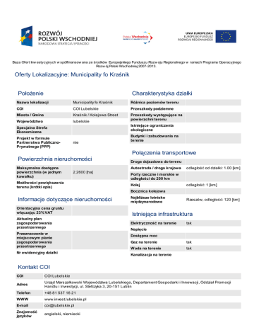 Baza Ofert Inw estycyjnych w spółfinansow ana ze środków Europejskiego Funduszu Rozw oju Regionalnego w ramach Programu Operacyjnego Rozw ój Polski Wschodniej 2007-2013. Oferty Lokalizacyjne: Municipality fo Kraśnik Położenie Charakterystyka działki Nazwa lokalizacji Municipality fo Kraśnik Różnica poziomów terenu COI COI Lubelskie Przeszkody podziemne Miasto / Gmina Kraśnik / Kolejowa Street Województwo lubelskie Przeszkody występujące na powierzchni terenu Istniejące ograniczenia ekologiczne Specjalna Strefa Ekonomiczna Projekt w formule Partnerstwa PublicznoPrywatnego (PPP) nie Budynki i zabudowania na terenie Połączenia transportowe Powierzchnia nieruchomości Maksymalna dostępna powierzchnia (w jednym kawałku) Droga dojazdowa do terenu Autostrada / droga krajowa 2.2600 [ha] Możliwości powiększenia terenu (krótki opis) odległość od działki: 1.00 [km] Porty rzeczne i morskie w odległości do 200 km Kolej odległość: 1 [km] Bocznica kolejowa Informacje dotyczące nieruchomości Orientacyjna cena gruntu włączając 23% VAT Aktualny plan zagospodarowania przestrzennego Przeznaczenie w miejscowym planie zagospodarowania przestrzennego Nr ewidencyjny działki Najbliższe lotnisko międzynarodowe Rzeszów, odległość: 120 [km] Istniejąca infrastruktura Elektryczność na terenie tak Napięcie Dostępna moc Gaz na terenie tak Woda na terenie tak Kanalizacja na terenie Kontakt COI COI COI Lubelskie Adres Urząd Marszałkowski Województwa Lubelskiego, Departament Gospodarki i Innowacji, Oddział Promocji Handlu i Inwestycji, ul. Stefczyka 3, 20-151 Lublin Telefon +48 81 537 16 21 WWW www.invest.lubelskie.pl E-mail [email protected] Znajomość języków angielski, niemiecki Wydruk z: 2017-03-06 22:56:25 2012 © Polska Wschodnia. Wszelkie prawa zastrzeżone.