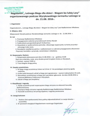 ..,'i NADLESNOTWO WTODAWA SUSZNO ul' Wsp6lna 8 22-2AO Wt rer oDAwA l-eSnego Biegu dla dzieci - Biegam bo lubiq Lasy" organizowanego podczas Wyrykowskiego Jarmarku Le6nego w 82572"R'6Huffi?1ilifo,, dn. 21.08.20tG r. l. Organizator Organizatorem ,, LeSnego Biegu dla dzieci - Biegam bo lubiq Lasy" jest NadleSnictwo Wtodawa. ll. Miejsce, data MiejscowoSi Wyryki podczas Wyrykowskiego Jarmarku Le6nego lll. w dn. 21.O8.2OL6 r' Cel 1. Promocja NadleSnictwa Wtodawa . 2. Propagowanie walor6w przyrodniczych Gminy Wyryki 3. Podkre6lanie pozaqrodukcyjnych funkcji lasu. 4. Wywotanie w spofeczeristwa potrzeby aktywnego wypoczynku na tonie przyrody i zdrowego trYbu 2Ycia. 4. Rozwijanie wsp6tpracy gminy z nadle6nictwem w zakresie propagowania aktywno6ci Fizycznej i kontaktu zprzyrodq w6r6d dzieci i mtodzie2y. lll. Rozpoczqcie, Dystans na godzinq L4,00 L. Rozpoczqcie planowane jest dnia 21.08'2016 r. Start przy wiatraku, meta przy drodze przed Urzqdem Gminy w Wyrykach. 2. Dystans wynosi 1500 m. 3. Trasa biegnie drogq Polnq' I lV. Zasady uczestnictwa. L. W biegu mogE uczestniczyd dzieci od 1-0 do L2 lat posiadajqce pisemnq zgodq ^. rodzic6w. 2. Liczba os6b biorqcych udziat w biegu jest ograniczona - wynosi maksymalnie 20 os6b. 3. Warunkiem uczestnictwa w biegu jest uprzednie zgloszenie do dnia 18.08.2016 w Gminnej Bibliotece Publicznej w Wyrykach. 4. Udziat w Biegu jest bezPlatnY. r V. Klasyfikacje i nagrody 1. Ka2dy uczestnik przed rozpoczqciem biegu otrzyma na wtasno36 koszulkq okolicznoSciowq 2. Zwy ciqzca biegu otrzyma nagrod q N ad leSniczego N ad le6nictwa Wlodawa 3. Pozostali uczestniczy otrzymajq dyplomy i nagrody pocieszenia Vl. Uwagi koricowe L. Rodzice (lub opiekunowie) biorq petnq odpowiedzialno66 za swoje dziecko - uczestnika. 2. W sprawach nieujqtych Regulaminem rozstrzyga Organizator. zy Koink