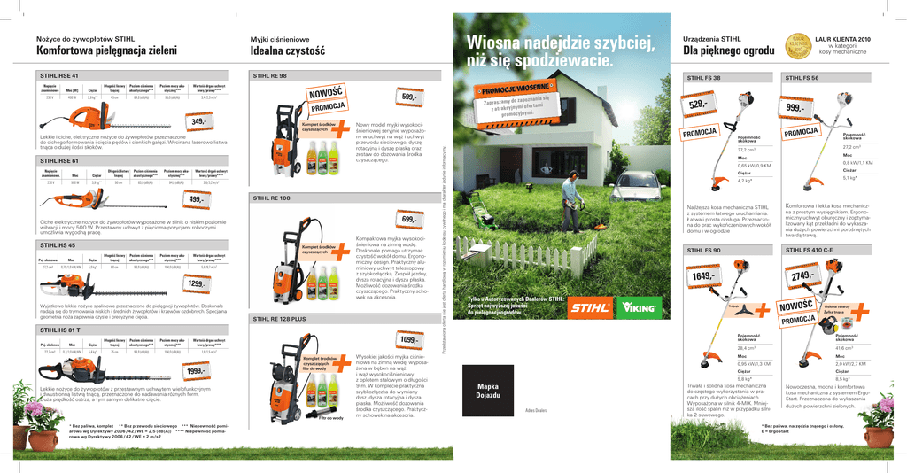 Nożyce do żywopłotów STIHL Komfortowa pielęgnacja zieleni Idealna czystość STIHL HSE 41 Moc [W] 230 V 400 W STIHL RE 98 Ciężar Długość listwy tnącej Poziom ciśnienia akustycznego*** Poziom mocy akustycznej*** Wartość drgań uchwyt lewy/prawy**** 2,9 kg** 45 cm 84,0 (dB(A)) 95,0 (dB(A)) 3,4/2,3 m/s2 NOWOŚĆ A PROMOCJ 349,- Komplet środków czyszczących Lekkie i ciche, elektryczne nożyce do żywopłotów przeznaczone do cichego formowania i cięcia pędów i cienkich gałęzi. Wycinana laserowo listwa tnąca o dużej ilości skoków. STIHL HSE 61 Napięcie znamionowe. Moc 230 V 500 W Ciężar Długość listwy tnącej Poziom ciśnienia akustycznego*** Poziom mocy akustycznej*** Wartość drgań uchwyt lewy/prawy**** 3,9 kg** 50 cm 83,0 (dB(A)) 94,0 (dB(A)) 3,6/3,2 m/s2 499,- Poj. skokowa Moc Ciężar Długość listwy tnącej Poziom ciśnienia akustycznego*** Poziom mocy akustycznej*** Wartość drgań uchwyt lewy/prawy**** 27,2 cm³ 0,75/1,0 kW/KM 5,0 kg* 60 cm 98,0 (dB(A)) 104,0 (dB(A)) 5,6/9,7 m/s2 Nowy model myjki wysokociśnieniowej seryjnie wyposażony w uchwyt na wąż i uchwyt przewodu sieciowego, dyszę rotacyjną i dyszę płaską oraz zestaw do dozowania środka czyszczącego. 699,- Komplet środków czyszczących 1299,Wyjątkowo lekkie nożyce spalinowe przeznaczone do pielęgncji żywopłotów. Doskonale nadają się do trymowania niskich i średnich żywopłotów i krzewów ozdobnych. Specjalna geometria noża zapewnia czyste i precyzyjne cięcia. 599,- STIHL RE 108 Ciche elektryczne nożyce do żywopłotów wyposażone w silnik o niskim poziomie wibracji i mocy 500 W. Przestawny uchwyt z pięcioma pozycjami roboczymi umożliwia wygodną pracę. STIHL HS 45 Kompaktowa myjka wysokociśnieniowa na zimną wodę. Doskonale pomaga utrzymać czystość wokół domu. Ergonomiczny design. Praktyczny aluminiowy uchwyt teleskopowy z szybkozłączką. Zespół jezdny, dysza rotacyjna i dysza płaska. Możliwość dozowania środka czyszczącego. Praktyczny schowek na akcesoria. STIHL RE 128 PLUS STIHL HS 81 T Poj. skokowa Moc Ciężar Długość listwy tnącej Poziom ciśnienia akustycznego*** Poziom mocy akustycznej*** Wartość drgań uchwyt lewy/prawy**** 22,7 cm³ 0,7/1,0 kW/KM 5,4 kg* 75 cm 94,0 (dB(A)) 104,0 (dB(A)) 1,6/1,5 m/s2 1999,- 1099,Komplet środków czyszczących, filtr do wody Lekkie nożyce do żywopłotów z przestawnym uchwytem wielofunkcyjnym i dwustronną listwą tnącą, przeznaczone do nadawania różnych form. Duża prędkość ostrza, a tym samym delikatne cięcie. Filtr do wody * Bez paliwa, komplet ** Bez przewodu sieciowego *** Niepewność pomiarowa wg Dyrektywy 2006 / 42 / WE = 2,5 (dB(A)) **** Niepewność pomiarowa wg Dyrektywy 2006 / 42 / WE = 2 m/s2 Urządzenia STIHL Wysokiej jakości myjka ciśnieniowa na zimną wodę, wyposażona w bęben na wąż i wąż wysokociśnieniowy z oplotem stalowym o długości 9 m. W komplecie praktyczna szybkozłączka do wymiany dysz, dysza rotacyjna i dysza płaska. Możliwość dozowania środka czyszczącego. Praktyczny schowek na akcesoria. poznania się Zapraszamy do za er tami of i ym yjn kc ra at z promocyjnymi. LAUR KLIENTA 2010 w kategorii kosy mechaniczne Dla pięknego ogrodu STIHL FS 38 STIHL FS 56 529,A PROMOCJ Przedstawiona oferta nie jest ofertą handlową w rozumieniu kodeksu cywilnego i ma charakter jedynie informacyjny. Napięcie znamionowe Wiosna nadejdzie szybciej, niż się spodziewacie. Myjki ciśnieniowe 999,A PROMOCJ Pojemność skokowa Pojemność skokowa 27,2 cm3 27,2 cm3 Moc Moc 0,8 kW/1,1 KM 0,65 kW/0,9 KM Ciężar Ciężar 5,1 kg* 4,2 kg* Najlżejsza kosa mechaniczna STIHL z systemem łatwego uruchamiania. Łatwa i prosta obsługa. Przeznaczona do prac wykończeniowych wokół domu i w ogrodzie Komfortowa i lekka kosa mechanicz- STIHL FS 90 STIHL FS 410 C-E 2749,- 1649,Tylko u Autoryzowanych Dealerów STIHL: Sprzęt najwyższej jakości do pielęgnacji ogrodów. NOWOŚĆ Trójząb A PROMOCJ Adres Dealera Osłona twarzy Żyłka tnąca Pojemność skokowa Pojemność skokowa 28,4 cm3 41,6 cm3 Moc Moc 0,95 kW/1,3 KM 2,0 kW/2,7 KM Ciężar Ciężar 5,8 kg* Mapka Dojazdu na z prostym wysięgnikiem. Ergonomiczny uchwyt oburęczny i zoptymalizowany kąt przekładni do wykaszania dużych powierzchni porośniętych twardą trawą. 8,5 kg* Trwała i solidna kosa mechaniczna do częstego wykorzystania w pracach przy dużych obciążeniach. Wyposażona w silnik 4-MIX. Mniejsza ilość spalin niż w przypadku silnika 2-suwowego. Nowoczesna, mocna i komfortowa kosa mechaniczna z systemem ErgoStart. Przeznaczona do wykaszania dużych powierzchni zielonych. * Bez paliwa, narzędzia tnącego i osłony, E = ErgoStart Pilarki spalinowe Zawsze bogaty wybór Kosiarki VIKING Urządzenia akumulatorowe STIHL MS 170 D STIHL FSA 65 Zadbany ogród STIHL HSA 85 VIKING ME 339 799,- 679,Poręczny model podstawowy ze sprawdzonym wyposażeniem standardowym i katalizatorem. Doskonała do przygotowania drewna opałowego i prac budowlanych. Spełnia wymogi europejskiej dyrektywy dotyczącej emisji spalin EU II. 1099,- 979,- 1069,-* 749,-* VIKING MB 545 T VIKING MB 443 X VIKING MB 248 1999,Z VIKING ReadyStart Innowacje 2009 Złoty Medal STIHL MS 211 1099,Komfortowa pilarka spalinowa STIHL o niskim poziomie wibracji, przeznaczona do przygotowania drewna opałowego, prac budowlanych oraz ścinki mniejszych drzew. Cicha, lekka i poręczna, akumulatorowa kosa STIHL FSA 65, wyposażona w żyłkową głowicę tnącą AutoCut C 4-2. Przeznaczona do prac wykończeniowych w przydomowym ogrodzie i do zastosowań na obszarach wymagających zachowania ciszy. *Cena bez akumulatora i ładowarki 1999,-** 1499,Bardzo korzystny stosunek ciężaru do mocy. Idealna do prac budowlanych w drewnie i ścinki drzew o mniejszej średnicy. Odpowiednia do pozyskiwania drewna opałowego. A PROMOCJ STIHL MSA 160 C-BQ Lithium-Ion PRO Typ silnika: Moc: Szer. koszenia: 1.200 W 37 cm Typ silnika: Briggs & Stratton; Seria 450 Pow. koszenia: d