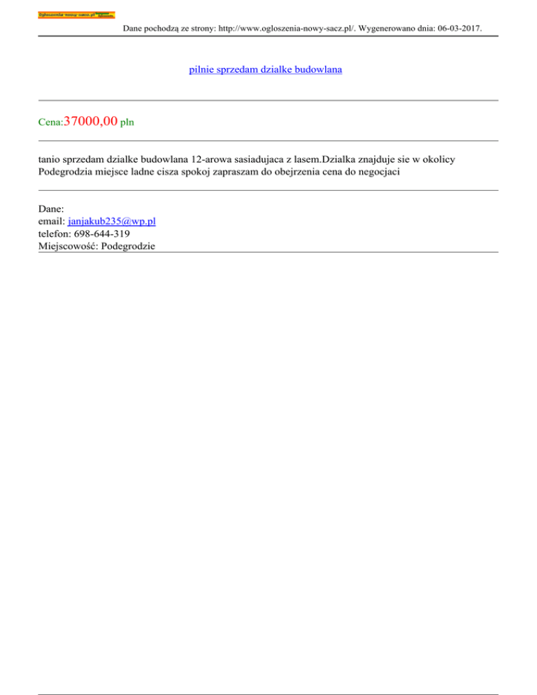 Dane pochodzą ze strony: http://www.ogloszenia-nowy-sacz.pl/. Wygenerowano dnia: 06-03-2017. pilnie sprzedam dzialke budowlana Cena:37000,00 pln tanio sprzedam dzialke budowlana 12-arowa sasiadujaca z lasem.Dzialka znajduje sie w okolicy Podegrodzia miejsce ladne cisza spokoj zapraszam do obejrzenia cena do negocjaci Dane: email: [email protected] telefon: 698-644-319 Miejscowość: Podegrodzie