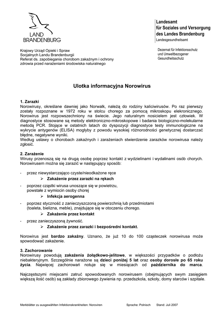 Landesamt für Soziales und Versorgung des Landes Brandenburg Landesgesundheitsamt Dezernat für Infektionsschutz und Umweltbezogener Gesundheitsschutz Krajowy Urząd Opieki i Spraw Socjalnych Landu Brandenburgii Referat ds. zapobiegania chorobom zakaźnym i ochrony zdrowia przed narażeniami środowiska naturalnego Ulotka informacyjna Norowirus 1. Zarazki Norowirusy, określane dawniej jako Norwalk, należą do rodziny kaliciwirusów. Po raz pierwszy zostały rozpoznane w 1972 roku w stolcu chorego za pomocą mikroskopu elekronicznego. Norowirus jest rozpowszechniony na świecie. Jego naturalnym nosicielem jest człowiek. W diagnostyce stosowane są metody elektroniczno-mikroskopowe i badania biologiczno-molekularne metodą PCR. Stojące w ostatnich latach do dyspozycji diagnostyce testy immunologiczne na wykrycie antygenów (ELISA) mogłyby z powodu wysokiej różnorodności genetycznej dostarczać błędne, negatywne wyniki. Według ustawy o chorobach zakaźnych i zarażeniach stwierdzenie zarazków norowirusa należy zgłosić. 2. Zarażenie Wirusy przenoszą się na drugą osobę poprzez kontakt z wydzielinami i wydalinami osób chorych. Norowirusem można się zarazić w następujący sposób: - przez niewystarczająco czyste/nieodkażone ręce Zakażenie przez zarazki na rękach - poprzez cząstki wirusa unoszące się w powietrzu, powstałe z wymiocin osoby chorej Infekcja aerogenna - poprzez styczność z zanieczyszczoną powierzchnią lub przedmiotami (toaleta, bielizna, meble), znajdujące się w otoczeniu chorego. Zakażenie przez kontakt - przez zanieczyszoną żywność. Zakażenie przez zarazki i bezpośredni kontakt. Norowirus jest bardzo zakaźny. Uznano, że już 10 do 100 cząsteczek norowirusa może spowodować zakażenie. 3. Zachorowanie Norowirusy powodują zakażenia żołądkowo-jelitowe, w większości przypadków o podłożu niebakteryjnym. Szczególnie narażone są dzieci poniżej 5 lat oraz osoby dorosłe po 65 roku życia. Najwięcej zachorowań notuje się w miesiącach od października do marca. Najczęstszymi miejscami zatruć spowodowanych norowirusem (obejmujących swym zasięgiem większą ilość osób) są zakłady zbiorowego żywienia np. przedszkola, szkoły, domy starców i szpitale. Merkblätter zu ausgewählten Infektionskrankheiten: Noroviren Sprache: Polnisch Stand: Juli 2007 Landesamt für Soziales und Versorgung des Landes Brandenburg Seite 2 Landesgesundheitsamt W ciągu 6 do 40 godzin od momentu zarażenia się, rozwija się ostre zapalenie żołądka i jelita cienkiego (gastroenteritis), objawiające się mdłościami, nagłymi wymiotami i wodnistymi biegunkami. Rzadziej występuje gorączka. Na skutek ubytku płynów w organiźmie, chory czuje się zmęczony i osłabiony. Często towarzyszą chorobie skręcające bóle brzucha, ból głowy i kończyn. Intensywność symptomów bywa w różnych przypadkach różna. Po 1 - 2 dniach symptomy chorobowe ustają. Z wymiocinami i ze stolcem wydalane są duże ilości wirusów. Znajdujące się w wydalinach wirusy 48 - 72 godzin po ustąpieniu symptomów klinicznych są bardzo zakaźne. W niektórych przypadkach proces ten trwa jeszcze dłużej (do kilku tygodni). Leczenie jest objawowe. Przede wszystkim polega ono na uzupełnieniu w organiźmie płynów i soli mineralnych. Wskazane jest leżenie w łóżku i odpoczynek. 4. Zapobieganie Zaszczepienie się przeciw norowirusom jest w tej chwili niemożliwe. Podstawowe znaczenie w profilaktyce ma zachowanie zasad higieny osobistej. Szczególnie ważne jest ono u osób pracujących w zakładach zbiorowego żywienia i w placówkach obejmujących swym zasięgiem większą ilość osób. W otoczeniu chorego należy zachować szczególną ostrożność. - Zastawę stołową można myć w zmywarce lub w ręku z dodatkiem płynu do zmywania. Zabrudzoną stolcem lub/i wycinami beliznę należy uprać możliwie w temperaturze > 60°C. Pieluszki lub chusteczki jednarazowego użytku, zabrudzone wymiocinmi, należy wyrzucić do wodoszczególnych worków foliowych i jak najszybciej usunąć. Chore dzieci nie mogą chodzić do żłobka, przedszkola, szkoły itp. Osoby zatrudnione w zakładach zbiorowego żywienia i placówkach obejmujących swym zasięgiem większą ilość osób nie powinny podczas choroby pracować. Mogą powrócić do pracy najwcześniej po 2 dniach od ustąpienia symptomów chorobowych i po konsultacji z lekarzem zakładowym lub rodzinnym. Odwiedzający mieszkańców wspólnot, czy ośrodków z infekcją norowirusową, powinni ściśle dostosować się do zaleceń personelu. Należą do nich: - izolacja chorego - ograniczenie częstotliwości odwiedzin - założenie przez odwiedzających, przed wejściem do pokoju, fartucha ochronnego lub maseczki ochronnej na usta i nos. Odwiedzający powinni po zdjęciu fartucha i przed opuszczeniem pokoju przeprowadzić dezynfekcję rąk specjalnym płynem antywirusowym. Kontakt: dr M. Seewald tel. Fax: 033702-71150 033702-71199 [email protected] Ulotki informacyjne dotyczące niektórych chorób zakaźnych – Norowirusy: MBLGA016/A Krajowy Wydział Zdrowia w LASV Merkblätter zu ausgewählten Infektionskrankheiten: Noroviren Sprache: Polnisch stan: lipiec 2007 Stand: Juli 2007