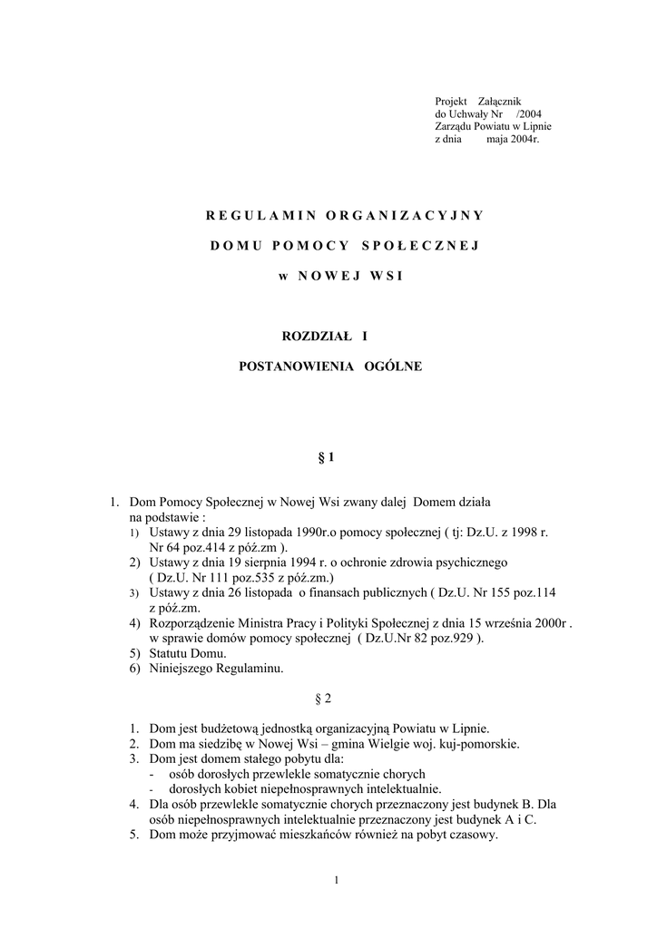 Projekt Załącznik do Uchwały Nr /2004 Zarządu Powiatu w Lipnie z dnia maja 2004r. REGULAMIN ORGANIZACYJNY DOMU POMOCY SPOŁECZNEJ w NOWEJ WSI ROZDZIAŁ I POSTANOWIENIA OGÓLNE §1 1. Dom Pomocy Społecznej w Nowej Wsi zwany dalej Domem działa na podstawie : 1) Ustawy z dnia 29 listopada 1990r.o pomocy społecznej ( tj: Dz.U. z 1998 r. Nr 64 poz.414 z póź.zm ). 2) Ustawy z dnia 19 sierpnia 1994 r. o ochronie zdrowia psychicznego ( Dz.U. Nr 111 poz.535 z póź.zm.) 3) Ustawy z dnia 26 listopada o finansach publicznych ( Dz.U. Nr 155 poz.114 z póź.zm. 4) Rozporządzenie Ministra Pracy i Polityki Społecznej z dnia 15 września 2000r . w sprawie domów pomocy społecznej ( Dz.U.Nr 82 poz.929 ). 5) Statutu Domu. 6) Niniejszego Regulaminu. §2 1. Dom jest budżetową jednostką organizacyjną Powiatu w Lipnie. 2. Dom ma siedzibę w Nowej Wsi – gmina Wielgie woj. kuj-pomorskie. 3. Dom jest domem stałego pobytu dla: - osób dorosłych przewlekle somatycznie chorych - dorosłych kobiet niepełnosprawnych intelektualnie. 4. Dla osób przewlekle somatycznie chorych przeznaczony jest budynek B. Dla osób niepełnosprawnych intelektualnie przeznaczony jest budynek A i C. 5. Dom może przyjmować mieszkańców również na pobyt czasowy. 1 §3 W Domu zamieszkują osoby skierowane decyzją wydaną w trybie i na zasadach określonych w ustawie o pomocy społecznej i ustawami o ochronie zdrowia psychicznego i przepisach wykonawczych do tych ustaw. §4 Celem Domu jest zapewnienie mieszkańcom całodobowej opieki oraz zaspokajanie niezbędnych potrzeb bytowych, społecznych i religijnych na poziomie obowiązujących standardów. ROZDZIAŁ II Zakres i poziom świadczonych usług §5 1. Standard świadczonych usług Domu dostosowuje się do indywidualnych potrzeb i możliwości psychofizycznych mieszkańców Domu. 2. Dom zapewnia w szczególności: a/ w zakresie potrzeb bytowych: -miejsce zamieszkania -wyżywienie -utrzymanie czystości b/ usługi opiekuńcze polegające na: -udzielaniu pomocy w podstawowych czynnościach życiowych -podnoszeniu sprawności i aktywności mieszkańców -niezbędnej pomocy w załatwianiu spraw osobistych c/ usługi wspomagające polegające na: -umożliwieniu udziału w terapii zajęciowej -umożliwieniu realizacji potrzeb religijnych i kulturalnych -zapewnieniu warunków do rozwoju samorządności mieszkańców, stymulowaniu nawiązywania, utrzymania i rozwijania kontaktu z rodziną i środowiskiem -działaniu zmierzającym do usamodzielnienia mieszkańca w miarę jego możliwości. 3. Dom umożliwia mieszkańcom korzystanie z przysługujących na podstawie odrębnych przepisów świadczeń zdrowotnych oraz pokrywa opłaty ryczałtowe i częściową odpłatność do wysokości limitu ceny, przewidziane w przepisach o powszechnym ubezpieczeniu zdrowotnym. Dom może również pokrywać wydatki ponoszone na niezbędne usługi pielęgnacyjne w zakresie wykraczającym poza uprawnienia wynikające z przepisów o powszechnym ubezpieczeniu zdrowotnym. 2 ROZDZIAŁ III Prawa i obowiązki mieszkańców Domu § 6 1. Mieszkaniec Domu ma prawo w szczególnosci do: -godnego traktowania, intymności i niezależności, -uzyskania pełnej informacji o usługach świadczonych przez Dom i korzystania z nich, -pomocy w zaspakajaniu potrzeb osobistych i w zapewnieniu sobie ochrony prawnej, -uczestniczenia w podejmowaniu decyzji w sprawach dotyczących jego osoby, -przyjmowania odwiedzin krewnych i znajomych, -przebywania poza Domem, po uprzedzeniu Dyrektora lub osoby upoważnionej do przyjmowania takich zgłoszeń. 2. Do obowiązków każdego mieszkańca należy: -współpraca z personelem w zaspakajaniu swoich podstawowych potrzeb, -dbanie na miarę jego możliwości o higienę osobistą, wygląd zewnętrzny oraz porządek w swoich rzeczach i wokół siebie, -przestrzeganie norm i zasad współżycia oraz zarządzeń porządkowych, -przyczynianie się do dobrej atmosfery w Domu oraz prawidłowego jego funkcjonowania, -dbałość o mienie Domu, -ponoszenie opłat za pobyt w Domu zgodnie z obowiązującymi przepisami. § 7 Dom zapewnia mieszkańcom bezpieczne przechowywanie środków pieniężnych i przedmiotów wartościowych. ROZDZIAŁ IV Organizacja wewnętrzna Domu § 8 1. Na czele Domu stoi dyrektor, który kieruje działalnością Domu i jest za niego odpowiedzialny. 2. Zakres obowiązków dyrektora ustala Starosta Powiatu Lipnowskiego. 3. Dyrektor kieruje Domem przy pomocy: a/ z-cy dyrektora ds. organizacyjno-gospodarczych b/ głównego księgowego – Kierownika Działu Finansowo—Księgowego c/ kierownika Działu Techniczno – Gospodarczego d/ kierownika Działu Opiekuńczo-Socjalno-Terapeutycznego dla osób przewlekle somatycznie chorych e/ kierownika Działu Opiekuńczo-Socjalno-Terapeutycznego dla osób niepełnosprawnych intelektualnie f/ kierownika Sekcji Medyczno-Rehabilitacyjnej g/ kierownika Sekcji Żywienia 3 h/ Inspektora ds. pracowniczych 4. Dyrektor jest przełożonym wszystkich pracowników Domu. 5. W czasie nieobecności Dyrektora Domu związanej w szczególności: z urlopem , absencją chorobową ,wyjazdem służbowym obowiązki pełni z-ca dyrektora ds. organizacyjno-gospodarczych, a w razie jego nieobecności inny upoważniony pracownik w uzgodnieniu ze Starostą. 6. Polecenie wyjazdu służbowego oraz udzielenie urlopu dla Dyrektora Domu należy do właściwości Starosty a podczas jego nieobecności do Wicestarosty. 7. Do podstawowych obowiązków Dyrektora Domu należy w szczególności: a/ kierowanie bieżącymi sprawami Domu b/ reprezentowanie Domu na zewnątrz c/ wykonywanie wszystkich czynności z zakresu prawa pracy w stosunku do pracownika Domu d/ podejmowanie działań w celu zapewnienia mieszkańcom poziomu usług zgodnie z obowiązującymi standardami, aktywności, godności i poczucia bezpieczeństwa e/ nadzorowanie prawidłowej realizacji budżetu f/ organizowanie pracy Domu, dokonywanie podziału zadań oraz ustalanie indywidualnych zakresów c