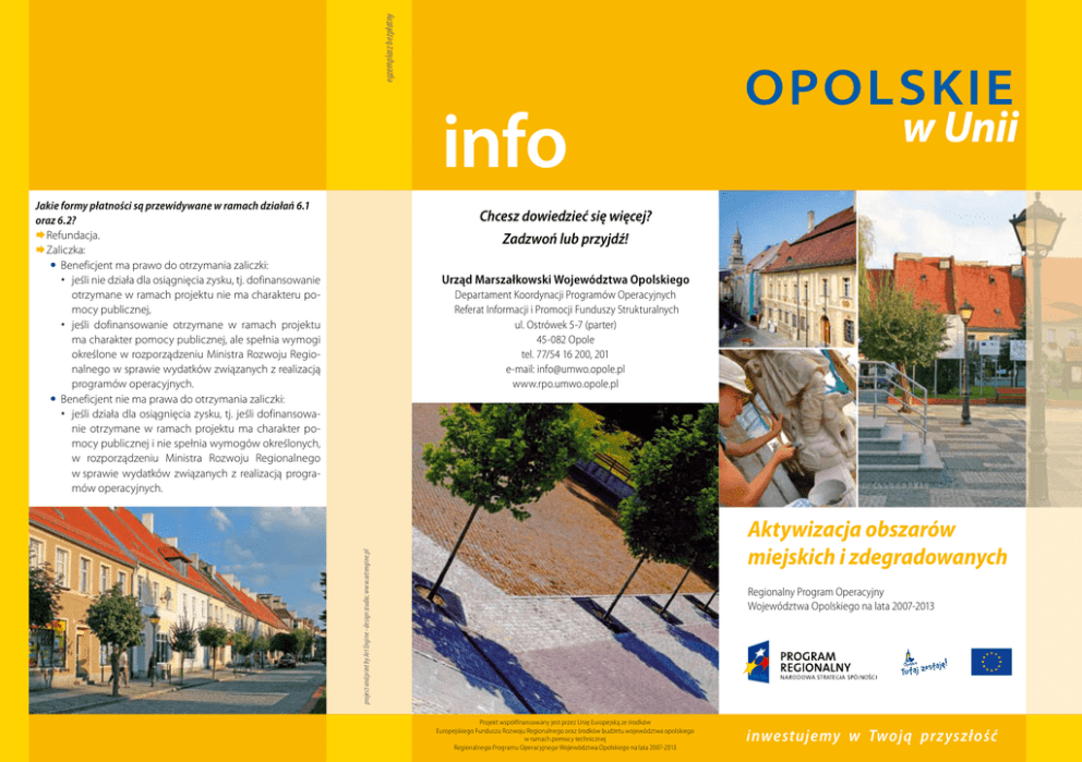 egzemplarz bezpłatny info Jakie formy płatności są przewidywane w ramach działań 6.1 oraz 6.2? Refundacja. Zaliczka: Beneficjent ma prawo do otrzymania zaliczki: jeśli nie działa dla osiągnięcia zysku, tj. dofinansowanie otrzymane w ramach projektu nie ma charakteru pomocy publicznej, jeśli dofinansowanie otrzymane w ramach projektu ma charakter pomocy publicznej, ale spełnia wymogi określone w rozporządzeniu Ministra Rozwoju Regionalnego w sprawie wydatków związanych z realizacją programów operacyjnych. Beneficjent nie ma prawa do otrzymania zaliczki: jeśli działa dla osiągnięcia zysku, tj. jeśli dofinansowanie otrzymane w ramach projektu ma charakter pomocy publicznej i nie spełnia wymogów określonych, w rozporządzeniu Ministra Rozwoju Regionalnego w sprawie wydatków związanych z realizacją programów operacyjnych. Chcesz dowiedzieć się więcej? Zadzwoń lub przyjdź! Urząd Marszałkowski Województwa Opolskiego Departament Koordynacji Programów Operacyjnych Referat Informacji i Promocji Funduszy Strukturalnych ul. Ostrówek 5-7 (parter) 45-082 Opole tel. 77/54 16 200, 201 e-mail: [email protected] www.rpo.umwo.opole.pl project and print by Art Engine - design studio; www.artengine.pl Aktywizacja obszarów miejskich i zdegradowanych Regionalny Program Operacyjny Województwa Opolskiego na lata 2007-2013 Projekt współfinansowany jest przez Unię Europejską ze środków Europejskiego Funduszu Rozwoju Regionalnego oraz środków budżetu województwa opolskiego w ramach pomocy technicznej Regionalnego Programu Operacyjnego Województwa Opolskiego na lata 2007-2013 inwestujemy w Twoją przyszłość 6.1 6.2 Oś priorytetowa 6 Aktywizacja obszarów miejskich i zdegradowanych Działanie: 6.1 – Rewitalizacja obszarów miejskich Kwota alokacji na działanie: 38 593 790,16 euro Jaki jest cel działania? Rozwój społeczno-gospodarczy obszarów miejskich oraz poprawa warunków życia mieszkańców miast. Kto może się ubiegać o wsparcie? Jednostki samorządu terytorialnego, jednostki organizacyjne wykonujące zadania jednostek samorządu terytorialnego lub ich związki. Szkoły wyższe. Podmioty wykonujące usługi publiczne, w których większość udziałów lub akcji posiadają jednostki samorządu terytorialnego lub Skarb Państwa. Pozostałe podmioty zaliczane do sektora finansów publicznych. Organizacje pozarządowe, stowarzyszenia, fundacje, prowadzące statutową działalność non profit w obszarze objętym wsparciem w ramach działania. Kościoły, związki wyznaniowe. Spółdzielnie, wspólnoty mieszkaniowe. Jakie projekty mogą otrzymać dofinansowanie? Zagospodarowanie zdegradowanych pr zestr zeni z przeznaczeniem na funkcje publiczne. Upor ządkowanie i zagospodarowanie pr zestr zeni publicznych. Porządkowanie historycznych centrów miast w strefach ochrony konserwatorskiej poprzez odtworzenie, przebudowę lub uzupełnienie zabudowy wraz z nadaniem powyższym obiektom funkcji gospodarczych, społecznych, edukacyjnych, turystycznych lub kulturowych. Roboty budowlane w obiektach użyteczności publicznej, w celu przystosowania ich do pełnienia funkcji gospodarczych, szkoleniowych, edukacyjnych, turystycznych, kulturowych, społecznych wraz z zagospodarowaniem terenu funkcjonalnie związanego z obiektem. Prace restauratorskie i konserwatorskie budynków ujętych w rejestrze zabytków oraz budynków o potwierdzonej wartości architektonicznej i znaczeniu historycznym, w tym ich adaptacja na cele: gospodarcze, społecz- ne, edukacyjne, turystyczne lub kulturalne, przyczyniające się do tworzenia miejsc pracy. Tworzenie stref bezpieczeństwa w celu zapobiegania przestępczości w zagrożonych patologiami społecznymi obszarach miast, w tym: budowa lub remont oświetlenia, zakup i instalacja systemów monitoringu ulicznego. Wymiana lub modernizacja zdegradowanej infrastruktury technicznej na obszarach rewitalizowanych, w zakresie: infrastruktury drogowej, sieci wodociągowej, kanalizacji sanitarnej, kanalizacji deszczowej, sieci ciepłowniczej lub energetycznej - jedynie jako elementów projektu zintegrowanego. Inwestycje bezpośrednio w tkankę mieszkaniową dotyczące renowacji części wspólnych wielorodzinnych budynków mieszkalnych, tj.: odnowienie zewnętrznych elementów strukturalnych budynku (dachy, fasady, okna, drzwi, klatki schodowe), działania w zakresie oszczędności energetycznej. Minimalna/Maksymalna kwota wsparcia: Od 500 tys. do 15 mln PLN. Oś priorytetowa 1 Aktywizacja obszarów miejskich i zdegradowanych Działanie: 6.2 – Zagospodarowanie terenów zdegradowanych Kwota alokacji na działanie: 27 337 268,03 euro Jaki jest cel działania? Nadanie nowych funkcji terenom zdegradowanym dla zwiększenia ich atrakcyjności gospodarczej i inwestycyjnej oraz stworzenia warunków dla wzrostu zatrudnienia na tych terenach. Kto może się ubiegać o wsparcie? Jednostki samorządu terytorialnego, jednostki organizacyjne wykonujące zadania jednostek samorządu terytorialnego lub ich związki. Szkoły wyższe. Podmioty, wykonujące usługi publiczne, w których większość udziałów lub akcji posiadają jednostki samorządu terytorialnego lub Skarb Państwa. Pozostałe podmioty zaliczane do sektora finansów publicznych. Organizacje pozarządowe, stowarzyszenia, fundacje, prowadzące statutową działalność non profit w obszarze objętym wsparciem w ramach działania. Kościoły i związki wyznaniowe. Jakie projekty mogą otrzymać dofinansowanie? Zagospodarowanie obiektów znajdujących się na obszarze zdegradowanym w celu przystosowania ich do pełnienia funkcji gospodarczych, szkoleniowych, edukacyjnych, turystycznych, kulturowych, społecznych wraz z zagospodarowaniem terenu funkcjonalnie związanego z obiektem, przyczyniających się do utrzymania lub powstawania nowych miejsc pracy. Adaptacja obiektów ujętych w rejestrze zabytków lub budynków o potwierdzonej wartości architektonicznej i znaczeniu historycznym, ujętyc