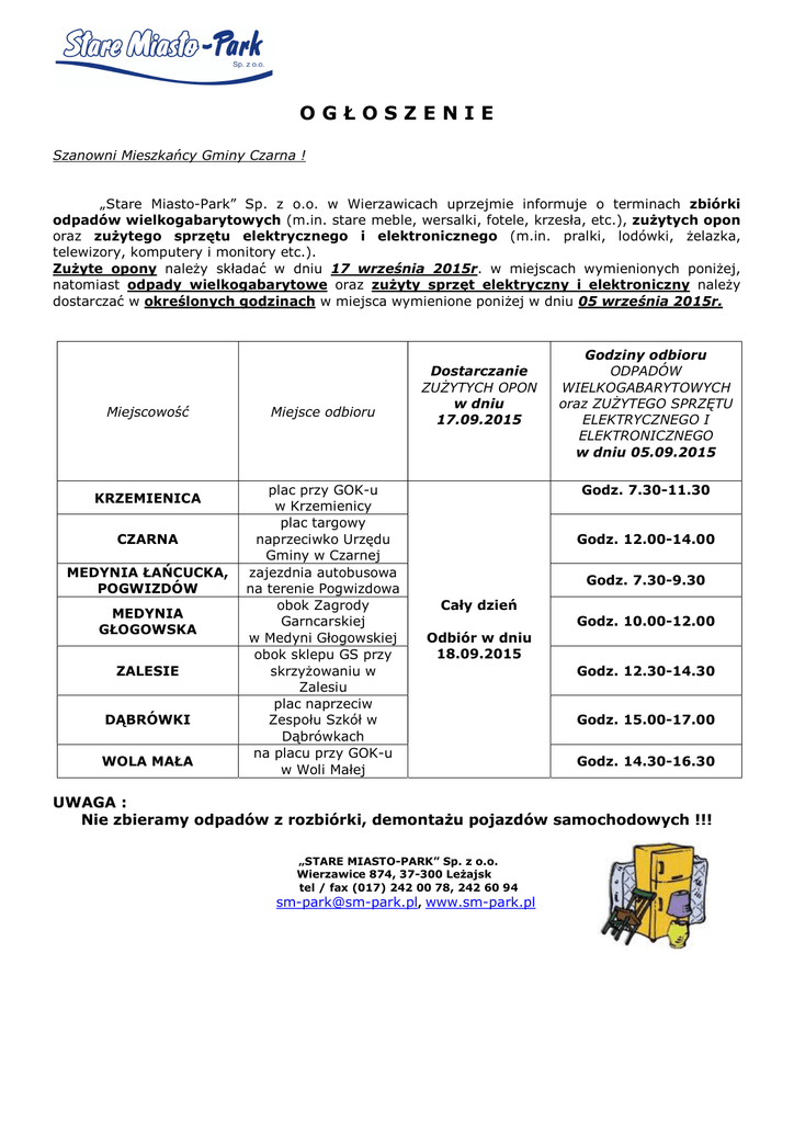 OGŁOSZENIE Szanowni Mieszkańcy Gminy Czarna ! „Stare Miasto-Park” Sp. z o.o. w Wierzawicach uprzejmie informuje o terminach zbiórki odpadów wielkogabarytowych (m.in. stare meble, wersalki, fotele, krzesła, etc.), zużytych opon oraz zużytego sprzętu elektrycznego i elektronicznego (m.in. pralki, lodówki, żelazka, telewizory, komputery i monitory etc.). Zużyte opony należy składać w dniu 17 września 2015r. w miejscach wymienionych poniżej, natomiast odpady wielkogabarytowe oraz zużyty sprzęt elektryczny i elektroniczny należy dostarczać w określonych godzinach w miejsca wymienione poniżej w dniu 05 września 2015r. Miejscowość KRZEMIENICA CZARNA MEDYNIA ŁAŃCUCKA, POGWIZDÓW MEDYNIA GŁOGOWSKA ZALESIE DĄBRÓWKI WOLA MAŁA Miejsce odbioru plac przy GOK-u w Krzemienicy plac targowy naprzeciwko Urzędu Gminy w Czarnej zajezdnia autobusowa na terenie Pogwizdowa obok Zagrody Garncarskiej w Medyni Głogowskiej obok sklepu GS przy skrzyżowaniu w Zalesiu plac naprzeciw Zespołu Szkół w Dąbrówkach na placu przy GOK-u w Woli Małej Dostarczanie ZUŻYTYCH OPON w dniu 17.09.2015 Godziny odbioru ODPADÓW WIELKOGABARYTOWYCH oraz ZUŻYTEGO SPRZĘTU ELEKTRYCZNEGO I ELEKTRONICZNEGO w dniu 05.09.2015 Godz. 7.30-11.30 Godz. 12.00-14.00 Cały dzień Odbiór w dniu 18.09.2015 Godz. 7.30-9.30 Godz. 10.00-12.00 Godz. 12.30-14.30 Godz. 15.00-17.00 Godz. 14.30-16.30 UWAGA : Nie zbieramy odpadów z rozbiórki, demontażu pojazdów samochodowych !!! „STARE MIASTO-PARK” Sp. z o.o. Wierzawice 874, 37-300 Leżajsk tel / fax (017) 242 00 78, 242 60 94 [email protected], www.sm-park.pl