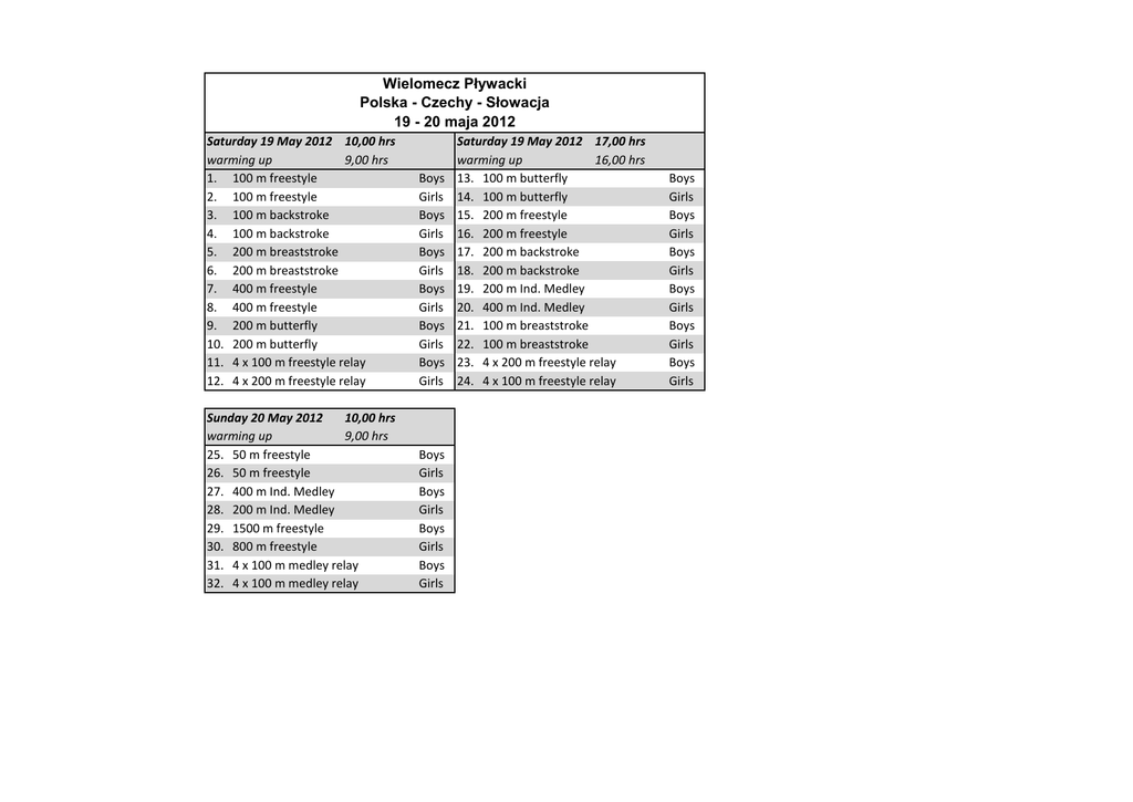 Wielomecz Pływacki Polska - Czechy - Słowacja 19 - 20 maja 2012 Saturday 19 May 2012 10,00 hrs warming up 9,00 hrs 1. 100 m freestyle 2. 100 m freestyle 3. 100 m backstroke 4. 100 m backstroke 5. 200 m breaststroke 6. 200 m breaststroke 7. 400 m freestyle 8. 400 m freestyle 9. 200 m butterfly 10. 200 m butterfly 11. 4 x 100 m freestyle relay 12. 4 x 200 m freestyle relay Boys Girls Boys Girls Boys Girls Boys Girls Boys Girls Boys Girls Sunday 20 May 2012 10,00 hrs warming up 9,00 hrs 25. 50 m freestyle 26. 50 m freestyle 27. 400 m Ind. Medley 28. 200 m Ind. Medley 29. 1500 m freestyle 30. 800 m freestyle 31. 4 x 100 m medley relay 32. 4 x 100 m medley relay Boys Girls Boys Girls Boys Girls Boys Girls Saturday 19 May 2012 17,00 hrs warming up 16,00 hrs 13. 100 m butterfly 14. 100 m butterfly 15. 200 m freestyle 16. 200 m freestyle 17. 200 m backstroke 18. 200 m backstroke 19. 200 m Ind. Medley 20. 400 m Ind. Medley 21. 100 m breaststroke 22. 100 m breaststroke 23. 4 x 200 m freestyle relay 24. 4 x 100 m freestyle relay Boys Girls Boys Girls Boys Girls Boys Girls Boys Girls Boys Girls