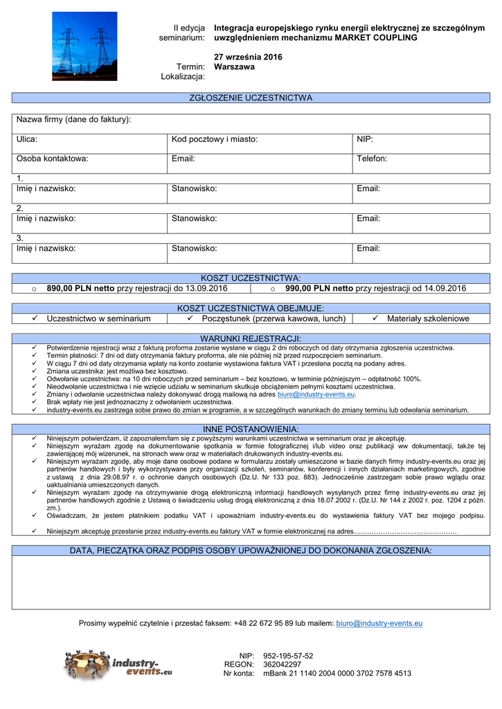 II edycja seminarium: Termin: Lokalizacja: Integracja europejskiego rynku energii elektrycznej ze szczególnym uwzględnieniem mechanizmu MARKET COUPLING 27 września 2016 Warszawa ZGŁOSZENIE UCZESTNICTWA Nazwa firmy (dane do faktury): Ulica: Kod pocztowy i miasto: NIP: Osoba kontaktowa: Email: Telefon: 1. Imię i nazwisko: Stanowisko: Email: 2. Imię i nazwisko: Stanowisko: Email: 3. Imię i nazwisko: Stanowisko: Email: o KOSZT UCZESTNICTWA: 890,00 PLN netto przy rejestracji do 13.09.2016 o 990,00 PLN netto przy rejestracji od 14.09.2016 Uczestnictwo w seminarium Potwierdzenie rejestracji wraz z fakturą proforma zostanie wysłane w ciągu 2 dni roboczych od daty otrzymania zgłoszenia uczestnictwa. Termin płatności: 7 dni od daty otrzymania faktury proforma, ale nie później niż przed rozpoczęciem seminarium. W ciągu 7 dni od daty otrzymania wpłaty na konto zostanie wystawiona faktura VAT i przesłana pocztą na podany adres. Zmiana uczestnika: jest możliwa bez kosztowo. Odwołanie uczestnictwa: na 10 dni roboczych przed seminarium – bez kosztowo, w terminie późniejszym – odpłatność 100%. Nieodwołanie uczestnictwa i nie wzięcie udziału w seminarium skutkuje obciążeniem pełnymi kosztami uczestnictwa. Zmiany i odwołanie uczestnictwa należy dokonywać drogą mailową na adres [email protected]. Brak wpłaty nie jest jednoznaczny z odwołaniem uczestnictwa. industry-events.eu zastrzega sobie prawo do zmian w programie, a w szczególnych warunkach do zmiany terminu lub odwołania seminarium. Niniejszym potwierdzam, iż zapoznałem/łam się z powyższymi warunkami uczestnictwa w seminarium oraz je akceptuję. Niniejszym wyrażam zgodę na dokumentowanie spotkania w formie fotograficznej i/lub video oraz publikacji ww dokumentacji, także tej zawierającej mój wizerunek, na stronach www oraz w materiałach drukowanych industry-events.eu. Niniejszym wyrażam zgodę, aby moje dane osobowe podane w formularzu zostały umieszczone w bazie danych firmy industry-events.eu oraz jej partnerów handlowych i były wykorzystywane przy organizacji szkoleń, seminariów, konferencji i innych działaniach marketingowych, zgodnie z ustawą z dnia 29.08.97 r. o ochronie danych osobowych (Dz.U. Nr 133 poz. 883). Jednocześnie zastrzegam sobie prawo wglądu oraz uaktualniania umieszczonych danych. Niniejszym wyrażam zgodę na otrzymywanie drogą elektroniczną informacji handlowych wysyłanych przez firmę industry-events.eu oraz jej partnerów handlowych zgodnie z Ustawą o świadczeniu usług drogą elektroniczną z dnia 18.07.2002 r. (Dz.U. Nr 144 z 2002 r. poz. 1204 z późn. zm.). Oświadczam, że jestem płatnikiem podatku VAT i upoważniam industry-events.eu do wystawienia faktury VAT bez mojego podpisu. Niniejszym akceptuję przesłanie przez industry-events.eu faktury VAT w formie elektronicznej na adres………………………………………. KOSZT UCZESTNICTWA OBEJMUJE: Poczęstunek (przerwa kawowa, lunch) Materiały szkoleniowe WARUNKI REJESTRACJI: INNE POSTANOWIENIA: DATA, PIECZĄTKA ORAZ PODPIS OSOBY UPOWAŻNIONEJ DO DOKONANIA ZGŁOSZENIA: Prosimy wypełnić czytelnie i przesłać faksem: +48 22 672 95 89 lub mailem: [email protected] NIP: REGON: Nr konta: 952-195-57-52 362042297 mBank 21 1140 2004 0000 3702 7578 4513