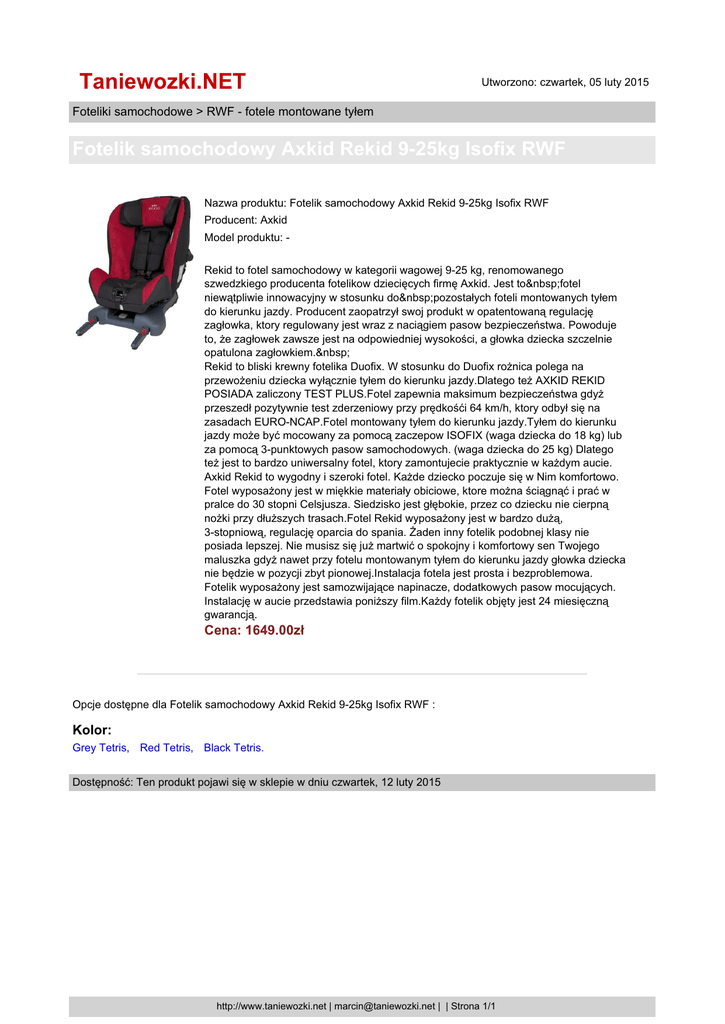 Taniewozki.NET Utworzono: czwartek, 05 luty 2015 Foteliki samochodowe > RWF - fotele montowane tyłem Fotelik samochodowy Axkid Rekid 9-25kg Isofix RWF Nazwa produktu: Fotelik samochodowy Axkid Rekid 9-25kg Isofix RWF Producent: Axkid Model produktu: Rekid to fotel samochodowy w kategorii wagowej 9-25 kg, renomowanego szwedzkiego producenta fotelikow dziecięcych firmę Axkid. Jest to fotel niewątpliwie innowacyjny w stosunku do pozostałych foteli montowanych tyłem do kierunku jazdy. Producent zaopatrzył swoj produkt w opatentowaną regulację zagłowka, ktory regulowany jest wraz z naciągiem pasow bezpieczeństwa. Powoduje to, że zagłowek zawsze jest na odpowiedniej wysokości, a głowka dziecka szczelnie opatulona zagłowkiem. Rekid to bliski krewny fotelika Duofix. W stosunku do Duofix rożnica polega na przewożeniu dziecka wyłącznie tyłem do kierunku jazdy.Dlatego też AXKID REKID POSIADA zaliczony TEST PLUS.Fotel zapewnia maksimum bezpieczeństwa gdyż przeszedł pozytywnie test zderzeniowy przy prędkośći 64 km/h, ktory odbył się na zasadach EURO-NCAP.Fotel montowany tyłem do kierunku jazdy.Tyłem do kierunku jazdy może być mocowany za pomocą zaczepow ISOFIX (waga dziecka do 18 kg) lub za pomocą 3-punktowych pasow samochodowych. (waga dziecka do 25 kg) Dlatego też jest to bardzo uniwersalny fotel, ktory zamontujecie praktycznie w każdym aucie. Axkid Rekid to wygodny i szeroki fotel. Każde dziecko poczuje się w Nim komfortowo. Fotel wyposażony jest w miękkie materiały obiciowe, ktore można ściągnąć i prać w pralce do 30 stopni Celsjusza. Siedzisko jest głębokie, przez co dziecku nie cierpną nożki przy dłuższych trasach.Fotel Rekid wyposażony jest w bardzo dużą, 3-stopniową, regulację oparcia do spania. Żaden inny fotelik podobnej klasy nie posiada lepszej. Nie musisz się już martwić o spokojny i komfortowy sen Twojego maluszka gdyż nawet przy fotelu montowanym tyłem do kierunku jazdy głowka dziecka nie będzie w pozycji zbyt pionowej.Instalacja fotela jest prosta i bezproblemowa. Fotelik wyposażony jest samozwijające napinacze, dodatkowych pasow mocujących. Instalację w aucie przedstawia poniższy film.Każdy fotelik objęty jest 24 miesięczną gwarancją. Cena: 1649.00zł Opcje dostępne dla Fotelik samochodowy Axkid Rekid 9-25kg Isofix RWF : Kolor: Grey Tetris, Red Tetris, Black Tetris. Dostępność: Ten produkt pojawi się w sklepie w dniu czwartek, 12 luty 2015 http://www.taniewozki.net | [email protected] | | Strona 1/1