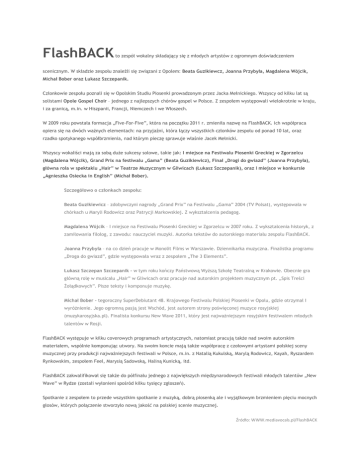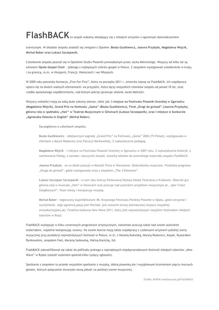 FlashBACK to zespół wokalny składający się z młodych artystów z ogromnym doświadczeniem scenicznym. W składzie zespołu znaleźli się związani z Opolem: Beata Guzikiewcz, Joanna Przybyła, Magdalena Wójcik, Michał Bober oraz Łukasz Szczepanik. Członkowie zespołu poznali się w Opolskim Studiu Piosenki prowadzonym przez Jacka Mełnickiego. Wszyscy od kilku lat są solistami Opole Gospel Choir – jednego z najlepszych chórów gospel w Polsce. Z zespołem występowali wielokrotnie w kraju, i za granicą, m.in. w Hiszpanii, Francji, Niemczech i we Włoszech. W 2009 roku powstała formacja „Five-For-Five”, która na początku 2011 r. zmieniła nazwę na FlashBACK. Ich współpraca opiera się na dwóch ważnych elementach: na przyjaźni, która łączy wszystkich członków zespołu od ponad 10 lat, oraz rzadko spotykanego współbrzmienia, nad którym pieczę sprawuje właśnie Jacek Mełnicki. Wszyscy wokaliści mają za sobą duże sukcesy solowe, takie jak: I miejsce na Festiwalu Piosenki Greckiej w Zgorzelcu (Magdalena Wójcik), Grand Prix na festiwalu „Gama” (Beata Guzikiewicz), Finał „Drogi do gwiazd” (Joanna Przybyła), główna rola w spektaklu „Hair” w Teatrze Muzycznym w Gliwicach (Łukasz Szczepanik), oraz I miejsce w konkursie „Agnieszka Osiecka in English” (Michał Bober). Szczegółowo o członkach zespołu: Beata Guzikiewicz – zdobywczyni nagrody „Grand Prix” na Festiwalu „Gama” 2004 (TV Polsat), występowała w chórkach u Maryli Rodowicz oraz Patrycji Markowskiej. Z wykształcenia pedagog. Magdalena Wójcik – I miejsce na Festiwalu Piosenki Greckiej w Zgorzelcu w 2007 roku. Z wykształcenia historyk, z zamiłowania filolog, z zawodu: nauczyciel muzyki. Autorka tekstów do autorskiego materiału zespołu FlashBACK. Joanna Przybyła – na co dzień pracuje w Monolit Films w Warszawie. Dziennikarka muzyczna. Finalistka programu „Droga do gwiazd”, gdzie występowała wraz z zespołem „The 3 Elements”. Łukasz Szczepan Szczepanik – w tym roku kończy Państwową Wyższą Szkołę Teatralną w Krakowie. Obecnie gra główną rolę w musicalu „Hair” w Gliwicach oraz pracuje nad autorskim projektem muzycznym pt. „Spis Treści Żołądkowych”. Pisze teksty i komponuje muzykę. Michał Bober – tegoroczny SuperDebiutant 48. Krajowego Festiwalu Polskiej Piosenki w Opolu, gdzie otrzymał I wyróżnienie. Jego ogromną pasją jest Wschód, jest autorem strony poświęconej muzyce rosyjskiej (muzykarosyjska.pl). Finalista konkursu New Wave 2011, który jest najważniejszym rosyjskim festiwalem młodych talentów w Rosji. FlashBACK występuje w kilku coverowych programach artystycznych, natomiast pracują także nad swoim autorskim materiałem, wspólnie komponując utwory. Na swoim koncie mają także współpracę z czołowymi artystami polskiej sceny muzycznej przy produkcji najważniejszych festiwali w Polsce, m.in. z Natalią Kukulską, Marylą Rodowicz, Kayah, Ryszardem Rynkowskim, zespołem Feel, Marysią Sadowską, Haliną Kunicką, itd. FlashBACK zakwalifikował się także do półfinału jednego z największych międzynarodowych festiwali młodych talentów „New Wave” w Rydze (zostali wyłonieni spośród kilku tysięcy zgłoszeń). Spotkanie z zespołem to przede wszystkim spotkanie z muzyką, dobrą piosenką ale i wyjątkowym brzmieniem pięciu mocnych głosów, których połączenie stworzyło nową jakość na polskiej scenie muzycznej. Źródło: WWW.mediavocals.pl/FlashBACK