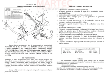 INSTRUKCJA MontaŜu i eksploatacji zaczepu kulowego Oznaczenie zacisku wg ISO PN 1 L 2 + 3 31 4 R 5 58R 6 54 7 58L B Łączenie przewodów 9 12 C 9 Kierunkowskazy lewe Tylne światła przeciwmgłowe Masa Kierunkowskazy prawe Światła pozycyjne prawe Światła hamowania Światła pozycyjne lewe Kolejność czynności przy montaŜu A 12 12 9 8 8 8 A 5 8 12 A 8 4 A 8 6 1 B 7 C 8 17 3 18 2 11 Zaczep kulowy przeznaczony jest do zamontowania w samochodach: PEUGEOT 806 (5 drz. i VAN) oraz EXPERT (zabudowany blaszak), CITROEN EVASION (5 drz. i VAN) oraz JUMPY (zabudowany blaszak), FIAT ULYSSE (5 drz. i VAN) oraz SCUDO (zabudowany blaszak), LANCIA Z (5 drz. i VAN) produkowanych od 1994r. do 2001r., numer katalogowy R17A i słuŜy do ciągnięcia przyczep o masie całkowitej 1800 kg i nacisku na kulę max 80 kg. OD PRODUCENTA Dziękujemy za wybór produkowanego przez naszą firmę zaczepu kulowego. Jego niezawodność została potwierdzona licznymi testami oraz opiniami zadowolonych klientów. JednakŜe niezawodność haków holowniczych jest zaleŜna równieŜ od prawidłowego montaŜu oraz prawidłowej eksploatacji. Z tego powodu prosimy Państwa o staranne przeczytanie niniejszej instrukcji montaŜu oraz przestrzeganie zawartych wskazówek. Zaczep naleŜy zamontować w miejscach do tego celu przeznaczonych przez producenta samochodu. 1. Opuścić koło zapasowe i kolektor wydechowy. 2. Wykonać wycięcie w zderzaku w jego osi o szerokości 80mm i głębokości 50mm. 3. Umieścić specjalne nakrętki (poz. 9) w podłuŜnicach. 4. Przykręcić belkę zaczepu (poz. 1) do podłuŜnic w punktach oznaczonych A – luźno. 5. Przykręcić wspornik boczny (poz. 4) do podłuŜnicy oraz do belki zaczepu w punktach oznaczonych B – luźno. 6. Przykręcić wspornik środkowy (poz. 5) do podłuŜnicy oraz belki zaczepu w punktach oznaczonych C - luźno 7. Przykręcić korpus automatu (poz. 18) śrubami M12x25mm (poz. 6) wraz z blachą pod gniazdo (poz. 3). Zamocować kulę zgodnie z instrukcją dołączaną do zaczepu z końcówką szybkodemontowalną. 8. Dokręcić wszystkie śruby z momentem jak podano w tabelce. 9. Podłączyć przewody z gniazdka 7 – bieg. do instalacji elektrycznej zgodnie z instrukcją fabryczną samochodu (zaleca się wykonanie w ASO). 10. Uzupełnić ewentualne ubytki powłoki malarskiej zaczepu powstałe w trakcie montaŜu. Zalecany moment skręcający dla śrub i nakrętek 8,8: M6 - 11 Nm M8 - 25 Nm M10 - 50 Nm M12 - 87 Nm M14 - 138 Nm M16 - 210 Nm UWAGA Po zamontowaniu zaczepu kulowego naleŜy uzyskać wpis w dowodzie rejestracyjnym pojazdu na „stacji kontroli pojazdów” właściwej dla miejsca zamieszkania. Samochód powinien być wyposaŜony w : -kierunkowskazy boczne -lusterka boczne o rozstawie, co najmniej szerokości przyczepy. Sprawdzać śruby mocujące zaczepu kulowego po około 1000 km przebiegu eksploatacji. Kula zaczepu musi być utrzymana w czystości i konserwowana smarem stałym. PPUH AUTO-HAK S. J. WyposaŜenie zaczepu: Produkcja Zaczepów Kulowych Henryk & Zbigniew Nejman 76-200 SŁUPSK ul. Słoneczna 16K tel/fax (059) 8-414-414; 8-414-413 E-mail: [email protected] www.autohak.com.pl Zaczep kulowy bez wyposaŜenia elektrycznego R17A KARTA GWARANCYJNA Producent udziela gwarancji niniejszą kartą gwarancyjną na okres 24 miesięcy licząc od dnia zakupu zaczepu kulowego do samochodów: PEUGEOT 806 i EXPERT, CITROEN EVASION i JUMPY, FIAT ULYSSE i SCUDO, LANCIA Z produkowanych od 1994 r. do 12.2006 r. Data produkcji .............................. Data zakupu.................................. Zakres gwarancji obejmuje wyłącznie wady jakościowe wynikające z winy producenta. Gwarancja nie obejmuje natomiast uszkodzeń zawinionych przez nabywcę, wynikających z niewłaściwego montaŜu, uŜytkowania lub konserwacji, uszkodzeń mechanicznych, normalnego zuŜycia podczas eksploatacji itp. Gwarancja udzielona na zakupiony towar nie wyłącza, nie ogranicza ani nie zawiesza uprawnień kupującego wynikających z niezgodności towaru z umową. Reklamacje naleŜy zgłaszać w punkcie sprzedaŜy, składając jednocześnie kartę gwarancyjną. Usunięcie "wady" następuje po stwierdzeniu przez punkt sprzedaŜy wspólnie z producentem słuszności złoŜonej reklamacji. Reklamacja powinna być załatwiona w ciągu czternastu dni od dnia uznania reklamacji. Karta gwarancyjna jest niewaŜna jeŜeli nie jest wypełniona i podpisana. Data zgłoszenia reklamacji: ................................................................... Klasa: A50-X Nr kat. Przeznaczony do zamontowania w samochodach: PEUGEOT 806 (5 drz., VAN) Expert (zabudowany blaszak) CITROEN Evasion (5 drz., VAN) Jumpy (zabudowany blaszak) FIAT Ulysse (5 drz., VAN) Scudo (zabudowany blaszak) LANCIA Z (5 drz., VAN) Dane techniczne: Wartość siły D : 10,20 kN maksymalna masa przyczepy: 1800 kg maksymalny nacisk na kulę: 80 kg produkowanych od 1994r. do 12.2006r. Numer homologacji zgodnie z dyrektywą 94/20/WE: e20*94/20*0802*00 INFORMACJA WSTĘPNA Zaczep kulowy jest skonstruowany zgodnie z zasadami bezpieczeństwa ruchu drogowego. Zaczep kulowy jest elementem wpływającym na bezpieczeństwo jazdy i moŜe zostać zainstalowany wyłącznie przez personel wyspecjalizowany. Niedopuszczalne jest dokonywanie jakichkolwiek zmian w konstrukcji zaczepu. Powoduje to wygaśniecie dopuszczenia do stosowania. W przypadku obecności masy izolacyjnej lub osłony podwozia w miejscu przylegania zaczepu, naleŜy ją usunąć. Nieosłonięte miejsca karoserii oraz wywiercone otwory naleŜy pomalować farbą antykorozyjną. Informacjami wiąŜącymi odnośnie wartości obciąŜeń są dane podawane przez producenta samochodu, względnie wartości maksymalnej masy przyczepy oraz maksymalnego nacisku na kulę, przy czym wartości parametrów zaczepu kulowego nie mogą być przekroczone. Wzór do obliczania wartości siły D: Maks. masa przyczepy [kg] x Masa całkowita samochodu [kg] 9,81 = X + 1000 Masa całkowita samochodu [kg