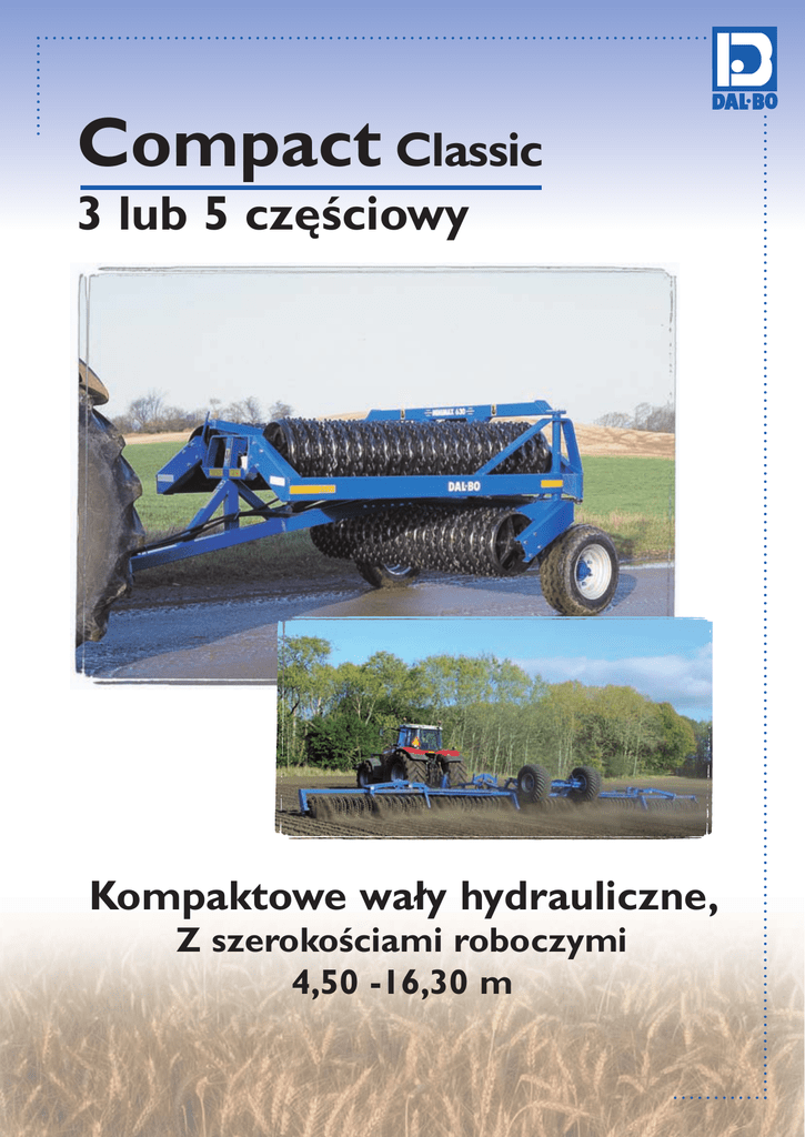Compact Classic 3 lub 5 częściowy Kompaktowe wały hydrauliczne, Z szerokościami roboczymi 4,50 -16,30 m Compact 3 częściowy Compact jest wałem, który może być wykorzystywany do rożnych celów. Przygotowanie gruntu przed siewem, lub walcowanie po zasiewie można wykonać jednym i tym samym wałem. Kompakt jest także idealny jako maszyna do ciągnięcia za broną talerzową. Compact jest hydraulicznie składanym wałem,który jest sterowany z ciągnika.Rozkładanie jest wykonywane podczas postoju ciągnika na polu. Dzięki dużemu pokryciu sekcji, otrzymujemy optymalne ugniatanie wzdłuż całej szerokości roboczej wału – nawet na zakrętach i nierównym terenie. 2 duże sprężyny przekazują masę ze środkowej sekcji na boczne, osiągając stały nacisk wzdłuż całej szerokości roboczej. System DUOFLEX pozwala na to, by każda sekcja pracowała niezależnie. Rozkładanie sekcji bocznych odbywa sie; poprzez cylinder dwustronnego działania System DUOFLEX zapewnia niezależną pracę wałów, poprzez luz na cylindrach. Oznacza to, że optymalny kontakt z glebą jest utrzymywany na całej szerokości roboczej nawet w trudnych warunkach. Dwie mocne sprężyny przekazują masę na sekcje boczne. Pierścienie Crosskill są pierścieniami uprawiającymi, które zostawią powierzchnię porowatą, dzięki czemu występuje mniejsze ryzyko erozji. Co drugi pierścień jest montowany luźno na wale co pomaga w utrzymywania czystości wału. Pierścienie Crosskill są bardzo odporne na kamienie. Pierścienie Cambridge są zalecane do stosowania po zasiewach, przy skiełkowanych roślinach oraz na łąkach polowych. Pierścienie ząbkowane penetrują ziemię . Pierścienie szerokie o łagodnych wypukleniach powodują że wał nie blokuje się w luźnej glebie. Nowy, zaokrąglony profil chroni rośliny i zmniejsza podatność na uszkodzenia przy kamieniach. Wał jest kompaktowy i łatwy w użyciu, jest także bardzo poręczny na małych obszarach. Posiada także bardzo mocne podwozie oraz wysoki prześwit. Podczas transportu wał jest położony na specjalnych uchwytach. Compact 10,30 (3 częściowy z 5 sekcjami) Compact 12,30 oraz 16,30 (5 częściowy) Hydrauliczne składany wał z niezależnymi sekcjami oraz nisko położonym środkiem ciężkości. Składanie i rozkładanie wykonywane jest z ciągnika podczas jego postoju. Poprzez duże pokrycie między każdą sekcją otrzymujemy optymalne ugniatanie wzdłuż całej szerokości roboczej- nawet podczas nawrotów oraz na nierównych terenach. Hydrauliczna regulacja masą, pozwala nam na przekazanie masy z sekcji środkowej na boczne, dzięki czemu otrzymujemy równy nacisk na całej długości roboczej. System DUOFLEX pozwala na pracę każdej sekcji wału niezależnie. System DUOFLEX wyposażony w akumulatory pozwala każdej sekcji wału na dopasowywanie się do terenu. MINIMAX 8,30. MINIMAX 16,30 w pozycji roboczej Dodatki. Compact 9,30 - 9,50 - 10,30 - 12,30 oraz 16,30 może być wyposażony w hamulce hydrauliczne jak i w pneumatyczne. Hydrauliczna włóka (tylko dla 6,30) Włóka do zadań ciężkich ze wzmocnionymi sztywnymi zębami jest regulowana hydraulicznie. Akumulator oraz manometr ułatwia użycie włóki. Duże grudki są pocięte i skruszone. Światła drogowe (Compact 9,50 - 10,30 - 12,30 oraz 16,30 jest wyposażony standardowo w światła drogowe) MiniMax 4,5 - 6,3 - 8,3 - 9,5 - 10,3 m z możliwością doposażenia we włókę wyrównującą regulowaną hydraulicznie Crackerboard 450cm 630 cm 830 cm 930 cm 950 cm 1030 cm 1230 cm 1630 cm 230 250 250 300 300 300 300 300 80 KM 100 KM 120 KM 130 KM 150 KM 160 KM 200 KM 230 KM 10,0/75x15,3 10,0/75x15,3 11,5/80x15,5 400/60x15,5 TWIN 400/60x15,5 TWIN 400/60x15,5 TWIN 380/55x17 TWIN 600/50x22,5 TWIN 404 Cambridge 45cm Masa/ liczba pierścieni 1785 kg/91 szt. 2490 kg/129 pcs - - - - - - Cambridge 50cm Masa/ liczba pierścieni 2075 kg/91 pcs 2985 kg/129 pcs 4010 kg/167 pcs 4750 kg/187 pcs 5100 kg/197 pcs 5200 kg/201 pcs 6920 kg/249 pcs - 3380 kg/129 pcs 4625 kg/167 pcs 5750 kg/197 pcs 5900 kg/201 pcs 8100 kg/249 pcs 10450 kg/325 pcs Typ Szerokość transportowa cm. Zapotrzebowanie mocy koła Cambridge 55cm Masa/ liczba pierścieni Crosskill 53cm Masa/ liczba pierścieni 1800 kg/45 pcs 2485 kg/63 pcs 3575 kg/83 pcs 4050 kg/95 pcs 4260 kg/99 pcs 4450 kg/103 pcs 6500 kg/127 pcs - Crosskill 60cm Masa/ liczba pierścieni - - - - 5750 kg/99 pcs 5900 kg/103 pcs 8020 kg/127 pcs 10730 kg/163 pcs DALBO - ENKELT OG ROBUST DALBO A/S · BINDEBALLEVEJ 69 · DK-7183 RANDBØL · TEL. +45 75 88 35 00 · FAX +45 75 88 31 57 E-mail: [email protected] - Homepage: www.dal-bo.com Jørn Thomsen/Elbo A/S – +45 7637 6000 –11/2010 Specyfikacja techniczna: