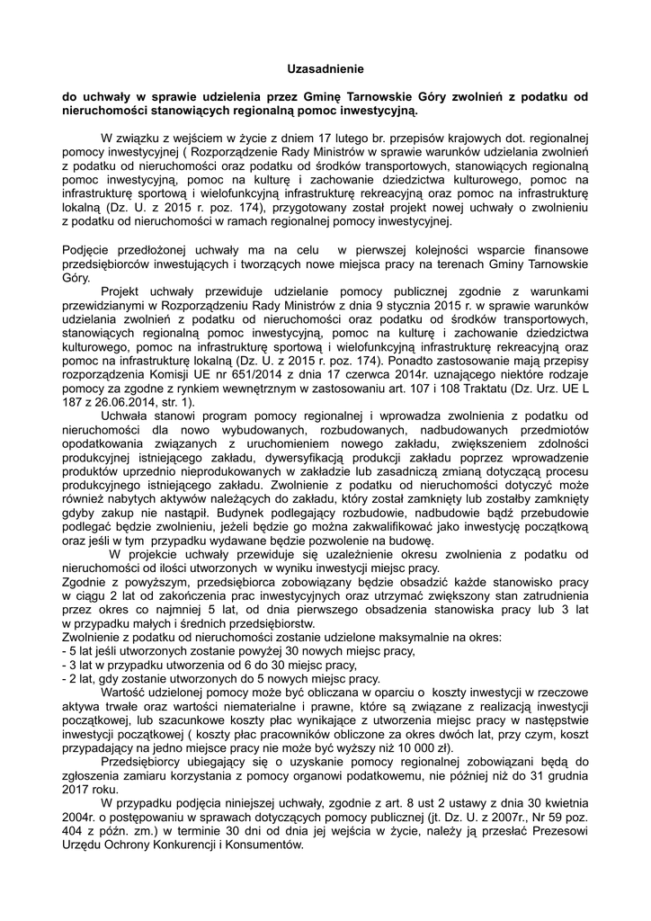 Uzasadnienie do uchwały w sprawie udzielenia przez Gminę Tarnowskie Góry zwolnień z podatku od nieruchomości stanowiących regionalną pomoc inwestycyjną. W związku z wejściem w życie z dniem 17 lutego br. przepisów krajowych dot. regionalnej pomocy inwestycyjnej ( Rozporządzenie Rady Ministrów w sprawie warunków udzielania zwolnień z podatku od nieruchomości oraz podatku od środków transportowych, stanowiących regionalną pomoc inwestycyjną, pomoc na kulturę i zachowanie dziedzictwa kulturowego, pomoc na infrastrukturę sportową i wielofunkcyjną infrastrukturę rekreacyjną oraz pomoc na infrastrukturę lokalną (Dz. U. z 2015 r. poz. 174), przygotowany został projekt nowej uchwały o zwolnieniu z podatku od nieruchomości w ramach regionalnej pomocy inwestycyjnej. Podjęcie przedłożonej uchwały ma na celu w pierwszej kolejności wsparcie finansowe przedsiębiorców inwestujących i tworzących nowe miejsca pracy na terenach Gminy Tarnowskie Góry. Projekt uchwały przewiduje udzielanie pomocy publicznej zgodnie z warunkami przewidzianymi w Rozporządzeniu Rady Ministrów z dnia 9 stycznia 2015 r. w sprawie warunków udzielania zwolnień z podatku od nieruchomości oraz podatku od środków transportowych, stanowiących regionalną pomoc inwestycyjną, pomoc na kulturę i zachowanie dziedzictwa kulturowego, pomoc na infrastrukturę sportową i wielofunkcyjną infrastrukturę rekreacyjną oraz pomoc na infrastrukturę lokalną (Dz. U. z 2015 r. poz. 174). Ponadto zastosowanie mają przepisy rozporządzenia Komisji UE nr 651/2014 z dnia 17 czerwca 2014r. uznającego niektóre rodzaje pomocy za zgodne z rynkiem wewnętrznym w zastosowaniu art. 107 i 108 Traktatu (Dz. Urz. UE L 187 z 26.06.2014, str. 1). Uchwała stanowi program pomocy regionalnej i wprowadza zwolnienia z podatku od nieruchomości dla nowo wybudowanych, rozbudowanych, nadbudowanych przedmiotów opodatkowania związanych z uruchomieniem nowego zakładu, zwiększeniem zdolności produkcyjnej istniejącego zakładu, dywersyfikacją produkcji zakładu poprzez wprowadzenie produktów uprzednio nieprodukowanych w zakładzie lub zasadniczą zmianą dotyczącą procesu produkcyjnego istniejącego zakładu. Zwolnienie z podatku od nieruchomości dotyczyć może również nabytych aktywów należących do zakładu, który został zamknięty lub zostałby zamknięty gdyby zakup nie nastąpił. Budynek podlegający rozbudowie, nadbudowie bądź przebudowie podlegać będzie zwolnieniu, jeżeli będzie go można zakwalifikować jako inwestycję początkową oraz jeśli w tym przypadku wydawane będzie pozwolenie na budowę. W projekcie uchwały przewiduje się uzależnienie okresu zwolnienia z podatku od nieruchomości od ilości utworzonych w wyniku inwestycji miejsc pracy. Zgodnie z powyższym, przedsiębiorca zobowiązany będzie obsadzić każde stanowisko pracy w ciągu 2 lat od zakończenia prac inwestycyjnych oraz utrzymać zwiększony stan zatrudnienia przez okres co najmniej 5 lat, od dnia pierwszego obsadzenia stanowiska pracy lub 3 lat w przypadku małych i średnich przedsiębiorstw. Zwolnienie z podatku od nieruchomości zostanie udzielone maksymalnie na okres: - 5 lat jeśli utworzonych zostanie powyżej 30 nowych miejsc pracy, - 3 lat w przypadku utworzenia od 6 do 30 miejsc pracy, - 2 lat, gdy zostanie utworzonych do 5 nowych miejsc pracy. Wartość udzielonej pomocy może być obliczana w oparciu o koszty inwestycji w rzeczowe aktywa trwałe oraz wartości niematerialne i prawne, które są związane z realizacją inwestycji początkowej, lub szacunkowe koszty płac wynikające z utworzenia miejsc pracy w następstwie inwestycji początkowej ( koszty płac pracowników obliczone za okres dwóch lat, przy czym, koszt przypadający na jedno miejsce pracy nie może być wyższy niż 10 000 zł). Przedsiębiorcy ubiegający się o uzyskanie pomocy regionalnej zobowiązani będą do zgłoszenia zamiaru korzystania z pomocy organowi podatkowemu, nie później niż do 31 grudnia 2017 roku. W przypadku podjęcia niniejszej uchwały, zgodnie z art. 8 ust 2 ustawy z dnia 30 kwietnia 2004r. o postępowaniu w sprawach dotyczących pomocy publicznej (jt. Dz. U. z 2007r., Nr 59 poz. 404 z późn. zm.) w terminie 30 dni od dnia jej wejścia w życie, należy ją przesłać Prezesowi Urzędu Ochrony Konkurencji i Konsumentów.