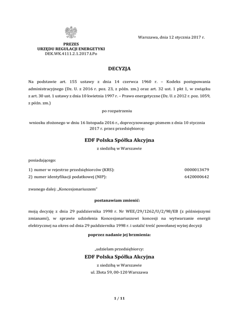 Warszawa, dnia 12 stycznia 2017 r. PREZES URZĘDU REGULACJI ENERGETYKI DEK.WK.4111.2.1.2017.ŁPo DECYZJA Na podstawie art. 155 ustawy z dnia 14 czerwca 1960 r. – Kodeks postępowania administracyjnego (Dz. U. z 2016 r. poz. 23, z późn. zm.) oraz art. 32 ust. 1 pkt 1, w związku z art. 30 ust. 1 ustawy z dnia 10 kwietnia 1997 r. – Prawo energetyczne (Dz. U. z 2012 r. poz. 1059, z późn. zm.) po rozpatrzeniu wniosku złożonego w dniu 16 listopada 2016 r., doprecyzowanego pismem z dnia 10 stycznia 2017 r. przez przedsiębiorcę: EDF Polska Spółka Akcyjna z siedzibą w Warszawie posiadającego: 1) numer w rejestrze przedsiębiorców (KRS): 0000013479 2) numer identyfikacji podatkowej (NIP): 6420000642 zwanego dalej: „Koncesjonariuszem” postanawiam zmienić: moją decyzję z dnia 29 października 1998 r. Nr WEE/29/1262/U/2/98/EB (z późniejszymi zmianami), w sprawie udzielenia Koncesjonariuszowi koncesji na wytwarzanie energii elektrycznej na okres od dnia 29 października 1998 r. i ustalić treść powołanej wyżej decyzji poprzez nadanie jej brzmienia: „udzielam przedsiębiorcy: EDF Polska Spółka Akcyjna z siedzibą w Warszawie ul. Złota 59, 00-120 Warszawa 1 / 11 posiadającemu: 1) numer w rejestrze przedsiębiorców (KRS): 0000013479 2) numer identyfikacji podatkowej (NIP): 6420000642 zwanemu dalej: „Koncesjonariuszem” KONCESJI Nr WEE/29/1262/U/2/98/EB na wytwarzanie energii elektrycznej na okres od dnia 29 października 1998 r. do dnia 31 października 2018 r., na następujących warunkach: 1. Przedmiot i zakres działalności 1.1. Przedmiot działalności objętej niniejszą koncesją stanowi działalność gospodarcza polegająca na wytwarzaniu energii elektrycznej w: 1) źródle o nazwie EDF Polska S.A. Oddział w Rybniku, stanowiącym jednostkę kogeneracji, zlokalizowanym w miejscowości Rybnik, gmina Rybnik, powiat Rybnik, województwo śląskie, o łącznej mocy zainstalowanej elektrycznej 1840,000 MW, przy użyciu następujących jednostek wytwórczych: Jednostka nr 1 (WSB), instalacja odnawialnego źródła energii - instalacja spalania wielopaliwowego, o łącznej mocy zainstalowanej elektrycznej 230,000 MW, w której energia elektryczna pochodzi ze spalania paliw konwencjonalnych (węgiel kamienny, olej opałowy) lub ze wspólnego spalania paliw konwencjonalnych i biomasy w jednym kotle parowym (K3), zasilającym w parę jeden turbozespół (turbinę parową upustowokondensacyjną TPU). Biomasę stanowi: biomasa z produktów, odpadów i pozostałości z przemysłu przetwarzającego produkty rolne. Biomasa jest podawana do kotła K3 odrębną linią technologiczną. Maksymalny udział wagowy biomasy w ogólnym strumieniu paliwa podawanego do kotła K3 wynosi 40 %. Warunki techniczne ww. instalacji umożliwiają wykorzystanie biomasy w udziale energetycznym przekraczającym 20 % w stosunku do wszystkich paliw spalanych w tej instalacji. 2 / 11 Jednostka nr 2 (WSB), instalacja odnawialnego źródła energii - instalacja spalania wielopaliwowego, o łącznej mocy zainstalowanej elektrycznej 1610,000 MW, w której energia elektryczna pochodzi ze spalania paliw konwencjonalnych (węgiel kamienny, olej opałowy) lub ze wspólnego spalania paliw konwencjonalnych i biomasy w siedmiu kotłach parowych (K1, K2, K4-K8), zasilających w parę siedem turbozespołów (turbin parowych upustowo-kondensacyjnych TPU). Biomasę stanowi: biomasa z produktów, odpadów i pozostałości z produkcji leśnej oraz z przemysłu przetwarzającego jej produkty – drewno liściaste, drewno iglaste oraz mieszanina drewna liściastego i iglastego; biomasa z produktów, odpadów i pozostałości z produkcji rolnej; biomasa z produktów, odpadów i pozostałości z przemysłu przetwarzającego produkty rolne. Maksymalny udział wagowy biomasy w ogólnym strumieniu paliwa podawanego do kotłów wynosi 15 %. 2) źródle o nazwie EDF Polska S.A. Oddział Nr 1 w Krakowie, zlokalizowanym w Krakowie, gmina Kraków, powiat Kraków, województwo małopolskie, o łącznej mocy zainstalowanej elektrycznej 460,000 MW, przy użyciu jednostek wytwórczych: Jednostka nr 1 (EK), o łącznej mocy zainstalowanej elektrycznej 340,000 MW, w której energia elektryczna pochodzi ze spalania paliwa konwencjonalnego (węgiel kamienny, olej opałowy lekki), w trzech kotłach parowych nr 1, 3 i 4, zasilających w parę trzy turbozespoły (jedna turbina parowa upustowo-kondensacyjna TPU oraz dwie turbiny parowe upustowoprzeciwprężne TPP); Jednostka nr 2 (WSB), instalacja odnawialnego źródła energii - instalacja spalania wielopaliwowego, o mocy zainstalowanej elektrycznej 120,000 MW, w której energia elektryczna pochodzi ze spalania paliw konwencjonalnych (węgiel kamienny, olej opałowy lekki) lub ze wspólnego spalania paliw konwencjonalnych i biomasy w jednym kotle parowym nr 2, zasilającym w parę jeden turbozespół (jedna turbina parowa upustowokondensacyjna TPU). Biomasę stanowi: biomasa z produktów, odpadów i pozostałości z produkcji rolnej; biomasa z produktów, odpadów i pozostałości z przemysłu przetwarzającego produkty rolne. Biomasa jest podawana do kotła odrębną linią technologiczną. 3 / 11 Maksymalny udział wagowy biomasy w ogólnym strumieniu paliwa podawanego do kotła nr 2 wynosi 60 %. Warunki techniczne ww. instalacji umożliwiają wykorzystanie biomasy w udziale energetycznym przekraczającym 20 % w stosunku do wszystkich paliw spalanych w tej instalacji. Bloki energetyczne nr 1 i 2 tworzą jednostkę kogeneracji JKBC90 o łącznej mocy zainstalowanej elektrycznej 240,000 MW. Bloki energetyczne nr 3 i 4 tworzą jednostkę kogeneracji JKBC100 o łącznej mocy zainstalowanej elektrycznej 220,000 MW. 3) źródle o nazwie EDF Polska Oddział Wybrzeże źródło nr 1, stanowiącym jednostkę kogeneracji (TPP), zlokalizowanym w Gdańsku, gmina Gdańsk, powiat Gdańsk, województwo pomorskie, o łącznej mocy zainstalowanej elektrycznej 220,600 MW. Energia elektryczna pochodz