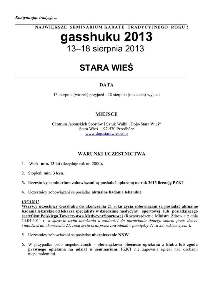 Kontynuując tradycję ... ________________________________________________________________________________ NAJWIĘKSZE SEMINARIUM KARATE TRADYCYJNEGO ROKU ! gasshuku 2013 13–18 sierpnia 2013 STARA WIEŚ ________________________________________________________________________________ DATA 13 sierpnia (wtorek) przyjazd - 18 sierpnia (niedziela) wyjazd MIEJSCE Centrum Japońskich Sportów i Sztuk Walki „Dojo-Stara Wieś“ Stara Wieś 1, 97-570 Przedbórz www.dojostarawies.com WARUNKI UCZESTNICTWA 1. Wiek: min. 13 lat (decyduje rok ur. 2000). 2. Stopień: min. 3 kyu. 3. Uczestnicy seminarium zobowiązani są posiadać opłaconą na rok 2013 licencję PZKT 4. Uczestnicy zobowiązani są posiadać aktualne badania lekarskie UWAGA! Wszyscy uczestnicy Gasshuku do ukończenia 21 roku życia zobowiązani są posiadać aktualne badania lekarskie od lekarza specjalisty w dziedzinie medycyny sportowej lub posiadającego certyfikat Polskiego Towarzystwa MedycynySportowej (Rozporządzenie Ministra Zdrowia z dnia 14.04.2011 r. w sprawie trybu orzekania o zdolności do uprawiania danego sportu przez dzieci i młodzież do ukończenia 21. roku życia oraz przez zawodników pomiędzy 21. a 23. rokiem życia ). 5. Uczestnicy zobowiązani są posiadać ubezpieczenie NNW. 6. W przypadku osób niepełnoletnich – obowiązkowa obecność opiekuna z klubu lub zgoda prawnego opiekuna na udział w seminarium. PZKT nie zapewnia opieki nad osobami niepełnoletnimi. INSTRUKTORZY Kontynuując tradycję, tegoroczne Gasshuku odbędzie się z udziałem wybitnych mistrzów karate tradycyjnego na świecie w tym członków Komisji Technicznej Międzynarodowej Federacji Karate Tradycyjnego (ITKF). Koordynacją Gasshuku 2013 zajmie się Sensei Włodzimierz Kwieciński 7 Dan ITKF - licencjonowany instruktor, sędzia i egzaminator klasy międzynarodowej ITKF, członek Komisji Technicznej ITKF, trener selekcjoner kadry narodowej PZKT. PROGRAM 1. Kurs ogólny: A. Kurs kata mistrzowskich. B. Specjalistyczny kurs kumite. 2. Egzaminy na stopnie mistrzowskie DAN. WYDARZENIE Nadzwyczajne Walne Zgromadzenie delegatów Międzynarodowej Federacji Karate Tradycyjnego (ITKF) 17 sierpnia 2013r. (sobota) OPŁATY 1. UDZIAŁ W GASSHUKU………..............…………….........………………..………..200 zł / os. Koszt 1 dnia …..........................................................................................................................60 zł / os. Uwaga! Wpłaty za udział będą przyjmowane na miejscu przy rejestracji (13 sierpnia – szczegóły poniżej). 2. EGZAMINY DAN (oddzielna rejestracja – szczegółowa informacja w załączeniu) REJESTRACJA I WPŁATY ZA UDZIAŁ W TRENINGACH 13 sierpnia (wtorek) 2013 r., w godz. 17.00-21.00 - w biurze Gasshuku Biuro Gasshuku: Recepcja Centrum Japońskich Sportów i Sztuk Walki „Dojo-Stara Wieś” (budynek stołówki) ZAKWATEROWANIE I WYŻYWIENIE W „DOJO-STARA WIEŚ“ OPCJA 1 – zakwaterowanie w domkach wraz z całodziennym wyżywieniem (pakiet 5-dniowy od wtorku 13 VIII do niedzieli 18 VIII) 620 zł/os. – cena specjalna dla członków PZKT z opłaconą licencją PZKT na rok 2013 960 zł/os. – cena dla osób pozostałych Cena obejmuje: 1) 5 noclegów – od wtorku (13 VIII) do niedzieli (18 VIII). 2) Pełne wyżywienie (3 posiłki dziennie) od wtorku (13 VIII) od kolacji do niedzieli (18 VIII) do śniadania. 3) Udział w Sayonara Party w sobotę (17 VIII) w ramach kolacji. Uwaga! Zabrania się udostępniania swojego pokoju do noclegu osobom, które nie wykupiły pakietu zakwaterowania. Uczestnicy Gasshuku, którzy będę nielegalnie udostępniać swój pokój osobom trzecim zostaną obciążeni dodatkowymi kosztami. Opłata dodatkowa za wykrycie takiego incydentu wynosi 300zł za osobę nielegalnie przebywającą w domku. ________________________________________________________ OPCJA 2 – Namiot - istnieje możliwość rozbicia namiotów w okolicznych gospodarstwach; poniżej podajemy tel. kontaktowe do osób, u których można rozbić namioty: • pani Lidia Kowalczyk - 692 589 980 • pan Jakub Grzegorczyk - 605 921 660 • pani Ewa Deryło - 665 265 896 • pani Barbara Rudnicka - 721 040 392 Prosimy o bezpośredni kontakt z w/w osobami w celu uzyskania informacji na temat kosztów oraz dokonania rezerwacji. PZKT nie pośredniczy w rezerwacji miejsc namiotowych. - Kamper - 50 do prądu zł/1 dzień - opłata za kamper z dostępem do sanitariatów i podłączeniem ____________________________________________________________ OPCJA 3 – wyżywienie w „Dojo-Stara Wieś” (bez zakwaterowania) Koszt wyżywienia: - Śniadanie - Obiad - Kolacja - Pakiet trzech posiłków: (śniadanie, obiad, kolacja) - Sayonara Party (17 VIII) 13zł 28 zł 22 zł 60 zł 38 zł 1. Osoby zainteresowane wykupieniem wyżywienia w ośrodku proszone są o dokonanie rezerwacji poprzez przesłanie wypełnionej karty zgłoszenia (w załączeniu) na adres: [email protected] najpóźniej do dnia 5 sierpnia 2013 r. 2. Płatność za wyżywienie gotówką w dniu przyjazdu u pani Joanny Zielińskiej. UWAGA! Wyżywienie będzie zagwarantowane jedynie dla osób, które dokonają rezerwacji w podanym terminie. Dla osób, które będą zainteresowane wykupieniem posiłku na miejscu – w zależności od dostępności produktów. 3. Wszelkie pytania dotyczące rezerwacji wyżywienia prosimy kierować do pani Joanny Zielińskiej (tel. kontaktowy 605 11 22 96). _____________________________________________________ REZERWACJA MIEJSC I WPŁATY ZA ZAKWATEROWANIE 1. Wstępne rezerwacje miejsc noclegowych będą przyjmowane do dnia 15 lipca br. Rezerwacje prosimy przesyłać do biura PZKT e-mailem na adres [email protected]. 2. Dostępność miejsc w ośrodku będzie potwierdzana przez biuro PZKT po 15 lipca. Miejsca będą przydzielane według kolejności otrzymanych rezerwacji. 3. Po otrzymaniu z PZKT potwierdzenia dostępności miejsc należy niezwłocznie dokonać opłaty na poniższe konto PZKT