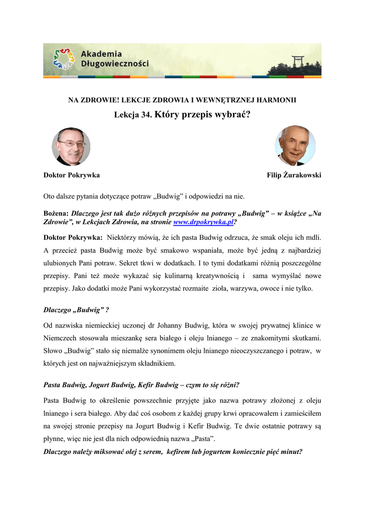 NA ZDROWIE! LEKCJE ZDROWIA I WEWNĘTRZNEJ HARMONII Lekcja 34. Który przepis wybrać? Doktor Pokrywka Filip Żurakowski Oto dalsze pytania dotyczące potraw „Budwig” i odpowiedzi na nie. Bożena: Dlaczego jest tak dużo różnych przepisów na potrawy „Budwig” – w książce „Na Zdrowie”, w Lekcjach Zdrowia, na stronie www.drpokrywka.pl? Doktor Pokrywka: Niektórzy mówią, że ich pasta Budwig odrzuca, że smak oleju ich mdli. A przecież pasta Budwig może być smakowo wspaniała, może być jedną z najbardziej ulubionych Pani potraw. Sekret tkwi w dodatkach. I to tymi dodatkami różnią poszczególne przepisy. Pani też może wykazać się kulinarną kreatywnością i sama wymyślać nowe przepisy. Jako dodatki może Pani wykorzystać rozmaite zioła, warzywa, owoce i nie tylko. Dlaczego „Budwig” ? Od nazwiska niemieckiej uczonej dr Johanny Budwig, która w swojej prywatnej klinice w Niemczech stosowała mieszankę sera białego i oleju lnianego – ze znakomitymi skutkami. Słowo „Budwig” stało się niemalże synonimem oleju lnianego nieoczyszczanego i potraw, w których jest on najważniejszym składnikiem. Pasta Budwig, Jogurt Budwig, Kefir Budwig – czym to się różni? Pasta Budwig to określenie powszechnie przyjęte jako nazwa potrawy złożonej z oleju lnianego i sera białego. Aby dać coś osobom z każdej grupy krwi opracowałem i zamieściłem na swojej stronie przepisy na Jogurt Budwig i Kefir Budwig. Te dwie ostatnie potrawy są płynne, więc nie jest dla nich odpowiednią nazwa „Pasta”. Dlaczego należy miksować olej z serem, kefirem lub jogurtem koniecznie pięć minut? W tym tkwi tajemnica przyswajalności oleju lnianego. Jest on dobrze przyswajalny tylko w postaci emulsji – a taka emulsja powstaje podczas jego miksowania przez pięć minut z serem, kefirem lub jogurtem. Pani Bożeno, proszę zwrócić uwagę na swoje urządzenie miksujące – czy się nie rozgrzewa nadmiernie podczas pięciominutowego miksowania. Przegrzanie oleju lnianego spowodowałoby utratę jego cennych właściwości. (W termomiksie poleca się obroty 5 przez 5 minut – wtedy przegrzewanie nie następuje). Jaki nośnik dla oleju lnianego powinny wybierać osoby mające poszczególne grupy krwi? Przeanalizujmy trzy możliwe nośniki: ser biały, jogurt i kefir. Dla osoby z grupą krwi A: żaden z tych trzech nośników nie należy do produktów wskazanych; neutralny jest jogurt, a zatem taka osoba jako nośnik może zastosować jogurt. Dla osoby z grupą krwi B: do produktów wskazanych należy jogurt i kefir. Jako nośnik dla oleju lnianego osoba ta może wybrać jeden z tych dwóch produktów. Dla osoby z grupą krwi AB: do produktów wskazanych należy jogurt i kefir, do neutralnych ser biały. Jako nośnik może być użyty ser, kefir lub jogurt. Dla osoby z grupą krwi 0: żaden z wymienionych trzech produktów nie należy do wskazanych. Neutralny jest jogurt. Jako nośnik może być użyty jogurt. I pytanie najważniejsze – jaki olej lniany wybrać? Jest tego tyle… można się pogubić. Cenne właściwości lecznicze oleju lnianego wiążą się z tym, że zawiera on kwasy Omega 3, niezbędne do budowy komórek. Aby olej lniany zawierał odpowiednią ilość tych kwasów, musi spełniać dwa warunki: być olejem nieoczyszczanym i być olejem tłoczonym na zimno. Jeśli podczas tłoczenia następuje przegrzewanie oleju wskutek rozgrzewania się prasy – to nie jest to już olej naprawdę tłoczony na zimno. A zatem nie wszystkie oleje nazywane tłoczonymi na zimno rzeczywiście nimi są. W niektórych przepisach występuje olej lniany, a w innych olej lniany red-ox. Jakie to ma znaczenie? Olej lniany red-ox to olej lniany nasycony wodorem. A więc zawiera on dwa składniki niezwykle cenne dla naszego zdrowia: kwasy Omega-3 i wodór. Dwa ogrody - Fot. Szymon Kliszewski Coś dla ducha Zapobieganie przewlekłemu zmęczeniu Spektakularnym przykładem odwlekania jest odwlekanie porządków, powodujące bałagan i chaos. Gdy posprzątasz i uporządkujesz rzeczy w garażu, w biurku, w szafie, w teczce, w komputerze, w poczcie mailowej – poczujesz przypływ energii. Nie masz sił? To odwlekanie odbiera ci siły, bo worek odwleczonych spraw niesiesz wciąż na grzbiecie, gdziekolwiek się udasz. Siły odbiera ci też zniechęcenie. Zniechęcenie to ludzka pycha, liczenie tylko na siebie. Kiedy człowiek liczy tylko na siebie, Pan Bóg się wycofuje. Gdy uznasz, ze zależysz od Boga, Pan Bóg powraca. Złota myśl Filipa Największym darem niebios jest spokój wewnętrzny. Książkę Doktora Pokrywki i Filipa Żurakowskiego Na zdrowie! Jak osiągnąć harmonię ciała, ducha i umysłu można kupić w salonach Empiku w całej Polsce lub na stronie www.nazdrowie.drpokrywka.pl Przeczytaj recenzje o naszej książce na stronie wydawnictwa Sensus http://sensus.pl/ksiazki/na-zdrowie-jak-osiagnac-harmonie-ciala-ducha-iumyslu-dr-jan-pokrywka-filip-zurakowski,jakosi.htm