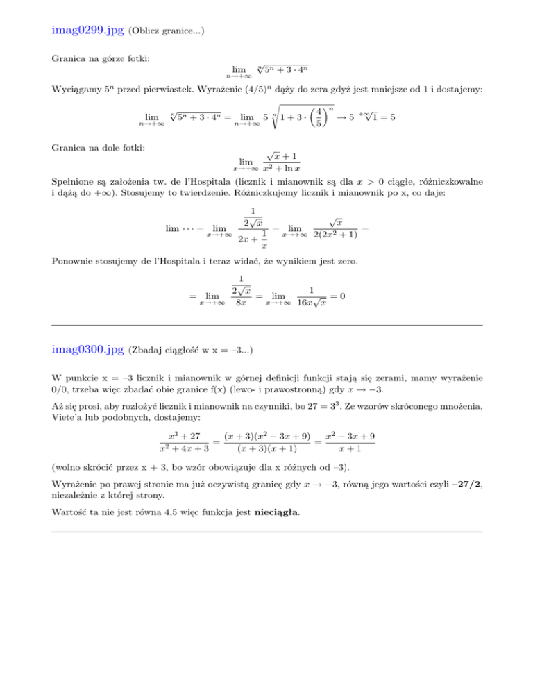 imag0299.jpg (Oblicz granice...) Granica na górze fotki: lim √ n n→+∞ 5n + 3 · 4n Wyciągamy 5n przed pierwiastek. Wyrażenie (4/5)n dąży do zera gdyż jest mniejsze od 1 i dostajemy: √ n lim n→+∞ s 5n +3· 4n = lim 5 n n→+∞ Granica na dole fotki: √ lim x→+∞ x2 n 1+3· 4 5 →5 √ +∞ 1=5 x+1 + ln x Spełnione są założenia tw. de l’Hospitala (licznik i mianownik są dla x > 0 ciągłe, różniczkowalne i dążą do +∞). Stosujemy to twierdzenie. Różniczkujemy licznik i mianownik po x, co daje: lim · · · = lim x→+∞ 1 √ √ x 2 x = lim = 2 1 x→+∞ 2(2x + 1) 2x + x Ponownie stosujemy de l’Hospitala i teraz widać, że wynikiem jest zero. 1 √ = lim x→+∞ imag0300.jpg 1 2 x √ =0 = lim x→+∞ 8x 16x x (Zbadaj ciągłość w x = –3...) W punkcie x = –3 licznik i mianownik w górnej definicji funkcji stają się zerami, mamy wyrażenie 0/0, trzeba więc zbadać obie granice f(x) (lewo- i prawostronną) gdy x → −3. Aż się prosi, aby rozłożyć licznik i mianownik na czynniki, bo 27 = 33 . Ze wzorów skróconego mnożenia, Viete’a lub podobnych, dostajemy: x3 + 27 (x + 3)(x2 − 3x + 9) x2 − 3x + 9 = = + 4x + 3 (x + 3)(x + 1) x+1 x2 (wolno skrócić przez x + 3, bo wzór obowiązuje dla x różnych od –3). Wyrażenie po prawej stronie ma już oczywistą granicę gdy x → −3, równą jego wartości czyli –27/2, niezależnie z której strony. Wartość ta nie jest równa 4,5 więc funkcja jest nieciągła.