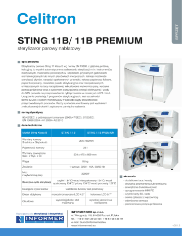 Celitron STING 11B/ 11B PREMIUM sterylizaror parowy nablatowy opis produktu Sterylizatory parowe Sting 11 klasy B wg normy EN 13060, z głęboką próżnią frakcyjną, to w pełni automatyczne urządzenia do sterylizacji m.in. instrumentów medycznych, materiałów porowatych w szpitalach, prywatnych gabinetach stomatologicznych lub innych placówkach medycznych. Istnieje możliwość sterylizacji płynów, narzędzi opakowanych w torebki, rękawy papierowo foliowe, papier krepowany, niewielkie puszki sterylizacyjne oraz nieopakowanych, umieszczonych na tacy narzędziowej. Wbudowana wytwornica pary, wydajna pompa próżniowa wraz z systemem oszczędzania energii elektrycznej i wody do 30% pozwala na przeprowadzenie cykli procesów w czasie już od 21 minut. Urządzenia posiadają 7 programów sterylizacyjnych, test szczelności Bowie & Dick i system monitorujący w sposób ciągły prawidłowość przeprowadzanych procesów. Każdy cykl udokumentowany jest wydrukiem z wbudowanej drukarki i zapisany w pamięci urządzenia. normy/dyrektywy 93/42/EEC, z późniejszymi zmianami (2007/47/EEC); 97/23/EC; EN 13060:2004+A1:2009+A2:2010 dane techniczne Model Sting Klasa B STING 11 B Wymiary komory Średnica x Głębokość STING 11 B PREMIUM 261x 492mm Pojemność komory 25 l Wymiary zewnętrzne Szer. x Wys. x Gł. 534 x 475 x 609 mm Waga 70 kg 1 fazowe, 220V - 16A, 50/60 Hz Zasilanie Moc z wytwornicą pary 3000W akcesoria szybki 134°C/ wsad nieopakowany 134°C/ wsad Dostępne cykle sterylizacji opakowany 134°C/ priony 134°C/ wsad porowaty 121°C Dostępne cykle testów Ekran dotykowy Obudowa test Bowie & Dick/ test próżniowy monochromatyczny LCD 4.5’’ kolorowy LCD 5.7’’ wysokiej jakości stal malowana wysokiej jakości stal nierdzewna Rozwiązania dla sterylizacji i dezynfekcji - dodatkowe tace, kasety - drukarka atramentowa lub termiczna - zewnętrzna drukarka etykiet - oprogramowanie HMI PC - czytnik karty SD, karta - cewka (płaszcz z wężownicą) - odwrócona osmoza - pierścieniowa pompa próżniowa INFORMER MED sp. z o.o. ul. Winogrady 118, 61-626 Poznań, Polska tel.: +48 61 664 38 00, fax: +48 61 664 38 19 e-mail: [email protected] www.informermed.eu v001.2