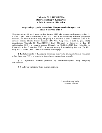 Uchwała Nr LIII/517/2014 Rady Miejskiej w Karczewie z dnia 4 czerwca 2014 roku w sprawie przyjęcia stanowiska dla upamiętnienia wydarzeń z dnia 4 czerwca 1989 r. Na podstawie art. 18 ust. 1 ustawy z dnia 8 marca 1990 roku o samorządzie gminnym (Dz. U. z 2013 r., poz. 594 ze zmianami) w zw. z § 51 ust. 1 Statutu Gminy Karczew przyjętego Uchwałą Nr XLIII/404/2013 Rady Miejskiej w Karczewie z dnia 3 września 2013 r. w sprawie zmiany Statutu Gminy Karczew (Dz. Urz. Woj. Maz. z 2013 r., poz. 9825) zmienionego Uchwałą Nr XLV/424/2013 Rady Miejskiej w Karczewie z dnia 29 października 2013 r. w sprawie zmiany Uchwały Nr XLIII/404/2013 Rady Miejskiej w Karczewie z dnia 3 września 2013 r. w sprawie zmiany Statutu Gminy Karczew (Dz. Urz. Woj. Maz. z 2013 r., poz. 11966) uchwala się, co następuje: § 1. Rada Miejska w Karczewie przyjmuje stanowisko dla upamiętnienia wydarzeń z dnia 4 czerwca 1989 r. w brzmieniu stanowiącym załącznik do uchwały. § 2. Wykonanie uchwały powierza się Przewodniczącemu Rady Miejskiej w Karczewie. § 3. Uchwała wchodzi w życie z dniem podjęcia. Przewodniczący Rady Tadeusz Marton UZASADNIENIE W celu upamiętnienia historycznych wydarzeń, które doprowadziły do pierwszych wolnych wyborów w dniu 4 czerwca 1989r. Rada Miejska w Karczewie podejmuje stosowne stanowisko, wyrażając tym samym swój szacunek i podziękowanie wszystkim, którzy działali na rzecz odzyskania wolności, suwerenności, poczucia godności bycia Polakiem. Przewodniczący Rady Tadeusz Marton Załącznik do Uchwały Nr LIII/517/2014 Rady Miejskiej w Karczewie z dnia 4 czerwca 2014 roku STANOWISKO Rady Miejskiej w Karczewie dla upamiętnienia wydarzeń z dnia 4 czerwca 1989 roku Rada Miejska w Karczewie dla upamiętnienia historycznych wydarzeń, które swój początek wiążą z datą 4 czerwca 1989 roku, wyraża głęboki szacunek i podziękowanie wszystkim, którzy niejednokrotnie z narażeniem zdrowia i życia działali na rzecz odzyskania wolności, suwerenności, poczucia godności bycia Polakiem. 4 czerwca 1989 roku to tryumf solidarności i odwagi nad zwątpieniem i politycznym osamotnieniem, to początek udanej drogi ku jedności Europy. Byliśmy wtedy razem. Życie obywatelskie i patriotyczne w Polsce nie ustało. Polacy wspierali się. Wspólnie opłakiwali ofiary masakry w kopalni „Wujek”, razem szli za trumnami księdza Jerzego Popiełuszki i Grzegorza Przemyka. W postulatach sierpniowych wyrażaliśmy potrzebę przywrócenia godności ludzkiej pracy – potrzebę, którą czuły miliony Polaków. 4 czerwca 1989 roku razem zaufaliśmy pragnieniu wolności. Wybory 4 czerwca 1989 roku, choć tylko częściowo demokratyczne, były naprawdę wolne: niesfałszowane, nieokupione represjami. Ich wynik ujawnił realny układ sił w społeczeństwie. Doprowadził do głębokich zmian, w tym przywrócenia autentycznego samorządu lokalnego, wprowadzenia demokratycznej ordynacji wyborczej, nadania miastom i gminom osobowości prawnej i przekazania im na wyłączną własność części majątku państwowego, utworzenia własnej lokalnej administracji, która już nie musiała być całkowicie podporządkowana władzom centralnym. Zwyciężyła solidarna decyzja milionów Polaków. Dlatego też w dniu 4 czerwca 2014 r. – w 25 rocznicę pierwszych wolnych wyborów wyrażamy ogromną wdzięczność twórcom, założycielom i działaczom Komitetu Obywatelskiego „Solidarność” w Karczewie. Składając hołd tym wszystkim, którzy dali początek samorządności naszej Małej Ojczyzny zapewniamy, że poprzez nasze działania będziemy pamiętać i pielęgnować wolność odzyskaną w dniu 4 czerwca 1989 roku. Przewodniczący Rady Tadeusz Marton Karczew, 4 czerwca 2014 roku