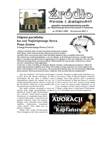 gazetka rzymskokatolickiej parafii pw. Najświętszego Serca Pana Jezusa w Raciborzu nr 25/2011 (385) 26 czerwca 2011 r. Odpust parafialny ku czci Najświętszego Serca Pana Jezusa Z księgi Powtórzonego Prawa (7,6-11) „MojŜesz mówił do ludu: Ty jesteś narodem poświęconym twojemu Panu Bogu. Ciebie wybrał twój Pan Bóg, byś spośród wszystkich narodów, które są na powierzchni ziemi, był ludem będącym Jego szczególną własnością. Pan wybrał was i znalazł upodobanie w was nie dlatego, Ŝe liczebnie przewyŜszacie wszystkie narody, gdyŜ ze wszystkich narodów jesteście najmniejszym, lecz dlatego, Ŝe Pan was umiłował. Chce On wam dochować przysięgi danej waszym przodkom. Wyprowadził was mocną ręką i wybawił was z domu niewoli z ręki faraona, króla egipskiego. Uznaj więc, Ŝe Pan, twój Bóg, jest Bogiem, Bogiem wiernym, zachowującym przymierze i miłość do tysięcznego pokolenia względem tych, którzy Go kochają i strzegą Jego praw, lecz który odpłaca kaŜdemu z nienawidzących Go, niszcząc go. Nie pozostawia bezkarnie tego, kto Go nienawidzi, odpłacając jemu samemu. StrzeŜ przeto poleceń, praw i nakazów, które ja tobie polecam dzisiaj pełnić”. „Pan nas umiłował”. Jak bardzo pocieszające to były słowa dla narodu wybranego. Są takŜe pocieszające dla nas, gdyŜ w Ŝadnym, nawet najmniejszym stopniu nie zmieniły się one. Zawierają niezmienną prawdę. Słowa te winny być dla nas bliskie, zwłaszcza, Ŝe jako parafia jesteśmy poświęceni Jezusowemu Sercu. Aby naród wybrany zrozumiał te słowa konieczne było ciągłe przypominanie wydarzeń minionych, kiedy to Bóg wyprowadzał ich z niewoli i bronił przed wrogami. Prawdą jest, Ŝe rozpamiętywanie chwil, w których Bóg działa w sposób dla nas bardziej widoczny moŜe być pomocą. Dlatego warto chociaŜby przez krótką modlitwę dziękczynną wspominać „dobre chwile”, które udało nam się przeŜyć z Bogiem. Jednak autor księgi Powtórzonego Prawa domaga się nie tylko uznania tej prawdy. Domaga się odpowiedzi udzielonej swoim Ŝyciem. Uznaj, Ŝe Pan jest Bogiem wiernym i dlatego strzeŜ Jego poleceń, praw i przykazań. Jeśli jest prawdą, Ŝe Bóg jest obecny w naszym Ŝyciu, troszczy się o nas i roztacza swoją opiekę (co wcale nie oznacza braku trudności), to czy nie wymaga to od nas naszej wierności i miłości Boga z całego serca i z całej duszy? Niech pomocą w tym będzie nam uroczystość odpustowa. 2 Źródło - gazetka Poniedziałek – 27 czerwca 2011 Mt 8,18-22 630 Za †† Jana Olszynę, Ŝonę Annę i rodziców z obu stron Całodzienna Adoracja Najświętszego Sakramentu (ofiarowana Ojcu Świętemu) 1730 NaboŜeństwo czerwcowe 1800 1. Z okazji 30. rocznicy ślubu Jolanty i Bogdana z podziękowaniem za otrzymane łaski, z prośbą o BoŜe błogosławieństwo i zdrowie w całej rodzinie 2. W intencji Heleny i Ludwika Czysz z okazji 35. rocznicy ślubu, z podziękowaniem za otrzymane łaski, z prośbą o BoŜe błogosławieństwo i zdrowie w całej rodzinie oraz w intencji wnuczek Oliwii i Hani z okazji urodzin Wtorek – 28 czerwca 2011 – św. Ireneusza, bpa i męcz. Mt 8,23-27 630 W intencji ks. Ireneusza w dniu imienin o błogosławieństwo w pracy duszpasterskiej (od Rycerstwa Niepokalanej) Całodzienna Adoracja Najświętszego Sakramentu (ofiarowana Ojcu Świętemu) 1730 NaboŜeństwo czerwcowe 1800 Za †† męŜa Stefana Martyniaka, rodziców i rodzeństwo z obu stron Środa – 29 czerwca 2011 – św. Piotra i Pawła, Apostołów Mt 16,13-19 630 Do BoŜej Opatrzności w intencji Haliny z okazji imienin i urodzin, z podziękowaniem za otrzymane łaski, z prośbą o BoŜe błogosławieństwo i zdrowie w rodzinie Całodzienna Adoracja Najświętszego Sakramentu (ofiarowana Ojcu Świętemu) 1730 NaboŜeństwo czerwcowe 1800 Za † ojca Pawła Świętka Czwartek – 30 czerwca 2011 Mt 9,1-8 630 Za † Kazimierza Kowalczykowskiego w 18. rocznicę śmierci Całodzienna Adoracja Najświętszego Sakramentu (ofiarowana Ojcu Świętemu) NaboŜeństwo czerwcowe 1730 1800 Za zmarłych (zbiorowa): Za †† Maksymiliana i Marię Laska, dziadków, rodzeństwo i pokrewieństwo z obu stron, dusze w czyśćcu cierpiące, za †† rodziców Marię i Pawła, dziadków i pokrewieństwo, za † męŜa i ojca Mariana Cieszyńskiego w 9. rocznicę śmierci i 55. rocznicę urodzin, za † Mariana Robótkę (w 30. dzień po śmierci), za † ElŜbietę Czyszczon (od sąsiadów), za † babcię Annę Gagusz w 18. rocznicę śmierci, za † Jacka Chudygę (w 30. dzień po śmierci), za †† Jana Hanćkowiaka, dwóch braci, dwie siostry zakonne i rodziców, za † Joachima Klimę (w 30. dzień po śmierci), za † Bogdana Baranieckiego (w 30. dzień po śmierci), za † Jadwigę Kańtoch /w 30. dzień po śmierci/, za †† Jana Kłapkowskiego, rodziców Eugenię i Tomasza, dwóch braci, za †† Jadwigę Scheroki, męŜa, syna i córkę oraz za całe †† pokrewieństwo z obu stron, za † Agnieszkę Lenart w 4. rocznicę śmierci, za † Piotra Cisowskiego w 2. rocznicę śmierci I Piątek miesiąca – 1 lipca 2011 – Najświętszego Serca Pana Jezusa Pwt 7,6-11;1 J 4,7-16; Mt 11,25-30 Za †† Halinę Górską, rodziców z obu stron Genowefę, Jana, Paulinę, Bronisława, Bogu630 sławę, Eugeniusza, Karolinę, Karola, Franciszka, Adolfa, Zdzisława, Genowefę oraz za dusze w czyśćcu cierpiące 900 W intencji Parafian Całodzienna Adoracja Najświętszego Sakramentu (ofiarowana Ojcu Świętemu) 1730 NaboŜeństwo ku czci Najświętszego Serca Pana Jezusa W intencji czcicieli Najświętszego Serca Pana Jezusa 1800 I Sobota miesiąca – 2 lipca 2011 – Niepokalanego Serca NMP Łk 2,41-51 630 Za wstawiennictwem Matki BoŜej RóŜańcowej w intencji członków śywego RóŜańca 1200 Ślub: Piotr Adamczak – Marta Burban 1300 Ślub: Agnieszka Frankowicz – Sebastian Mozer 1600 Adoracja Najświętszego Sakramentu 1730 Nieszpory Maryjne 