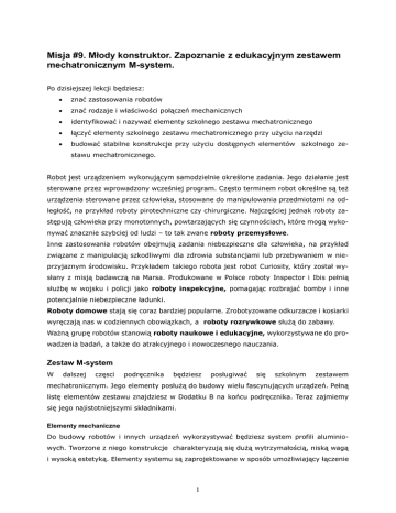 Misja #9. Młody konstruktor. Zapoznanie z edukacyjnym zestawem mechatronicznym M-system. Po dzisiejszej lekcji będziesz: znać zastosowania robotów znać rodzaje i właściwości połączeń mechanicznych identyfikować i nazywać elementy szkolnego zestawu mechatronicznego łączyć elementy szkolnego zestawu mechatronicznego przy użyciu narzędzi budować stabilne konstrukcje przy użyciu dostępnych elementów szkolnego ze- stawu mechatronicznego. Robot jest urządzeniem wykonującym samodzielnie określone zadania. Jego działanie jest sterowane przez wprowadzony wcześniej program. Często terminem robot określne są też urządzenia sterowane przez człowieka, stosowane do manipulowania przedmiotami na odległość, na przykład roboty pirotechniczne czy chirurgiczne. Najczęściej jednak roboty zastępują człowieka przy monotonnych, powtarzających się czynnościach, które mogą wykonywać znacznie szybciej od ludzi – to tak zwane roboty przemysłowe. Inne zastosowania robotów obejmują zadania niebezpieczne dla człowieka, na przykład związane z manipulacją szkodliwymi dla zdrowia substancjami lub przebywaniem w nieprzyjaznym środowisku. Przykładem takiego robota jest robot Curiosity, który został wysłany z misją badawczą na Marsa. Produkowane w Polsce roboty Inspector i Ibis pełnią służbę w wojsku i policji jako roboty inspekcyjne, pomagając rozbrajać bomby i inne potencjalnie niebezpieczne ładunki. Roboty domowe stają się coraz bardziej popularne. Zrobotyzowane odkurzacze i kosiarki wyręczają nas w codziennych obowiązkach, a roboty rozrywkowe służą do zabawy. Ważną grupę robotów stanowią roboty naukowe i edukacyjne, wykorzystywane do prowadzenia badań, a także do atrakcyjnego i nowoczesnego nauczania. Zestaw M-system W dalszej częsci podręcznika będziesz posługiwać się szkolnym zestawem mechatronicznym. Jego elementy posłużą do budowy wielu fascynujących urządzeń. Pełną listę elementów zestawu znajdziesz w Dodatku B na końcu podręcznika. Teraz zajmiemy się jego najistotniejszymi składnikami. Elementy mechaniczne Do budowy robotów i innych urządzeń wykorzystywać będziesz system profili aluminiowych. Tworzone z niego konstrukcje charakteryzują się dużą wytrzymałością, niską wagą i wysoką estetyką. Elementy systemu są zaprojektowane w sposób umożliwiający łączenie 1 ich na wiele różnych sposobów, dających niemal nieograniczone możliwości konstrukcyjne. Poszczególne części maszyn (robotów) łączone są ze sobą w różny sposób, w zależności od funkcji, którą mają spełniać. Najważniejsze rodzaje połączeń to: połączenia rozłączne - można je wielokrotnie montować i demontować wykorzystując te same elementy tak, aby za każdym razem spełniały swoje zadanie. Przykładem takiego połączenia jest skręcanie elementów śrubami. Połączenia nierozłączne – elementów łączonych w ten sposób nie można rozdzielić bez zniszczenia elementów wiążących, przykładem takiego połączenia jest lutowanie, spawanie lub nitowanie. Połączenia spoczynkowe - w takim połączeniu wzajemny ruch elementów jest niemożliwy. Połączenia ruchome – umożliwiają wzajemny ruch elementów, np. koło w rowerze. Rysunek 1Sposoby łączenia elementów zestawu M-system. Rysunek 2 - kółko Ćwiczenie 1 1. Zapoznaj się z listą elementów szkolnego zestawu mechatronicznego. 2. Wykonaj każde z połączeń przedstawionych na rysunku 1. 2 Zwróć uwagę, że w skład zestawu wchodzi kilka różnych rodzajów śrub. Każdy z nich posiada oznaczenie, umożliwiające odczytanie średnicy i długości śruby. Na przykład, śruba M4x22 ma średnicę czterech milimetrów i długość 22mm. Montując urządzenia według instrukcji, używaj zawsze śrub odpowiedniej długości. Jeśli planujesz połączyć dwa elementy spoczynkowo (tak aby nie ruszały się względem siebie), pamiętaj, że musisz użyć co najmniej dwóch elementów łączących (śrub lub kołków). Inaczej Twoje połączenie ze spoczynkowego zmieni się w ruchome z osią obrotu w miejscu połączenia. Rysunek połączenia na dwie śruby Ćwiczenie 2 Wykorzystując dowolne elementy zestawu zbuduj jak najwyższą konstrukcję zdolną do utrzymania przez co najmniej 10 sekund plastikowej butelki o objętości 0,5l wypełnionej dowolnym napojem. W czasie pracy i po jej skończeniu utrzymuj porządek na swoim stanowisku. Do przechowywania drobnych elementów takich jak śruby, nakrętki, kołki, osie, łożyska i piasty stosuj pudełko z przegródkami. Ułatwi Ci to szybkie wyszukiwanie potrzebnych części. Elementy elektroniczne Zestaw M-system składa się także z elementów elektronicznych, takich jak: Sterownik programowalny Silniki z enkoderami (czujnikami obrotu) Czujnik odległości Czujniki dotyku Czujnik światła Pojemnik na akumulatory AA Kable o długościach 20, 35 i 50 cm. Poszczególne elementy będziemy omawiać w czasie następnych misji, dziś zapoznasz się ze sterownikiem programowalnym. Jest on centralnym elementem zestawu, będziesz wykorzystywać go w każdym projekcie, podłączając do niego silniki i czujniki. Sterownik jest wyposażony w moduł bluetooth, który pozwala na komunikację z komputerem. Dzięki temu program napisany i uruchomiony w Prophio, może sterować działaniem robota i odczyty- 3 wać dane z jego czujników. Na poniższych rysunkach znajdziesz opis najważniejszych elementów sterownika. Rysunek 2Sterownik programowalny zestawu M-system widziany z góry. 4 Rysunek 3Sterownik programowalny zestawu M-system widziany z dołu. Ćwiczenie 3 1. Włóż sześć naładowanych akumulatorów AA do pojemnika. Podłącz go do sterownika programowalnego i włącz sterownik włącznikiem. Powinna zaświecić się dioda PWR umieszczona w pobliżu włącznika zasilania. 2. Uruchom program Prophio. Z menu „Robot” wybierz „Odśwież listę portów”. Po chwili w menu „robot” pojawi