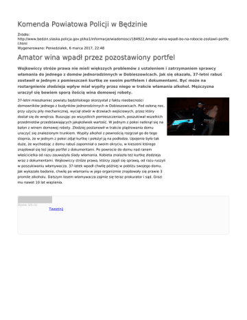 Komenda Powiatowa Policji w Będzinie Źródło: http://www.bedzin.slaska.policja.gov.pl/ka1/informacje/wiadomosci/184922,Amator-wina-wpadl-bo-na-robocie-zostawil-portfe l.html Wygenerowano: Poniedziałek, 6 marca 2017, 22:48 Amator wina wpadł przez pozostawiony portfel Wojkowiccy stróże prawa nie mieli większych problemów z ustaleniem i zatrzymaniem sprawcy włamania do jednego z domów jednorodzinnych w Dobieszowicach. Jak się okazało, 37-letni rabuś zostawił w jednym z pomieszczeń kurtkę ze swoim portfelem i dokumentami. Być może na roztargnienie złodzieja wpływ miał wypity przez niego w trakcie włamania alkohol. Mężczyzna uraczył się bowiem sporą ilością wina domowej roboty. 37-letni mieszkaniec powiatu będzińskiego skorzystał z faktu nieobecności domowników jednego z budynków jednorodzinnych w Dobieszowicach. Pod osłoną noc, przy użyciu piły mechanicznej, wyciął otwór w drzwiach wejściowych, przez który dostał się do wnętrza. Buszując po wszystkich pomieszczeniach, poszukiwał wszelkich przedmiotów przedstawiających jakąkolwiek wartość. W jednym z pokoi natknął się na balon z winem domowej roboty. Złodziej postanowił w trakcie plądrowania domu uraczyć się znalezionym trunkiem. Wypity alkohol z pewnością rozgrzał go do tego stopnia, że w jednym z pokoi zdjął kurtkę i położył ją na podłodze. Upojenie było tak duże, że wychodząc z domu rabuś zapomniał o swoim okryciu, w kieszeni którego znajdował się też jego portfel z dokumentami. Po powrocie do domu nad ranem właścicielka od razu zauważyła ślady włamania. Kobieta znalazła też kurtkę złodzieja wraz z dokumentami. Wojkowiccy stróże prawa, którzy zajęli się sprawą, od razu ruszyli w poszukiwaniu włamywacza. 37-latek wpadł chwilę później w pobliżu swojego domu. Jak wykazało badanie, chwilę po włamaniu w jego organizmie znajdowały się prawie 3 promile alkoholu. Dalszym losem włamywacza zajmie się teraz prokurator i sąd. Grozi mu nawet 10 lat więzienia. Ocena: 5/5 (1) Tweetnij